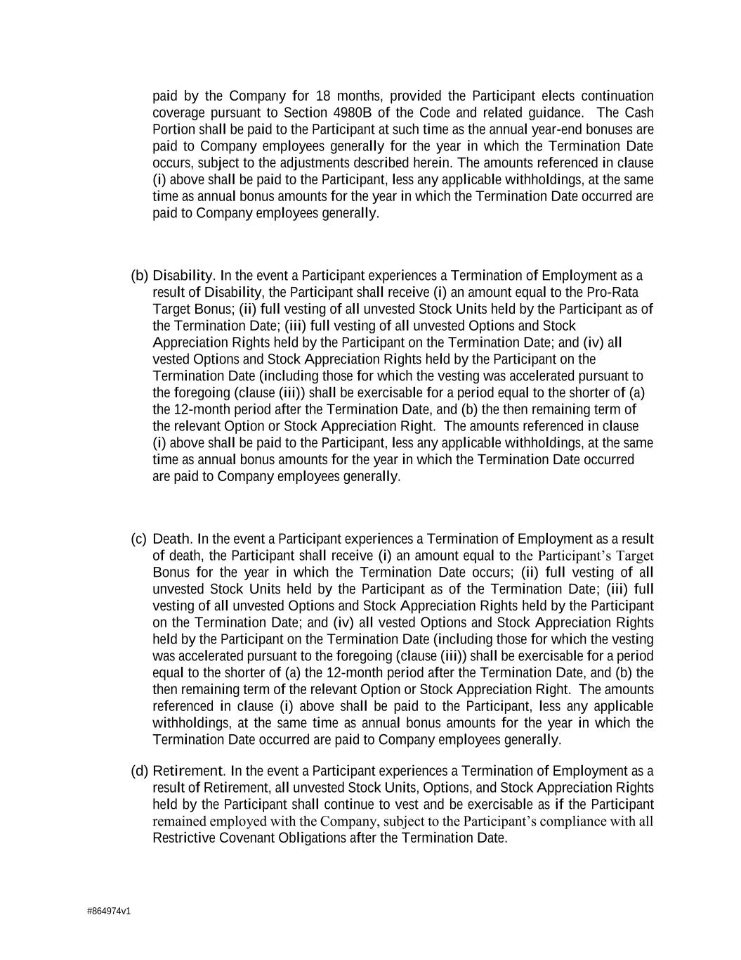 DB1/ 144570925.9 15 #852344v7 Participant may exercise such rights. Any such successor must furnish proof satisfactory to the Company of his or her right to receive the Grant under the Participant’s will or under the applicable laws of descent and distribution. (b) Transfer of Nonqualified Stock Options to or for Family Members. Notwithstanding the foregoing, the Committee may provide, in a Grant Agreement, that a Participant may transfer Nonqualified Stock Options to family members, or one or more trusts or other entities for the benefit of or owned by family members, consistent with applicable securities laws, according to such terms as the Committee may determine; provided that the Participant receives no consideration for the transfer of a Nonqualified Stock Option and the transferred Nonqualified Stock Option shall continue to be subject to the same terms and conditions as were applicable to the Nonqualified Stock Option immediately before the transfer. 16. Consequences of a Change of Control (a) Assumption of Outstanding Awards. Upon a Change of Control where the Company is not the surviving corporation (or survives only as a subsidiary of another corporation), unless the Committee determines otherwise, all outstanding Grants that are not exercised, unvested or paid at the time of the Change of Control shall be continued, assumed by, or replaced with grants that have comparable terms by, the surviving corporation (or a parent or subsidiary of the surviving corporation). After a Change of Control, references to the “Company” as they relate to employment matters shall include the successor employer in the transaction, subject to applicable law. For purposes of the foregoing, a Grant under the Plan shall not be treated as continued, assumed, or replaced on comparable terms unless it is continued, assumed, or replaced with substantially equivalent terms, including, without limitation, the same vesting terms. (b) Vesting Upon Certain Termination Events. Unless otherwise set forth in a Grant Agreement, with respect to Grants, if (i) a Change of Control occurs and (ii) during the period commencing on the date of the Change of Control and ending on the date that is 24 months following the Change of Control, the Participant’s employment or service with the Employer is terminated (1) by the Employer without Cause, (2) by the Participant for Good Reason, (3) by the Employer on account of the Participant’s Disability or (4) on account of the Participant’s death, then all outstanding Options and SARs shall vest and become exercisable and all other outstanding Grants shall vest and all restrictions pertaining to such other Grants shall lapse and have no further effect. For the purposes of this Section 16(b) any Grant that vests based on the attainment of performance goals shall vest assuming that the performance goals were attained at the target level of performance, or at such greater level of performance as the Committee may determine. To the extent Options and SARs vest and become exercisable in accordance with this Section 16(b) they will remain exercisable for 12 months following the termination of the Participant’s employment or service, provided that, in no event shall any Option or SAR be exercisable after the expiration of its term. (c) Other Alternatives. In the event of a Change of Control, if any outstanding Grants are not assumed by, or replaced with grants that have comparable terms by, the surviving corporation (or a parent or subsidiary of the surviving corporation), the Committee may (but is not obligated to) make adjustments to the terms and conditions of outstanding Grants, including,
