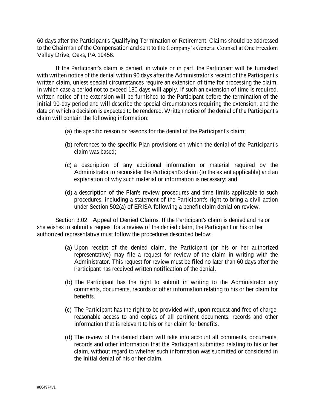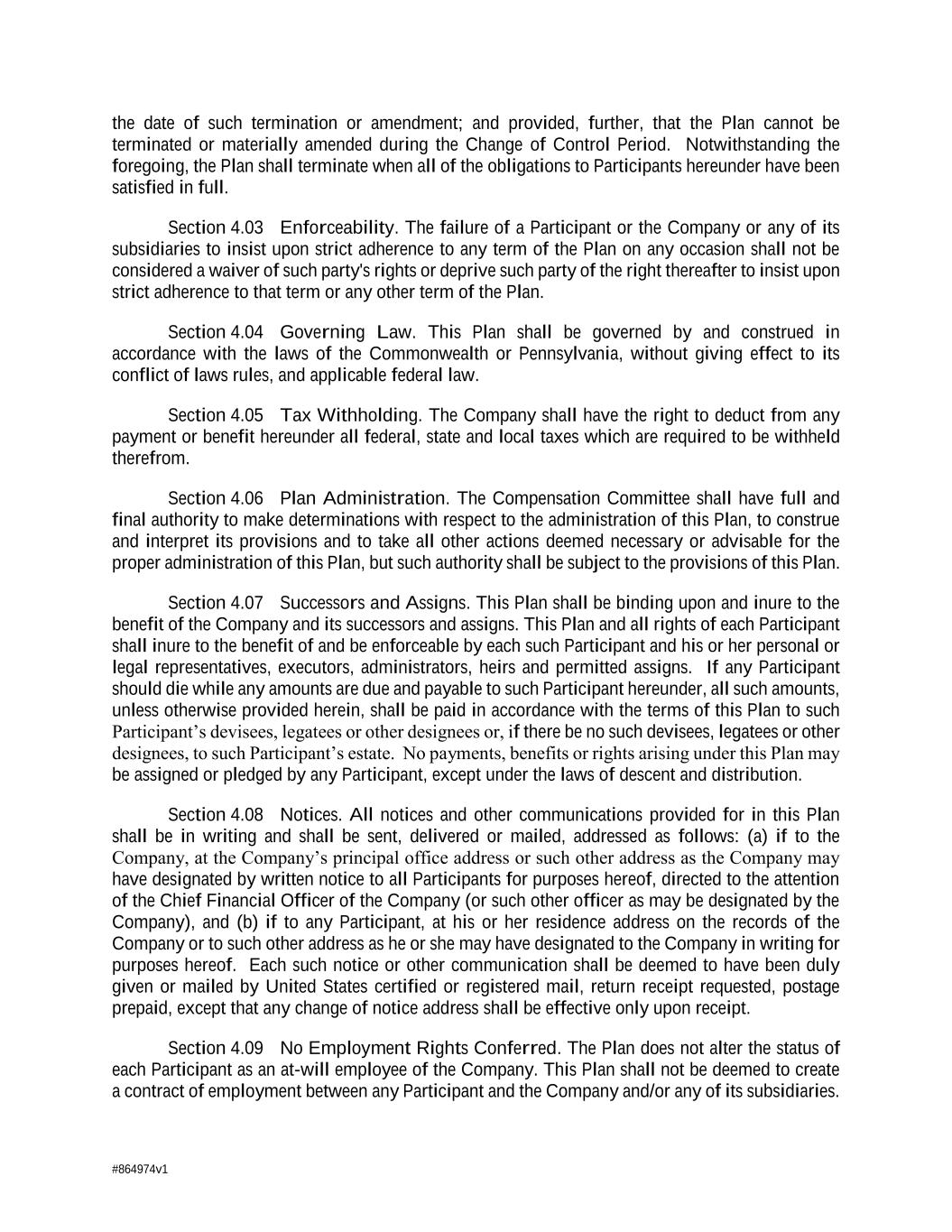 DB1/ 144570925.9 20 #852344v7 (j) Governing Law. The validity, construction, interpretation and effect of the Plan and Grant Agreements issued under the Plan shall be governed and construed by and determined in accordance with the laws of the Commonwealth of Pennsylvania, without giving effect to the conflict of laws provisions thereof.