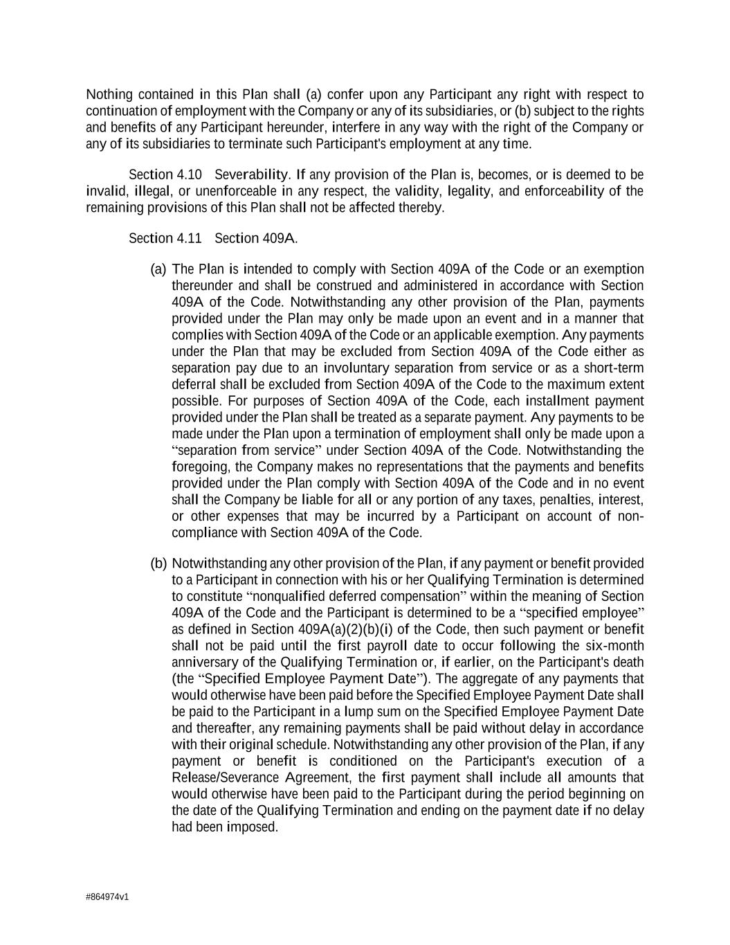 DB1/ 144570925.9 18 #852344v7 intent of the Company that Incentive Stock Options comply with the applicable provisions of section 422 of the Code. To the extent that any legal requirement of section 16 of the Exchange Act or section 422 as set forth in the Plan ceases to be required under section 16 of the Exchange Act or section 422 of the Code, that Plan provision shall cease to apply. The Committee may revoke any Grant if it is contrary to law or modify a Grant to bring it into compliance with any valid and mandatory government regulation. The Committee may also adopt rules regarding the withholding of taxes on payments to Participants. The Committee may, in its sole discretion, agree to limit its authority under this Section. (ii) The Plan is intended to comply with the requirements of section 409A of the Code, to the extent applicable. Each Grant shall be construed and administered such that the Grant either (A) qualifies for an exemption from the requirements of section 409A of the Code or (B) satisfies the requirements of section 409A of the Code. If a Grant is subject to section 409A of the Code, (I) distributions shall only be made in a manner and upon an event permitted under section 409A of the Code, (II) payments to be made upon a termination of employment shall only be made upon a “separation from service” under section 409A of the Code, (III) unless the Grant specifies otherwise, each installment payment shall be treated as a separate payment for purposes of section 409A of the Code, and (IV) in no event shall a Participant, directly or indirectly, designate the calendar year in which a distribution is made except in accordance with section 409A of the Code. (iii) Any Grant that is subject to section 409A of the Code and that is to be distributed to a Key Employee (as defined below) upon separation from service shall be administered so that any distribution with respect to such Grant shall be postponed for six months following the date of the Participant’s separation from service, if required by section 409A of the Code. If a distribution is delayed pursuant to section 409A of the Code, the distribution shall be paid within 15 days after the end of the six-month period. If the Participant dies during such six-month period, any postponed amounts shall be paid within 90 days of the Participant’s death. The determination of “Key Employees”, including the number and identity of persons considered Key Employees and the identification date, shall be made by the Committee or its delegate each year in accordance with section 416(i) of the Code and the “specified employee” requirements of section 409A of the Code. (iv) Notwithstanding anything in the Plan or any Grant Agreement to the contrary, each Participant shall be solely responsible for the tax consequences of Grants under the Plan, and in no event shall the Company have any responsibility or liability if a Grant does not meet any applicable requirements of section 409A of the Code. Although the Company intends to administer the Plan to prevent taxation under section 409A of the Code, the Company does not represent or warrant that the Plan or any Grant complies with any provision of federal, state, local or other tax law. (d) Enforceability. The Plan shall be binding upon and enforceable against the Company and its successors and assigns.