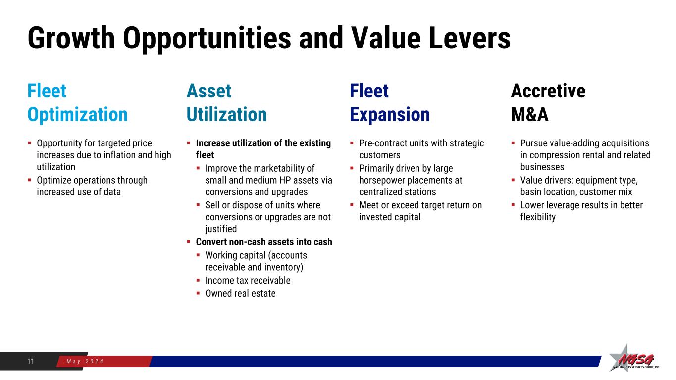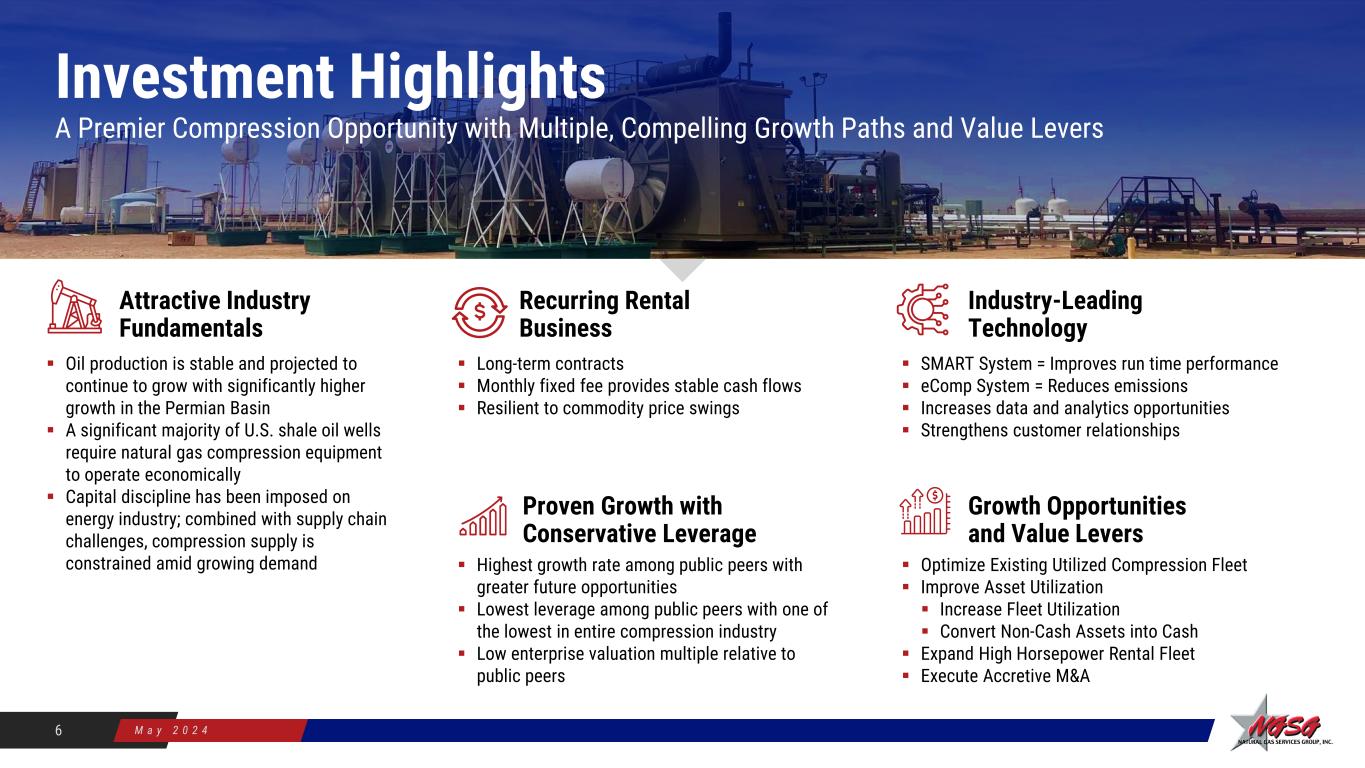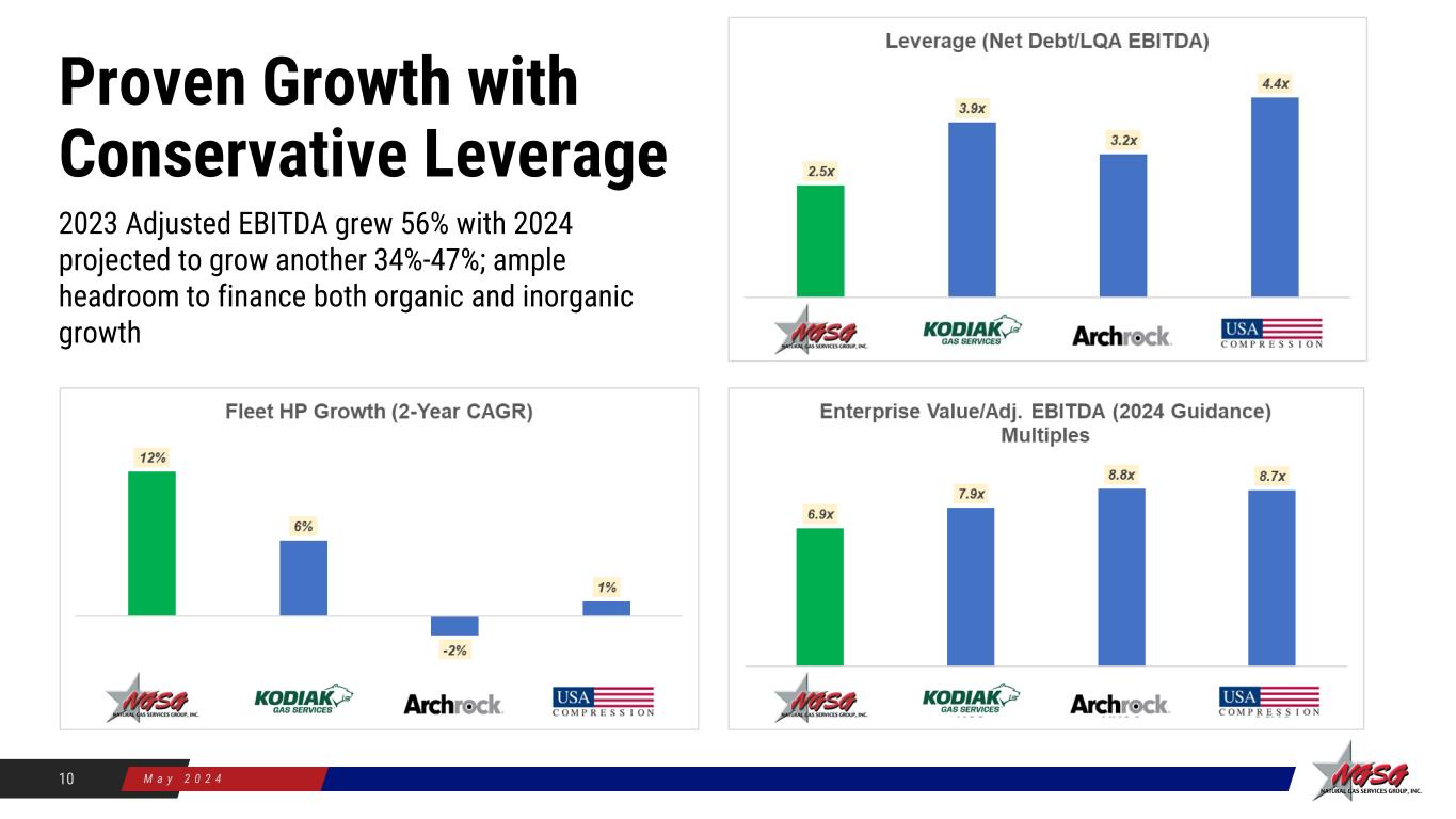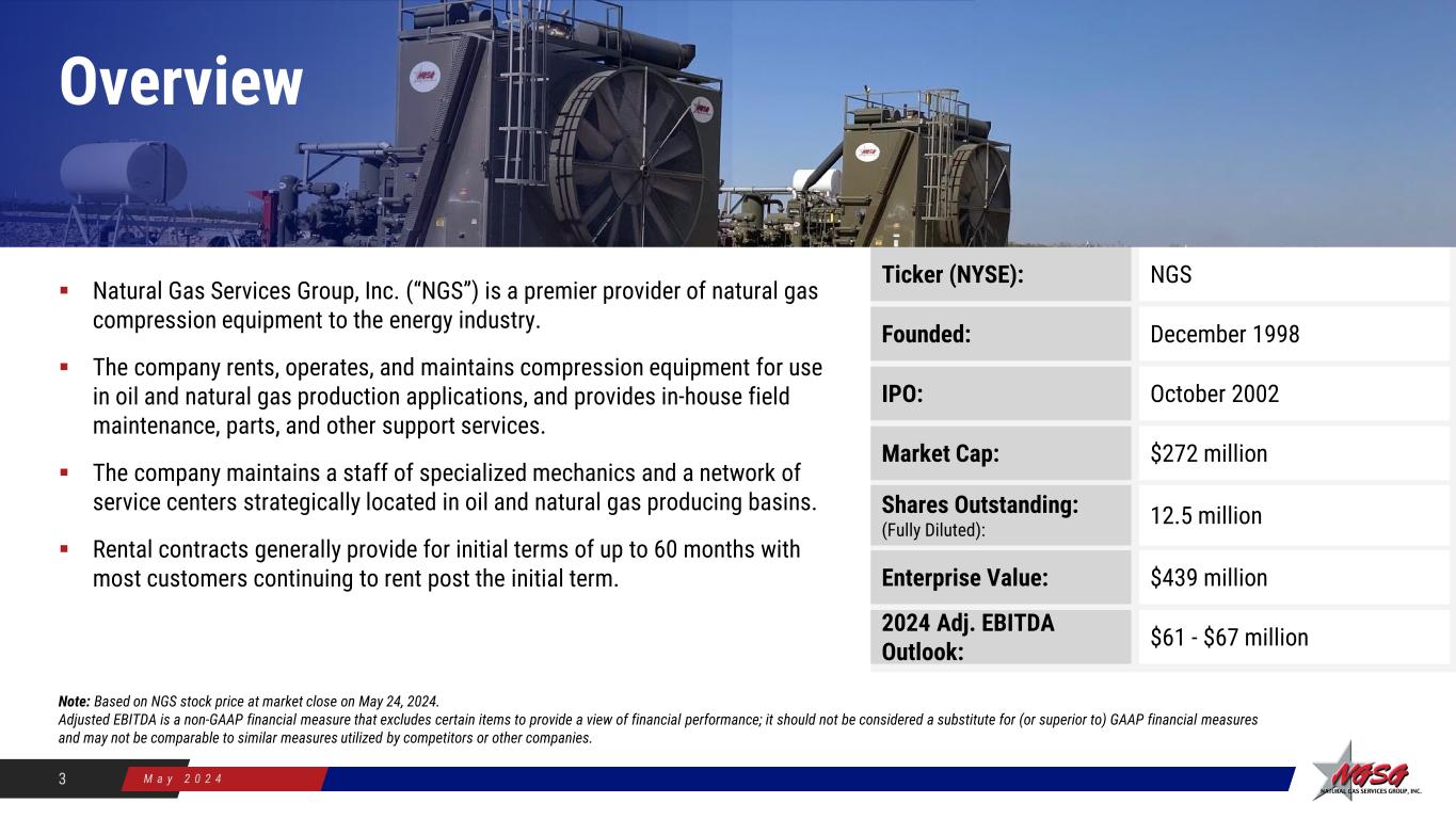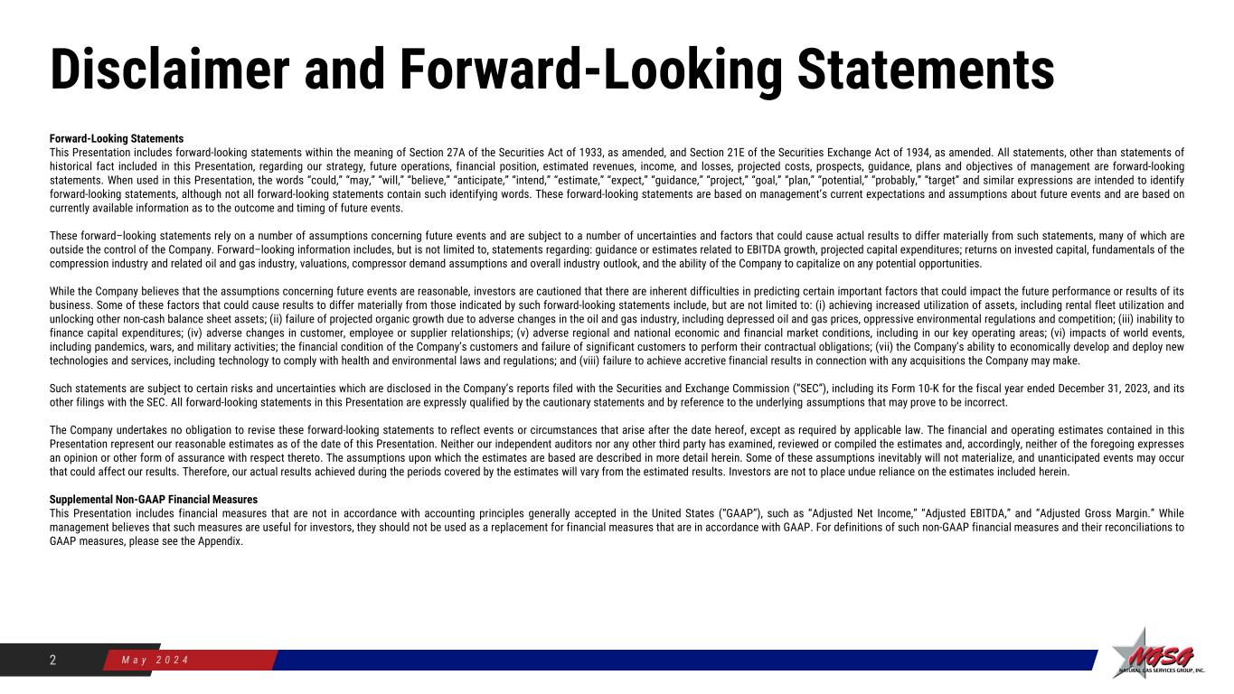 M a y 2 0 2 4 Disclaimer and Forward-Looking Statements 2 Forward-Looking Statements This Presentation includes forward-looking statements within the meaning of Section 27A of the Securities Act of 1933, as amended, and Section 21E of the Securities Exchange Act of 1934, as amended. All statements, other than statements of historical fact included in this Presentation, regarding our strategy, future operations, financial position, estimated revenues, income, and losses, projected costs, prospects, guidance, plans and objectives of management are forward-looking statements. When used in this Presentation, the words “could,” “may,” “will,” “believe,” “anticipate,” “intend,” “estimate,” “expect,” “guidance,” “project,” “goal,” “plan,” “potential,” “probably,” “target” and similar expressions are intended to identify forward-looking statements, although not all forward-looking statements contain such identifying words. These forward-looking statements are based on management’s current expectations and assumptions about future events and are based on currently available information as to the outcome and timing of future events. These forward–looking statements rely on a number of assumptions concerning future events and are subject to a number of uncertainties and factors that could cause actual results to differ materially from such statements, many of which are outside the control of the Company. Forward–looking information includes, but is not limited to, statements regarding: guidance or estimates related to EBITDA growth, projected capital expenditures; returns on invested capital, fundamentals of the compression industry and related oil and gas industry, valuations, compressor demand assumptions and overall industry outlook, and the ability of the Company to capitalize on any potential opportunities. While the Company believes that the assumptions concerning future events are reasonable, investors are cautioned that there are inherent difficulties in predicting certain important factors that could impact the future performance or results of its business. Some of these factors that could cause results to differ materially from those indicated by such forward-looking statements include, but are not limited to: (i) achieving increased utilization of assets, including rental fleet utilization and unlocking other non-cash balance sheet assets; (ii) failure of projected organic growth due to adverse changes in the oil and gas industry, including depressed oil and gas prices, oppressive environmental regulations and competition; (iii) inability to finance capital expenditures; (iv) adverse changes in customer, employee or supplier relationships; (v) adverse regional and national economic and financial market conditions, including in our key operating areas; (vi) impacts of world events, including pandemics, wars, and military activities; the financial condition of the Company’s customers and failure of significant customers to perform their contractual obligations; (vii) the Company’s ability to economically develop and deploy new technologies and services, including technology to comply with health and environmental laws and regulations; and (viii) failure to achieve accretive financial results in connection with any acquisitions the Company may make. Such statements are subject to certain risks and uncertainties which are disclosed in the Company’s reports filed with the Securities and Exchange Commission (“SEC”), including its Form 10-K for the fiscal year ended December 31, 2023, and its other filings with the SEC. All forward-looking statements in this Presentation are expressly qualified by the cautionary statements and by reference to the underlying assumptions that may prove to be incorrect. The Company undertakes no obligation to revise these forward-looking statements to reflect events or circumstances that arise after the date hereof, except as required by applicable law. The financial and operating estimates contained in this Presentation represent our reasonable estimates as of the date of this Presentation. Neither our independent auditors nor any other third party has examined, reviewed or compiled the estimates and, accordingly, neither of the foregoing expresses an opinion or other form of assurance with respect thereto. The assumptions upon which the estimates are based are described in more detail herein. Some of these assumptions inevitably will not materialize, and unanticipated events may occur that could affect our results. Therefore, our actual results achieved during the periods covered by the estimates will vary from the estimated results. Investors are not to place undue reliance on the estimates included herein. Supplemental Non-GAAP Financial Measures This Presentation includes financial measures that are not in accordance with accounting principles generally accepted in the United States (“GAAP”), such as “Adjusted Net Income,” “Adjusted EBITDA,” and “Adjusted Gross Margin.” While management believes that such measures are useful for investors, they should not be used as a replacement for financial measures that are in accordance with GAAP. For definitions of such non-GAAP financial measures and their reconciliations to GAAP measures, please see the Appendix.