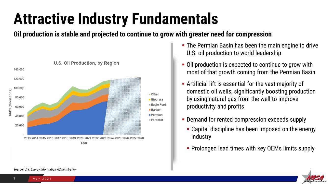 M a y 2 0 2 4 Investment Highlights 6 A Premier Compression Opportunity with Multiple, Compelling Growth Paths and Value Levers Attractive Industry Fundamentals Oil production is stable and projected to continue to grow with significantly higher growth in the Permian Basin A significant majority of U.S. shale oil wells require natural gas compression equipment to operate economically Capital discipline has been imposed on energy industry; combined with supply chain challenges, compression supply is constrained amid growing demand Recurring Rental Business Long-term contracts Monthly fixed fee provides stable cash flows Resilient to commodity price swings Industry-Leading Technology SMART System = Improves run time performance eComp System = Reduces emissions Increases data and analytics opportunities Strengthens customer relationships Proven Growth with Conservative Leverage Highest growth rate among public peers with greater future opportunities Lowest leverage among public peers with one of the lowest in entire compression industry Low enterprise valuation multiple relative to public peers Growth Opportunities and Value Levers Optimize Existing Utilized Compression Fleet Improve Asset Utilization Increase Fleet Utilization Convert Non-Cash Assets into Cash Expand High Horsepower Rental Fleet Execute Accretive M&A