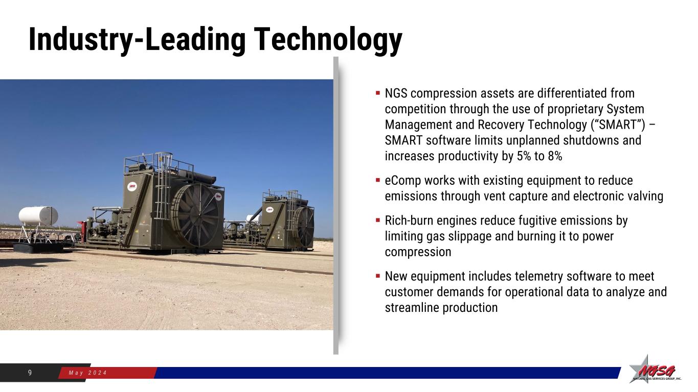 M a y 2 0 2 4 Recurring Rental Business 8 Initial terms for rental units range from 6-60 months New large horsepower units are typically at the high end of the range Most customers continue to rent past the initial term Compression assets are “sticky”—once on a site, there are material switching costs (shutdown, demobilization, transportation, downtime) borne by operators to change to a competitor after lease expiration Assets have 15-25 year useful lives—quality equipment that is well-maintained withstands the test of time NGS serves leading operators in the Permian Basin and beyond which limits counterparty (credit) risk The rental compression industry is directly tied to oil production and only indirectly tied to exploration Oil production is materially less volatile than exploration as production only stops when the incremental cost of production goes below the price The Permian Basin has one of the lowest levels of marginal production cost for an incremental barrel of oil Long term contracts: Stable cash flows: Resilience to commodity price swings: