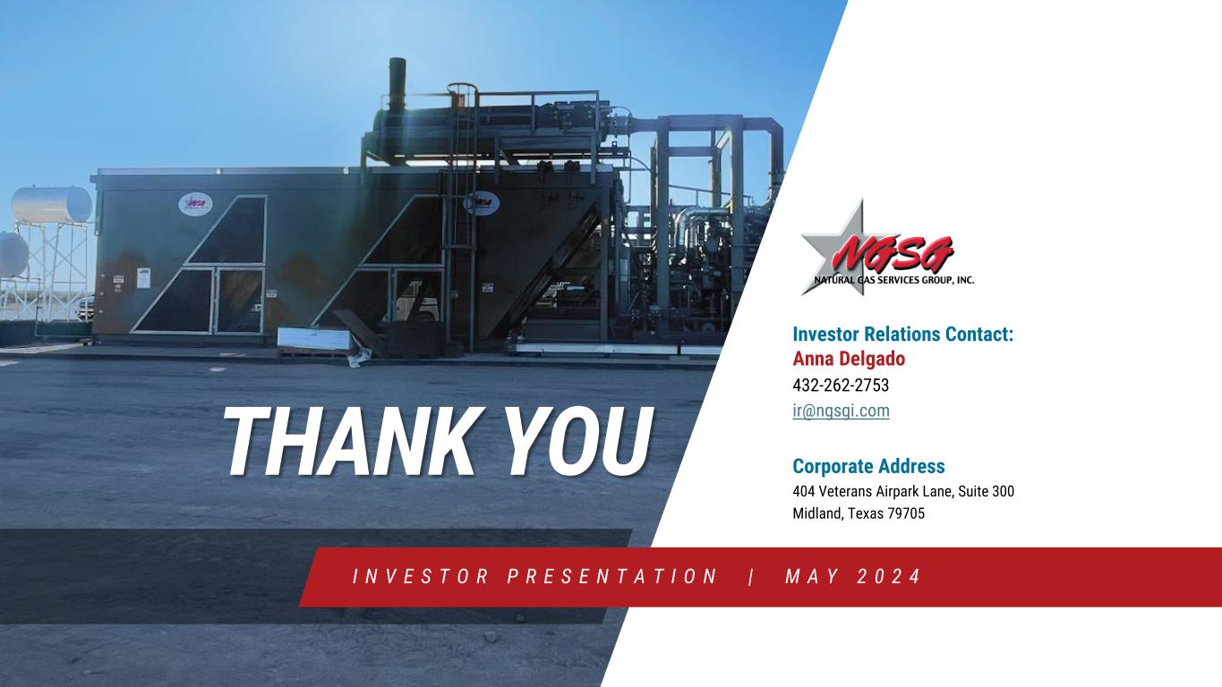 THANK YOU Investor Relations Contact: Anna Delgado 432-262-2753 ir@ngsgi.com Corporate Address 404 Veterans Airpark Lane, Suite 300 Midland, Texas 79705 I N V E S T O R P R E S E N T A T I O N | M A Y 2 0 2 4