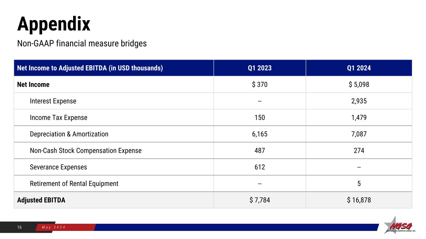 M a y 2 0 2 4 Appendix 16 Non-GAAP financial measure bridges Net Income to Adjusted EBITDA (in USD thousands) Q1 2023 Q1 2024 Net Income $ 370 $ 5,098 Interest Expense -- 2,935 Income Tax Expense 150 1,479 Depreciation & Amortization 6,165 7,087 Non-Cash Stock Compensation Expense 487 274 Severance Expenses 612 -- Retirement of Rental Equipment -- 5 Adjusted EBITDA $ 7,784 $ 16,878