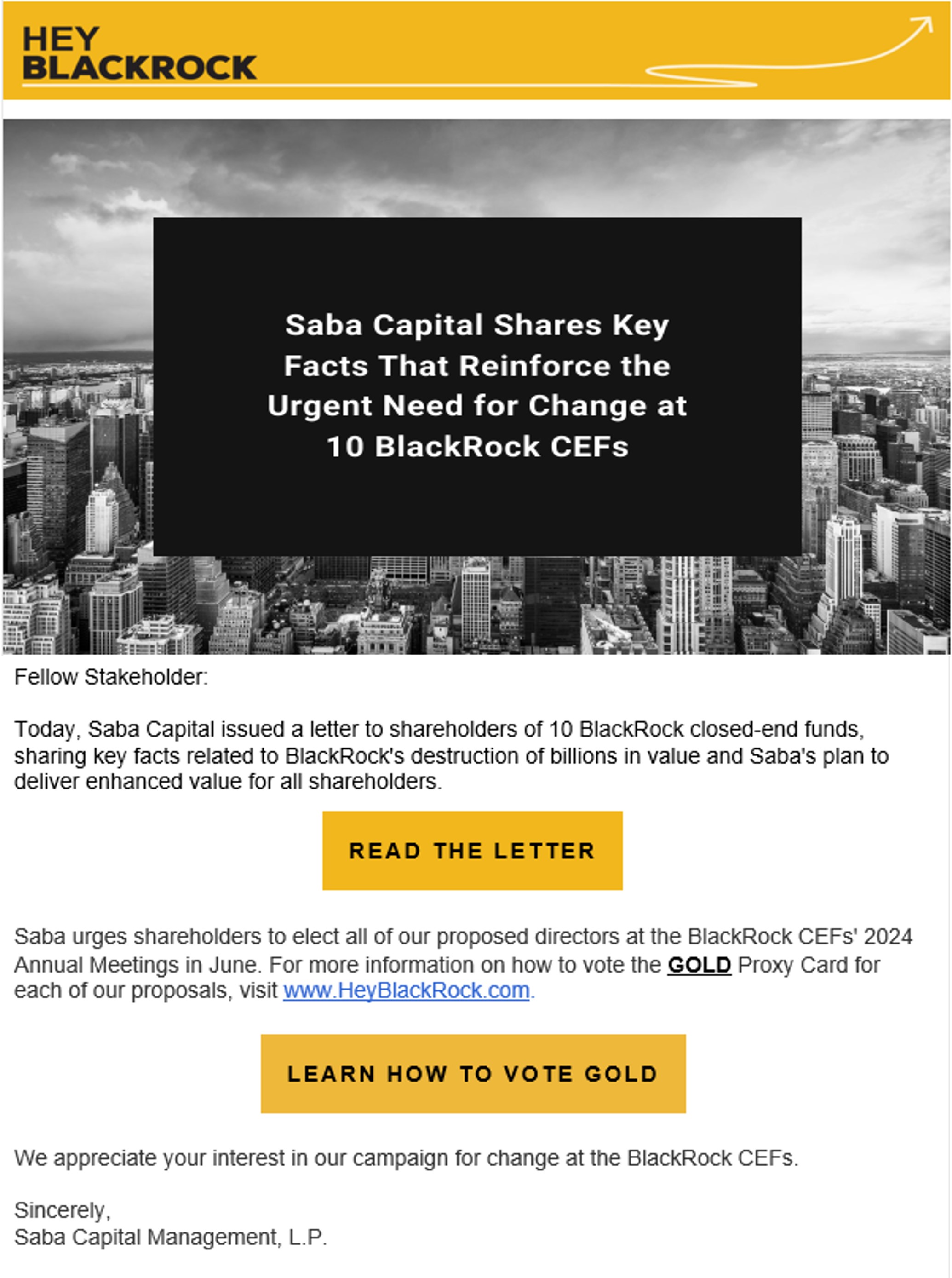 Fellow Stakeholder: Today, Saba Capital issued a letter to shareholders of 10 BlackRock closed-end funds, sharing key facts related to BlackRock's destruction of billions in value and Saba's plan to deliver enhanced value for all shareholders.