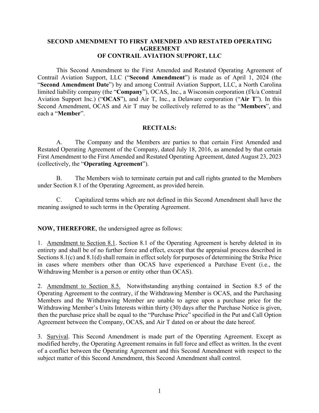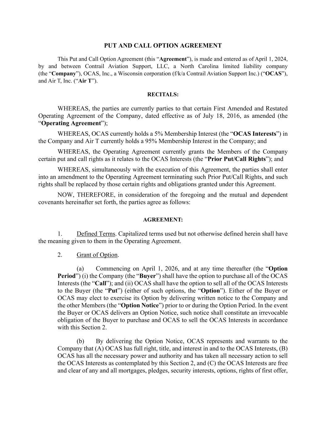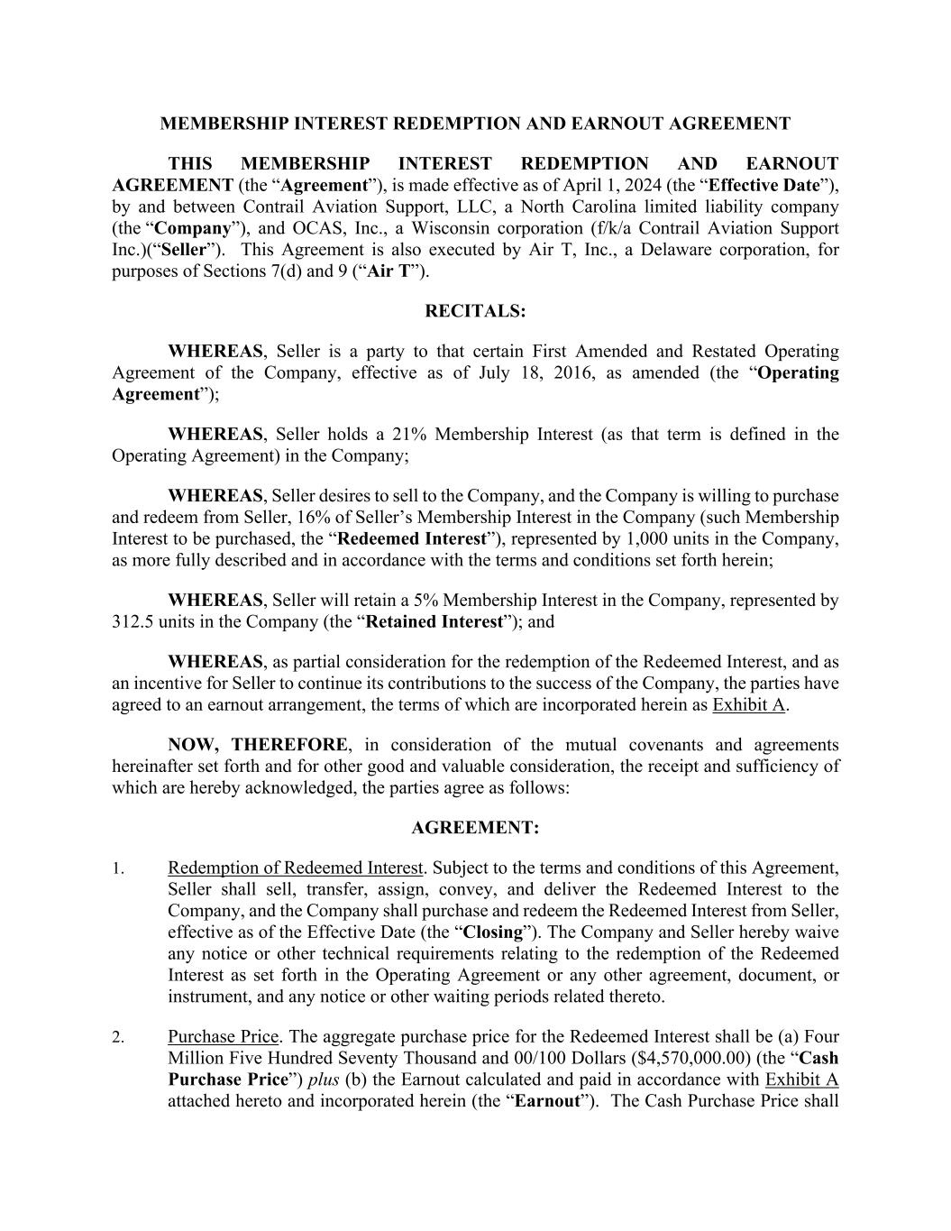 MEMBERSHIP INTEREST REDEMPTION AND EARNOUT AGREEMENT THIS MEMBERSHIP INTEREST REDEMPTION AND EARNOUT AGREEMENT (the “Agreement”), is made effective as of April 1, 2024 (the “Effective Date”), by and between Contrail Aviation Support, LLC, a North Carolina limited liability company (the “Company”), and OCAS, Inc., a Wisconsin corporation (f/k/a Contrail Aviation Support Inc.)(“Seller”). This Agreement is also executed by Air T, Inc., a Delaware corporation, for purposes of Sections 7(d) and 9 (“Air T”). RECITALS: WHEREAS, Seller is a party to that certain First Amended and Restated Operating Agreement of the Company, effective as of July 18, 2016, as amended (the “Operating Agreement”); WHEREAS, Seller holds a 21% Membership Interest (as that term is defined in the Operating Agreement) in the Company; WHEREAS, Seller desires to sell to the Company, and the Company is willing to purchase and redeem from Seller, 16% of Seller’s Membership Interest in the Company (such Membership Interest to be purchased, the “Redeemed Interest”), represented by 1,000 units in the Company, as more fully described and in accordance with the terms and conditions set forth herein; WHEREAS, Seller will retain a 5% Membership Interest in the Company, represented by 312.5 units in the Company (the “Retained Interest”); and WHEREAS, as partial consideration for the redemption of the Redeemed Interest, and as an incentive for Seller to continue its contributions to the success of the Company, the parties have agreed to an earnout arrangement, the terms of which are incorporated herein as Exhibit A. NOW, THEREFORE, in consideration of the mutual covenants and agreements hereinafter set forth and for other good and valuable consideration, the receipt and sufficiency of which are hereby acknowledged, the parties agree as follows: AGREEMENT: 1. Redemption of Redeemed Interest. Subject to the terms and conditions of this Agreement, Seller shall sell, transfer, assign, convey, and deliver the Redeemed Interest to the Company, and the Company shall purchase and redeem the Redeemed Interest from Seller, effective as of the Effective Date (the “Closing”). The Company and Seller hereby waive any notice or other technical requirements relating to the redemption of the Redeemed Interest as set forth in the Operating Agreement or any other agreement, document, or instrument, and any notice or other waiting periods related thereto. 2. Purchase Price. The aggregate purchase price for the Redeemed Interest shall be (a) Four Million Five Hundred Seventy Thousand and 00/100 Dollars ($4,570,000.00) (the “Cash Purchase Price”) plus (b) the Earnout calculated and paid in accordance with Exhibit A attached hereto and incorporated herein (the “Earnout”). The Cash Purchase Price shall