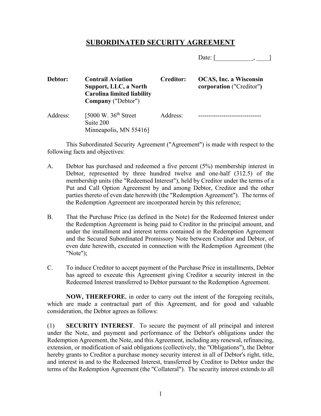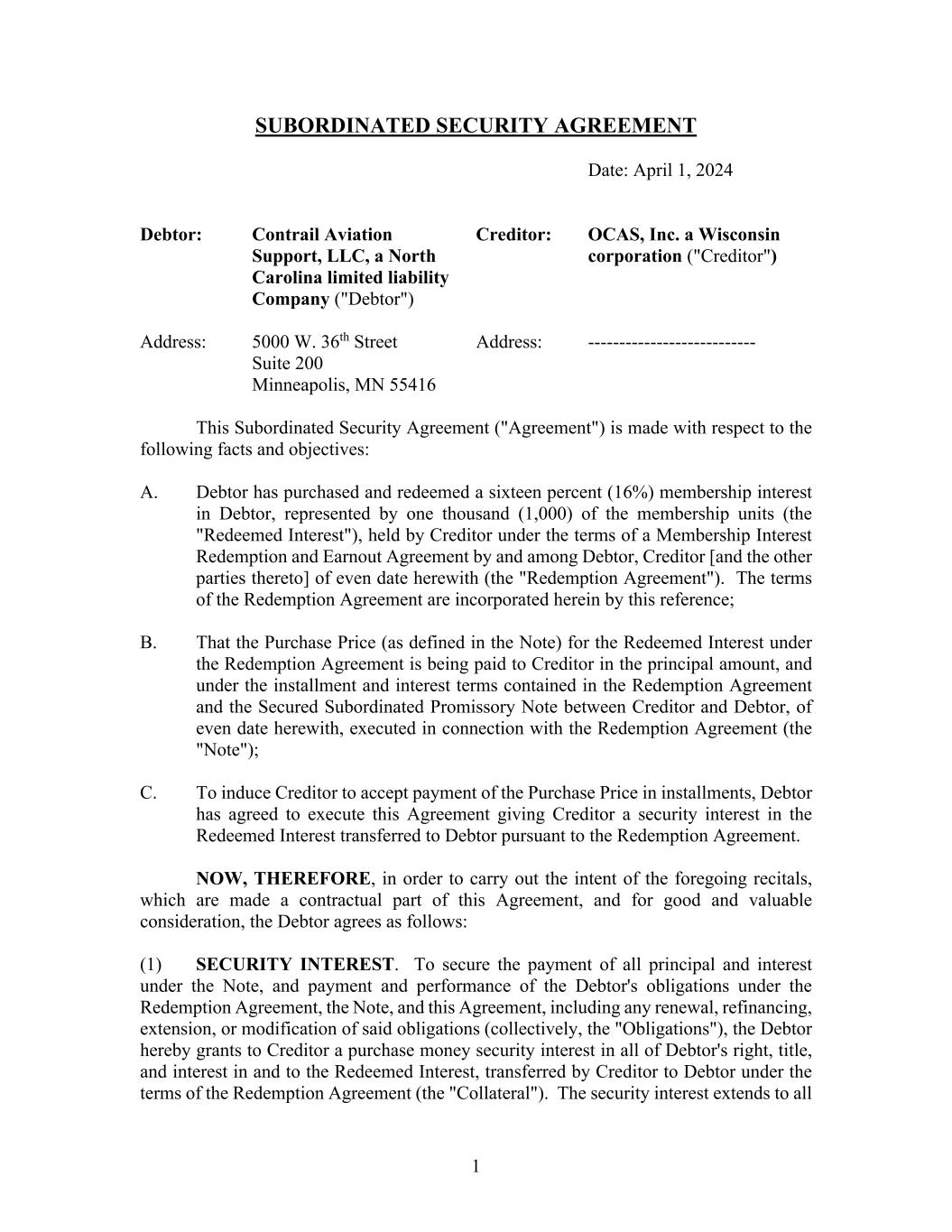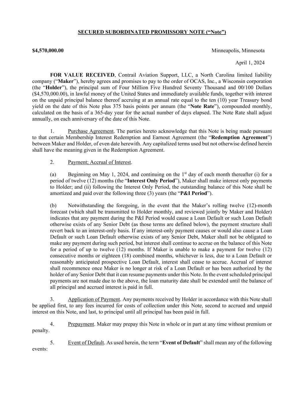 MEMBERSHIP INTEREST REDEMPTION AND EARNOUT AGREEMENT THIS MEMBERSHIP INTEREST REDEMPTION AND EARNOUT AGREEMENT (the “Agreement”), is made effective as of April 1, 2024 (the “Effective Date”), by and between Contrail Aviation Support, LLC, a North Carolina limited liability company (the “Company”), and OCAS, Inc., a Wisconsin corporation (f/k/a Contrail Aviation Support Inc.)(“Seller”). This Agreement is also executed by Air T, Inc., a Delaware corporation, for purposes of Sections 7(d) and 9 (“Air T”). RECITALS: WHEREAS, Seller is a party to that certain First Amended and Restated Operating Agreement of the Company, effective as of July 18, 2016, as amended (the “Operating Agreement”); WHEREAS, Seller holds a 21% Membership Interest (as that term is defined in the Operating Agreement) in the Company; WHEREAS, Seller desires to sell to the Company, and the Company is willing to purchase and redeem from Seller, 16% of Seller’s Membership Interest in the Company (such Membership Interest to be purchased, the “Redeemed Interest”), represented by 1,000 units in the Company, as more fully described and in accordance with the terms and conditions set forth herein; WHEREAS, Seller will retain a 5% Membership Interest in the Company, represented by 312.5 units in the Company (the “Retained Interest”); and WHEREAS, as partial consideration for the redemption of the Redeemed Interest, and as an incentive for Seller to continue its contributions to the success of the Company, the parties have agreed to an earnout arrangement, the terms of which are incorporated herein as Exhibit A. NOW, THEREFORE, in consideration of the mutual covenants and agreements hereinafter set forth and for other good and valuable consideration, the receipt and sufficiency of which are hereby acknowledged, the parties agree as follows: AGREEMENT: 1. Redemption of Redeemed Interest. Subject to the terms and conditions of this Agreement, Seller shall sell, transfer, assign, convey, and deliver the Redeemed Interest to the Company, and the Company shall purchase and redeem the Redeemed Interest from Seller, effective as of the Effective Date (the “Closing”). The Company and Seller hereby waive any notice or other technical requirements relating to the redemption of the Redeemed Interest as set forth in the Operating Agreement or any other agreement, document, or instrument, and any notice or other waiting periods related thereto. 2. Purchase Price. The aggregate purchase price for the Redeemed Interest shall be (a) Four Million Five Hundred Seventy Thousand and 00/100 Dollars ($4,570,000.00) (the “Cash Purchase Price”) plus (b) the Earnout calculated and paid in accordance with Exhibit A attached hereto and incorporated herein (the “Earnout”). The Cash Purchase Price shall