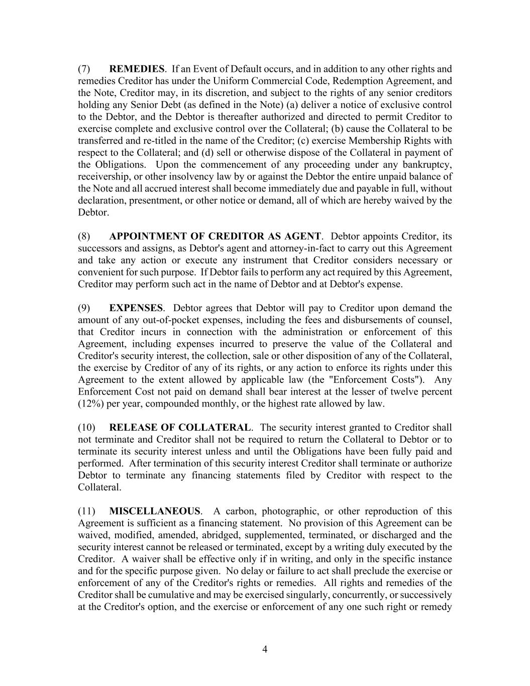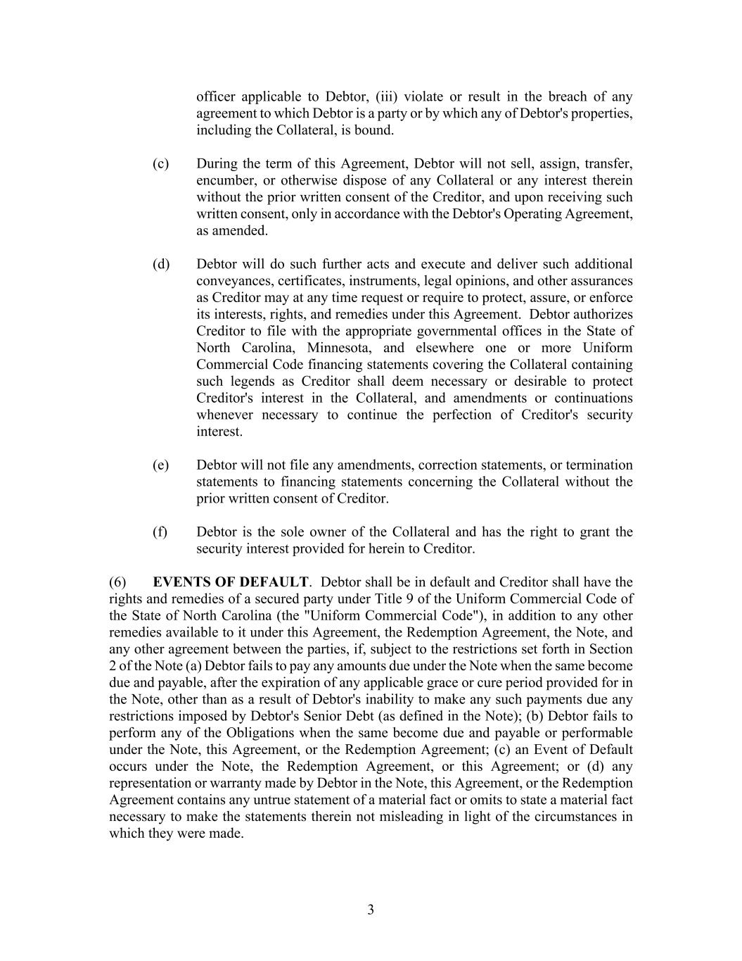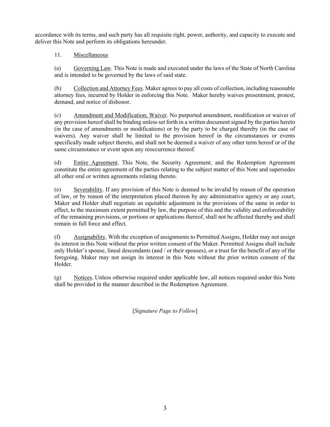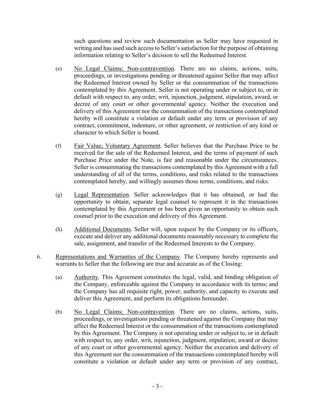 - 3 - such questions and review such documentation as Seller may have requested in writing and has used such access to Seller’s satisfaction for the purpose of obtaining information relating to Seller’s decision to sell the Redeemed Interest. (e) No Legal Claims; Non-contravention. There are no claims, actions, suits, proceedings, or investigations pending or threatened against Seller that may affect the Redeemed Interest owned by Seller or the consummation of the transactions contemplated by this Agreement. Seller is not operating under or subject to, or in default with respect to, any order, writ, injunction, judgment, stipulation, award, or decree of any court or other governmental agency. Neither the execution and delivery of this Agreement nor the consummation of the transactions contemplated hereby will constitute a violation or default under any term or provision of any contract, commitment, indenture, or other agreement, or restriction of any kind or character to which Seller is bound. (f) Fair Value; Voluntary Agreement. Seller believes that the Purchase Price to be received for the sale of the Redeemed Interest, and the terms of payment of such Purchase Price under the Note, is fair and reasonable under the circumstances. Seller is consummating the transactions contemplated by this Agreement with a full understanding of all of the terms, conditions, and risks related to the transactions contemplated hereby, and willingly assumes those terms, conditions, and risks. (g) Legal Representation. Seller acknowledges that it has obtained, or had the opportunity to obtain, separate legal counsel to represent it in the transactions contemplated by this Agreement or has been given an opportunity to obtain such counsel prior to the execution and delivery of this Agreement. (h) Additional Documents. Seller will, upon request by the Company or its officers, execute and deliver any additional documents reasonably necessary to complete the sale, assignment, and transfer of the Redeemed Interests to the Company. 6. Representations and Warranties of the Company. The Company hereby represents and warrants to Seller that the following are true and accurate as of the Closing: (a) Authority. This Agreement constitutes the legal, valid, and binding obligation of the Company, enforceable against the Company in accordance with its terms; and the Company has all requisite right, power, authority, and capacity to execute and deliver this Agreement, and perform its obligations hereunder. (b) No Legal Claims; Non-contravention. There are no claims, actions, suits, proceedings, or investigations pending or threatened against the Company that may affect the Redeemed Interest or the consummation of the transactions contemplated by this Agreement. The Company is not operating under or subject to, or in default with respect to, any order, writ, injunction, judgment, stipulation, award or decree of any court or other governmental agency. Neither the execution and delivery of this Agreement nor the consummation of the transactions contemplated hereby will constitute a violation or default under any term or provision of any contract,