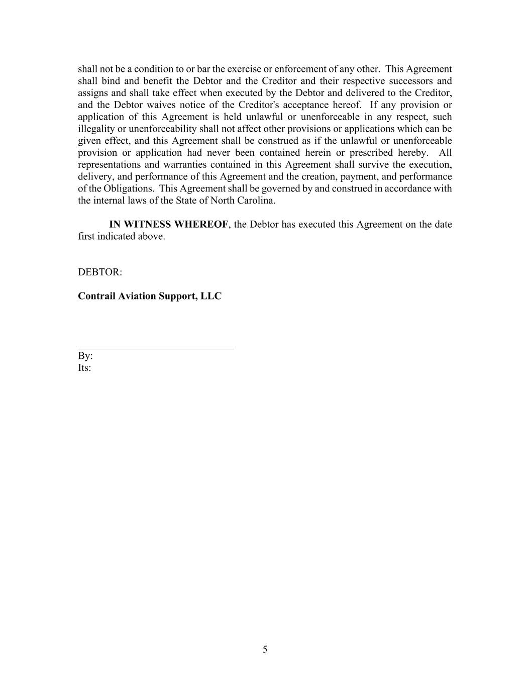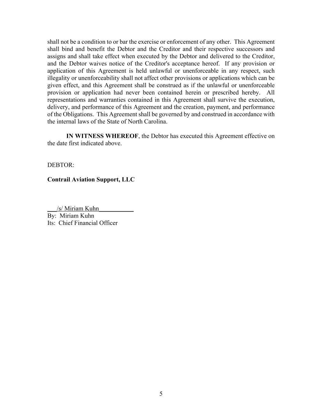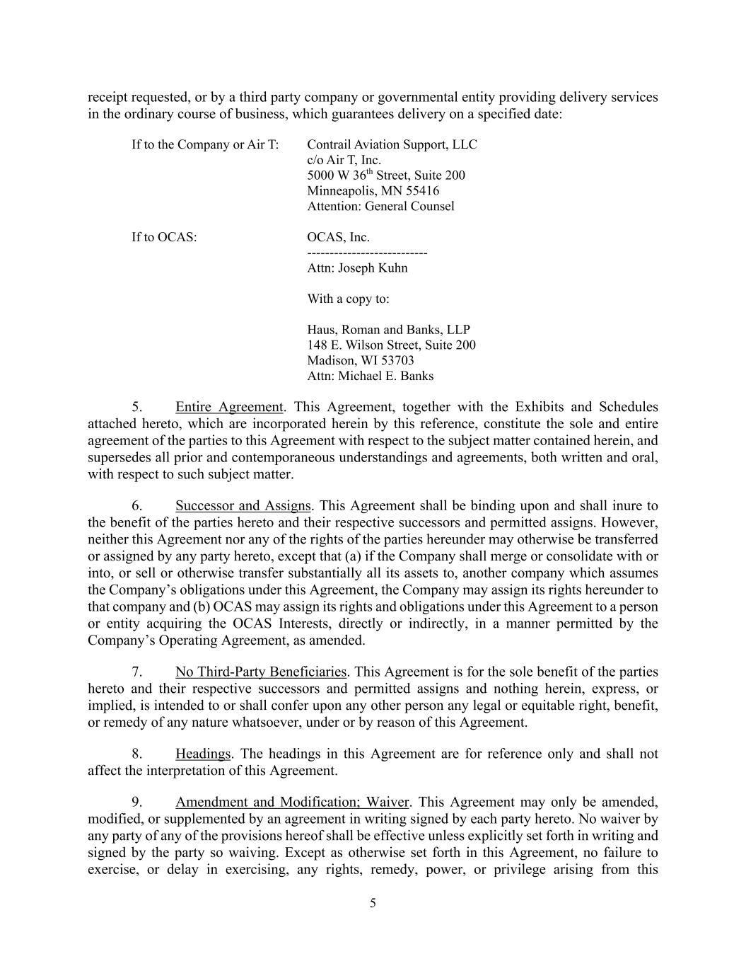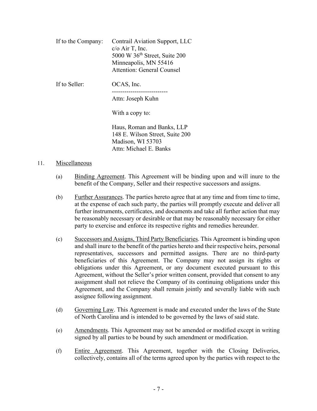- 7 - If to the Company: Contrail Aviation Support, LLC c/o Air T, Inc. 5000 W 36th Street, Suite 200 Minneapolis, MN 55416 Attention: General Counsel If to Seller: OCAS, Inc. --------------------------- Attn: Joseph Kuhn With a copy to: Haus, Roman and Banks, LLP 148 E. Wilson Street, Suite 200 Madison, WI 53703 Attn: Michael E. Banks 11. Miscellaneous (a) Binding Agreement. This Agreement will be binding upon and will inure to the benefit of the Company, Seller and their respective successors and assigns. (b) Further Assurances. The parties hereto agree that at any time and from time to time, at the expense of each such party, the parties will promptly execute and deliver all further instruments, certificates, and documents and take all further action that may be reasonably necessary or desirable or that may be reasonably necessary for either party to exercise and enforce its respective rights and remedies hereunder. (c) Successors and Assigns, Third Party Beneficiaries. This Agreement is binding upon and shall inure to the benefit of the parties hereto and their respective heirs, personal representatives, successors and permitted assigns. There are no third-party beneficiaries of this Agreement. The Company may not assign its rights or obligations under this Agreement, or any document executed pursuant to this Agreement, without the Seller’s prior written consent, provided that consent to any assignment shall not relieve the Company of its continuing obligations under this Agreement, and the Company shall remain jointly and severally liable with such assignee following assignment. (d) Governing Law. This Agreement is made and executed under the laws of the State of North Carolina and is intended to be governed by the laws of said state. (e) Amendments. This Agreement may not be amended or modified except in writing signed by all parties to be bound by such amendment or modification. (f) Entire Agreement. This Agreement, together with the Closing Deliveries, collectively, contains all of the terms agreed upon by the parties with respect to the