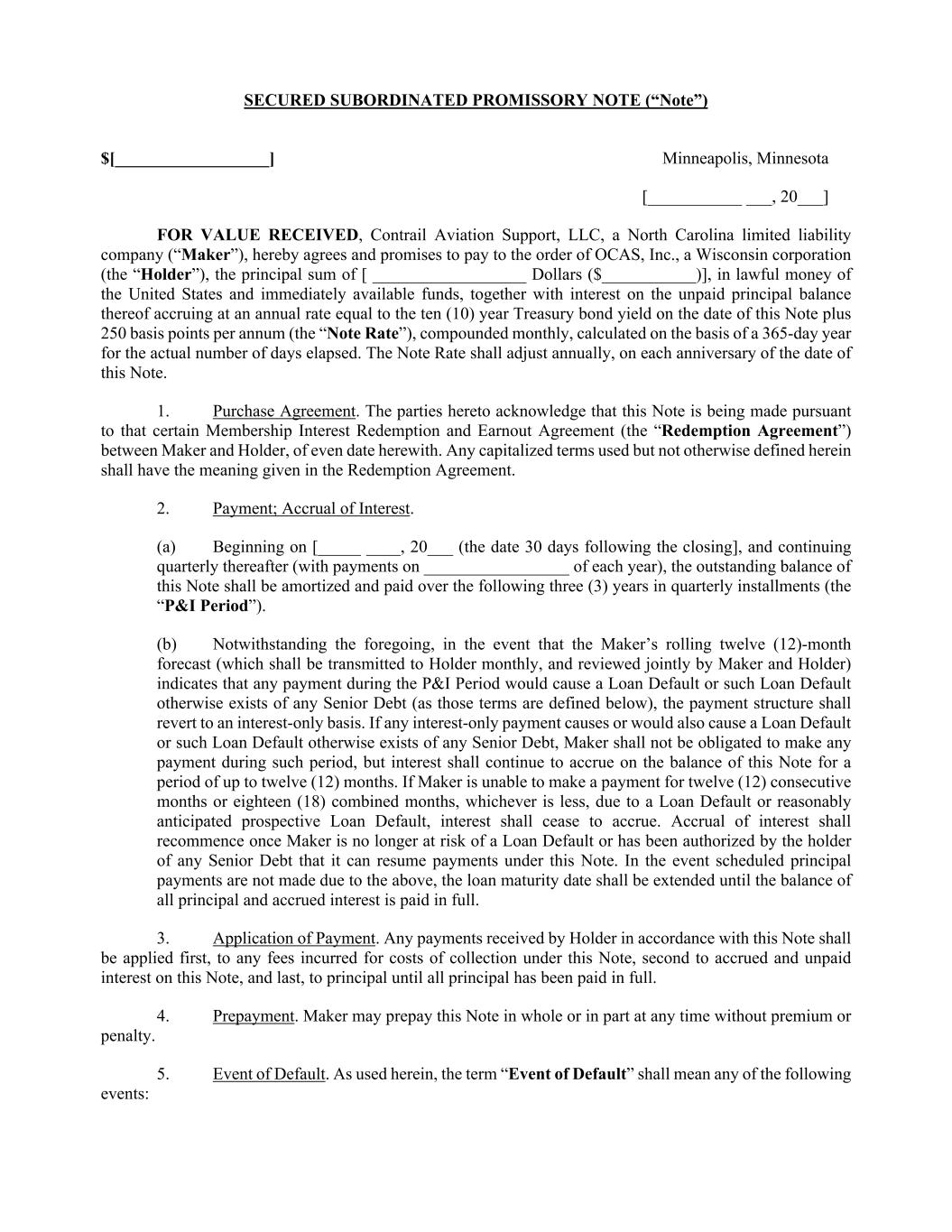 - 2 - be payable to Seller at Closing by delivery by the Company to Seller of a Secured Subordinated Promissory Note, in an original principal amount equal to the Cash Purchase Price, in substantially the form attached hereto as Exhibit B (the “Note”). 3. Assignment Separate from Certificate. Seller shall execute and deliver to the Company the Assignment Separate from Certificate attached hereto as Exhibit C (the “Assignment Separate from Certificate”), so as to transfer to the Company all right, title, and interest of Seller to the Redeemed Interest. Subject to Section 8 hereof, Seller acknowledges and agrees that the Company will not deliver the Note to Seller in payment of the Purchase Price for the Redeemed Interest unless and until Seller has executed and delivered to the Company the Assignment Separate from Certificate and such additional documents as the Company may reasonably request. 4. Subordination Agreement. As a condition precedent to Closing, it is agreed that the parties shall enter into a subordination agreement in a form acceptable to and required by the senior lender of the Company. Such subordination agreement shall stipulate that the payments made to Seller under this Agreement, including the Note and Earnout Payments (as defined in Exhibit A) shall be subordinate to all existing and future debts owed by the Company to such senior lender. 5. Representations and Warranties of Seller. Seller hereby represents and warrants to the Company that the following are true and accurate as of the Closing: (a) Authority. This Agreement constitutes the legal, valid, and binding obligation of Seller, enforceable against Seller in accordance with its terms; and Seller has all requisite right, power, authority, and capacity to execute and deliver this Agreement, and perform its obligations hereunder. (b) Title. Seller owns all right, title, and interest in and to the Redeemed Interest free and clear of all pledges, liens, claims, charges, proxies, security interests, options, encumbrances, and restrictions whatsoever, other than the rights of the Company and its members pursuant to the Operating Agreement. (c) Ownership; Right to Sell. Seller holds all right, title, and interest in and to the Redeemed Interest and is the sole owner, beneficially and of record, of the Redeemed Interest and has the absolute and unrestricted legal capacity, right, power, and authority to sell the Redeemed Interest to the Company. Seller has not sold, assigned, pledged, or otherwise transferred any of the Redeemed Interest to any other person. Neither the execution and delivery of this Agreement nor the consummation of the transactions contemplated hereby will constitute a violation or default under any term or provision of any contract, commitment, indenture, or other agreement or restriction of any kind or character to which Seller is bound. (d) Access to Information. Seller has received and reviewed such information concerning the business and financial condition of the Company necessary to make an informed decision regarding the sale of the Redeemed Interest. Seller has had the opportunity to meet with members of management of the Company and to ask