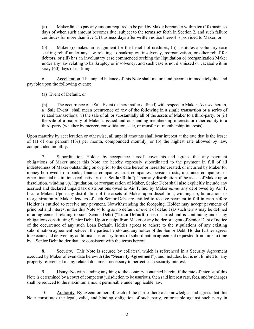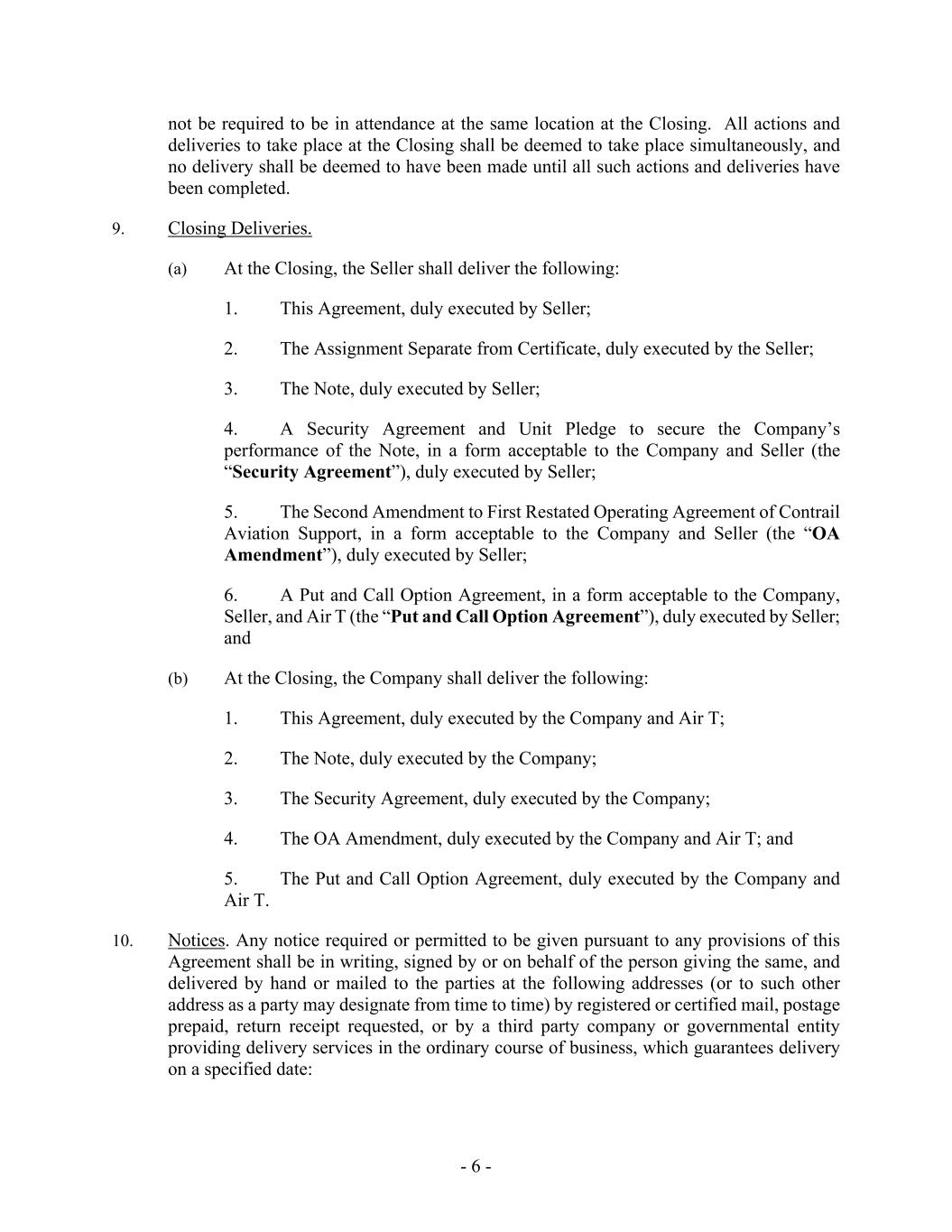 - 6 - not be required to be in attendance at the same location at the Closing. All actions and deliveries to take place at the Closing shall be deemed to take place simultaneously, and no delivery shall be deemed to have been made until all such actions and deliveries have been completed. 9. Closing Deliveries. (a) At the Closing, the Seller shall deliver the following: 1. This Agreement, duly executed by Seller; 2. The Assignment Separate from Certificate, duly executed by the Seller; 3. The Note, duly executed by Seller; 4. A Security Agreement and Unit Pledge to secure the Company’s performance of the Note, in a form acceptable to the Company and Seller (the “Security Agreement”), duly executed by Seller; 5. The Second Amendment to First Restated Operating Agreement of Contrail Aviation Support, in a form acceptable to the Company and Seller (the “OA Amendment”), duly executed by Seller; 6. A Put and Call Option Agreement, in a form acceptable to the Company, Seller, and Air T (the “Put and Call Option Agreement”), duly executed by Seller; and (b) At the Closing, the Company shall deliver the following: 1. This Agreement, duly executed by the Company and Air T; 2. The Note, duly executed by the Company; 3. The Security Agreement, duly executed by the Company; 4. The OA Amendment, duly executed by the Company and Air T; and 5. The Put and Call Option Agreement, duly executed by the Company and Air T. 10. Notices. Any notice required or permitted to be given pursuant to any provisions of this Agreement shall be in writing, signed by or on behalf of the person giving the same, and delivered by hand or mailed to the parties at the following addresses (or to such other address as a party may designate from time to time) by registered or certified mail, postage prepaid, return receipt requested, or by a third party company or governmental entity providing delivery services in the ordinary course of business, which guarantees delivery on a specified date: