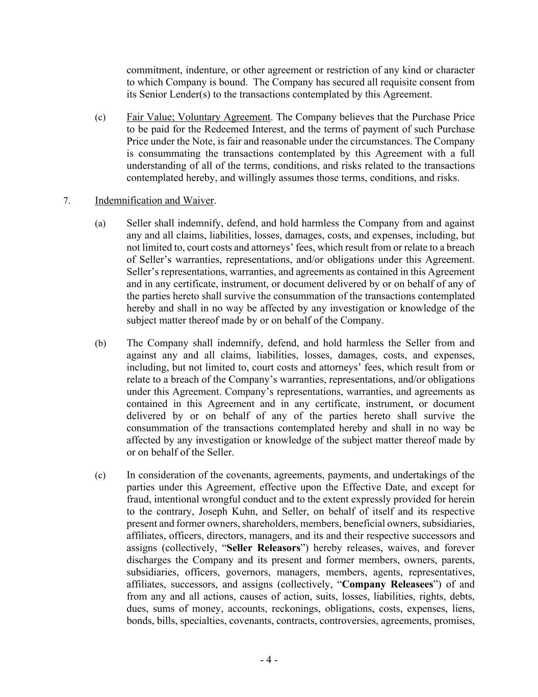 - 4 - commitment, indenture, or other agreement or restriction of any kind or character to which Company is bound. The Company has secured all requisite consent from its Senior Lender(s) to the transactions contemplated by this Agreement. (c) Fair Value; Voluntary Agreement. The Company believes that the Purchase Price to be paid for the Redeemed Interest, and the terms of payment of such Purchase Price under the Note, is fair and reasonable under the circumstances. The Company is consummating the transactions contemplated by this Agreement with a full understanding of all of the terms, conditions, and risks related to the transactions contemplated hereby, and willingly assumes those terms, conditions, and risks. 7. Indemnification and Waiver. (a) Seller shall indemnify, defend, and hold harmless the Company from and against any and all claims, liabilities, losses, damages, costs, and expenses, including, but not limited to, court costs and attorneys’ fees, which result from or relate to a breach of Seller’s warranties, representations, and/or obligations under this Agreement. Seller’s representations, warranties, and agreements as contained in this Agreement and in any certificate, instrument, or document delivered by or on behalf of any of the parties hereto shall survive the consummation of the transactions contemplated hereby and shall in no way be affected by any investigation or knowledge of the subject matter thereof made by or on behalf of the Company. (b) The Company shall indemnify, defend, and hold harmless the Seller from and against any and all claims, liabilities, losses, damages, costs, and expenses, including, but not limited to, court costs and attorneys’ fees, which result from or relate to a breach of the Company’s warranties, representations, and/or obligations under this Agreement. Company’s representations, warranties, and agreements as contained in this Agreement and in any certificate, instrument, or document delivered by or on behalf of any of the parties hereto shall survive the consummation of the transactions contemplated hereby and shall in no way be affected by any investigation or knowledge of the subject matter thereof made by or on behalf of the Seller. (c) In consideration of the covenants, agreements, payments, and undertakings of the parties under this Agreement, effective upon the Effective Date, and except for fraud, intentional wrongful conduct and to the extent expressly provided for herein to the contrary, Joseph Kuhn, and Seller, on behalf of itself and its respective present and former owners, shareholders, members, beneficial owners, subsidiaries, affiliates, officers, directors, managers, and its and their respective successors and assigns (collectively, “Seller Releasors”) hereby releases, waives, and forever discharges the Company and its present and former members, owners, parents, subsidiaries, officers, governors, managers, members, agents, representatives, affiliates, successors, and assigns (collectively, “Company Releasees”) of and from any and all actions, causes of action, suits, losses, liabilities, rights, debts, dues, sums of money, accounts, reckonings, obligations, costs, expenses, liens, bonds, bills, specialties, covenants, contracts, controversies, agreements, promises,