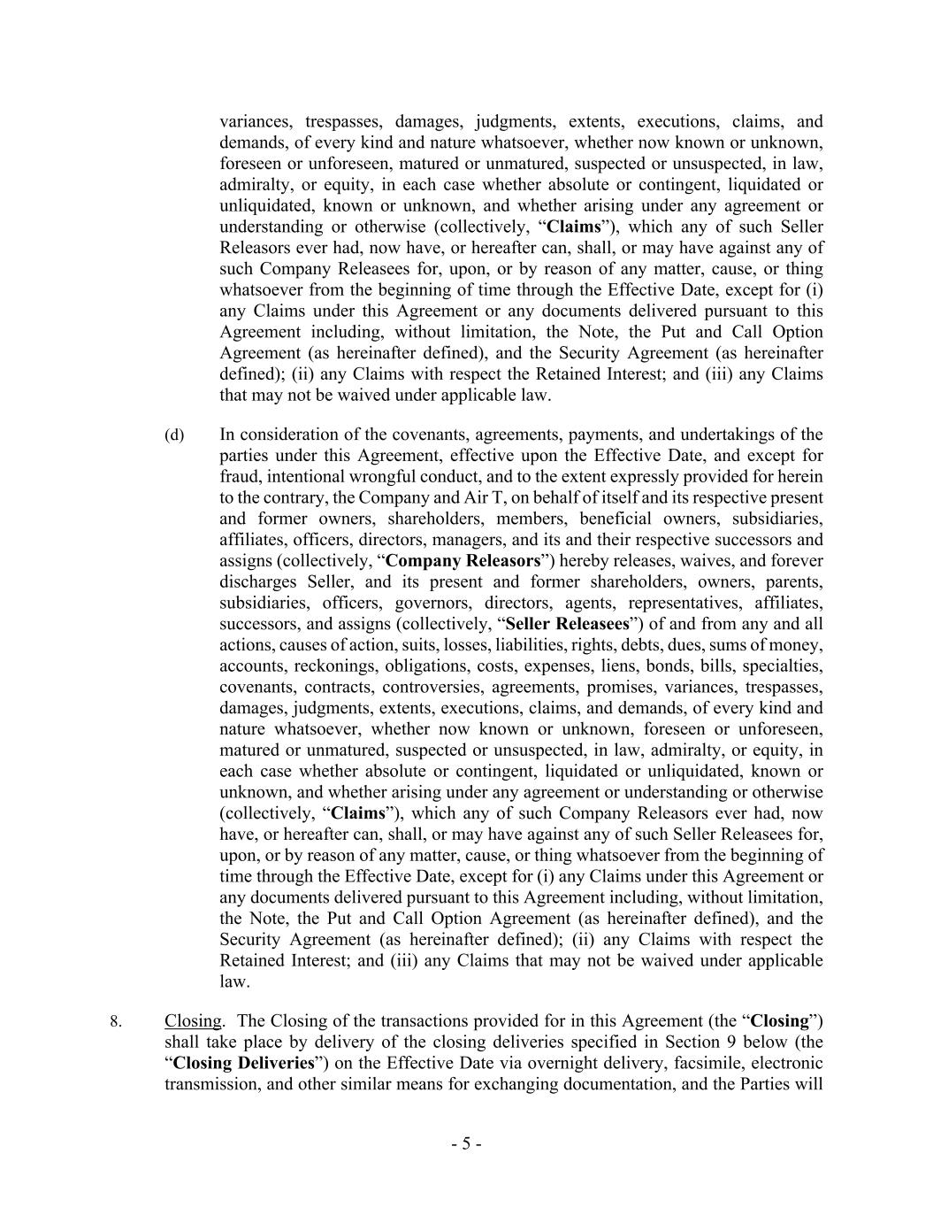 - 5 - variances, trespasses, damages, judgments, extents, executions, claims, and demands, of every kind and nature whatsoever, whether now known or unknown, foreseen or unforeseen, matured or unmatured, suspected or unsuspected, in law, admiralty, or equity, in each case whether absolute or contingent, liquidated or unliquidated, known or unknown, and whether arising under any agreement or understanding or otherwise (collectively, “Claims”), which any of such Seller Releasors ever had, now have, or hereafter can, shall, or may have against any of such Company Releasees for, upon, or by reason of any matter, cause, or thing whatsoever from the beginning of time through the Effective Date, except for (i) any Claims under this Agreement or any documents delivered pursuant to this Agreement including, without limitation, the Note, the Put and Call Option Agreement (as hereinafter defined), and the Security Agreement (as hereinafter defined); (ii) any Claims with respect the Retained Interest; and (iii) any Claims that may not be waived under applicable law. (d) In consideration of the covenants, agreements, payments, and undertakings of the parties under this Agreement, effective upon the Effective Date, and except for fraud, intentional wrongful conduct, and to the extent expressly provided for herein to the contrary, the Company and Air T, on behalf of itself and its respective present and former owners, shareholders, members, beneficial owners, subsidiaries, affiliates, officers, directors, managers, and its and their respective successors and assigns (collectively, “Company Releasors”) hereby releases, waives, and forever discharges Seller, and its present and former shareholders, owners, parents, subsidiaries, officers, governors, directors, agents, representatives, affiliates, successors, and assigns (collectively, “Seller Releasees”) of and from any and all actions, causes of action, suits, losses, liabilities, rights, debts, dues, sums of money, accounts, reckonings, obligations, costs, expenses, liens, bonds, bills, specialties, covenants, contracts, controversies, agreements, promises, variances, trespasses, damages, judgments, extents, executions, claims, and demands, of every kind and nature whatsoever, whether now known or unknown, foreseen or unforeseen, matured or unmatured, suspected or unsuspected, in law, admiralty, or equity, in each case whether absolute or contingent, liquidated or unliquidated, known or unknown, and whether arising under any agreement or understanding or otherwise (collectively, “Claims”), which any of such Company Releasors ever had, now have, or hereafter can, shall, or may have against any of such Seller Releasees for, upon, or by reason of any matter, cause, or thing whatsoever from the beginning of time through the Effective Date, except for (i) any Claims under this Agreement or any documents delivered pursuant to this Agreement including, without limitation, the Note, the Put and Call Option Agreement (as hereinafter defined), and the Security Agreement (as hereinafter defined); (ii) any Claims with respect the Retained Interest; and (iii) any Claims that may not be waived under applicable law. 8. Closing. The Closing of the transactions provided for in this Agreement (the “Closing”) shall take place by delivery of the closing deliveries specified in Section 9 below (the “Closing Deliveries”) on the Effective Date via overnight delivery, facsimile, electronic transmission, and other similar means for exchanging documentation, and the Parties will