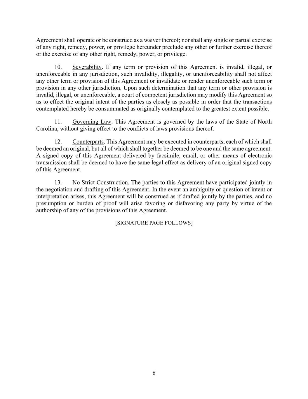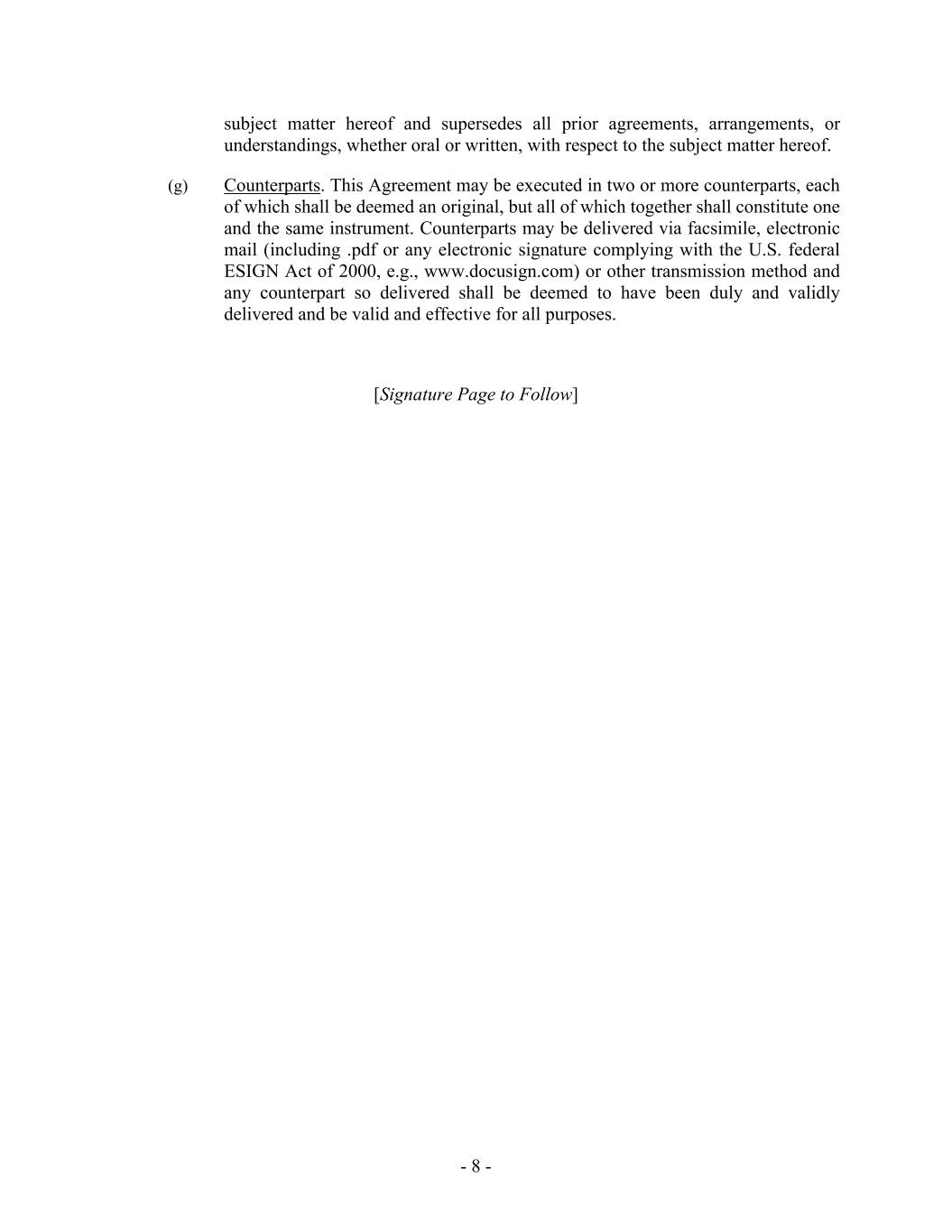 - 8 - subject matter hereof and supersedes all prior agreements, arrangements, or understandings, whether oral or written, with respect to the subject matter hereof. (g) Counterparts. This Agreement may be executed in two or more counterparts, each of which shall be deemed an original, but all of which together shall constitute one and the same instrument. Counterparts may be delivered via facsimile, electronic mail (including .pdf or any electronic signature complying with the U.S. federal ESIGN Act of 2000, e.g., www.docusign.com) or other transmission method and any counterpart so delivered shall be deemed to have been duly and validly delivered and be valid and effective for all purposes. [Signature Page to Follow]
