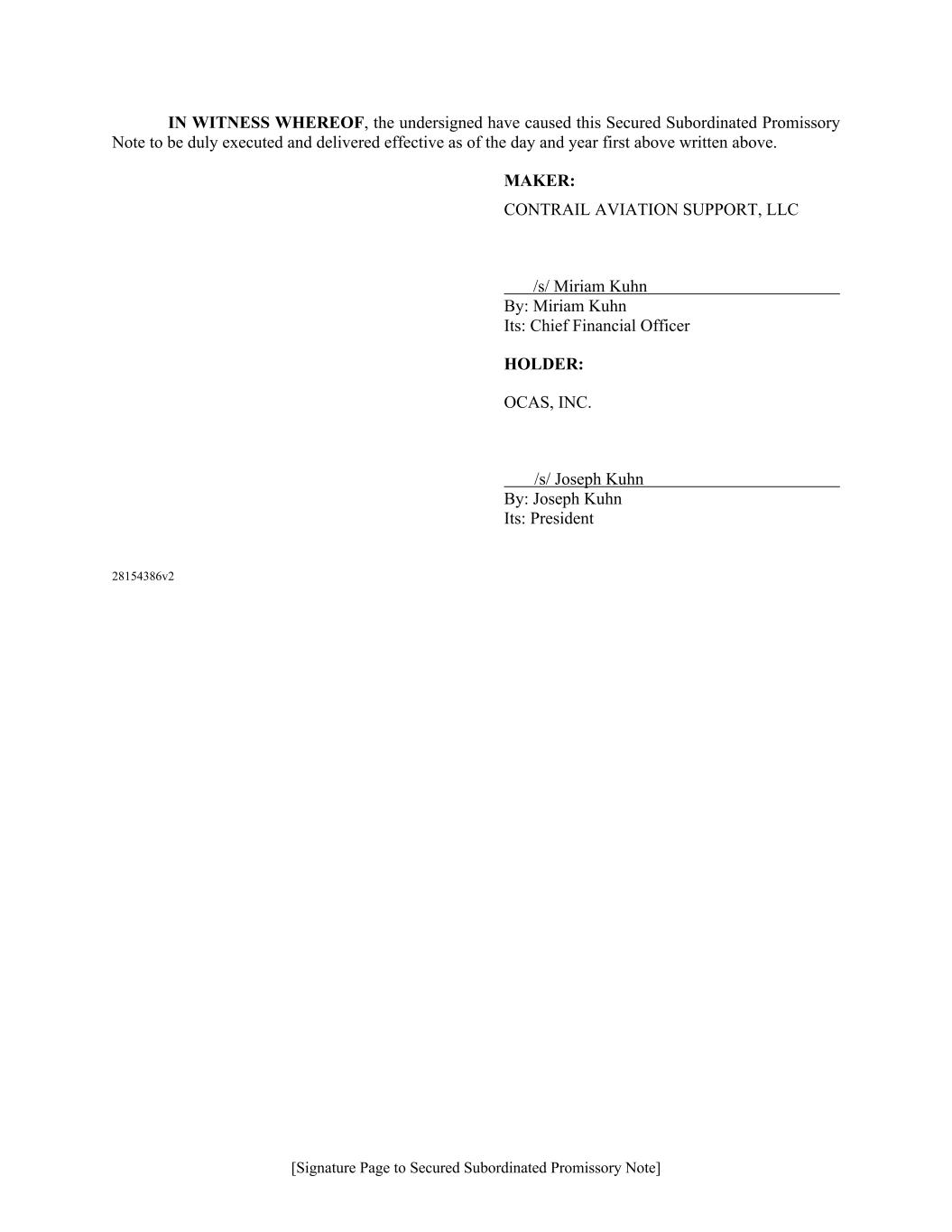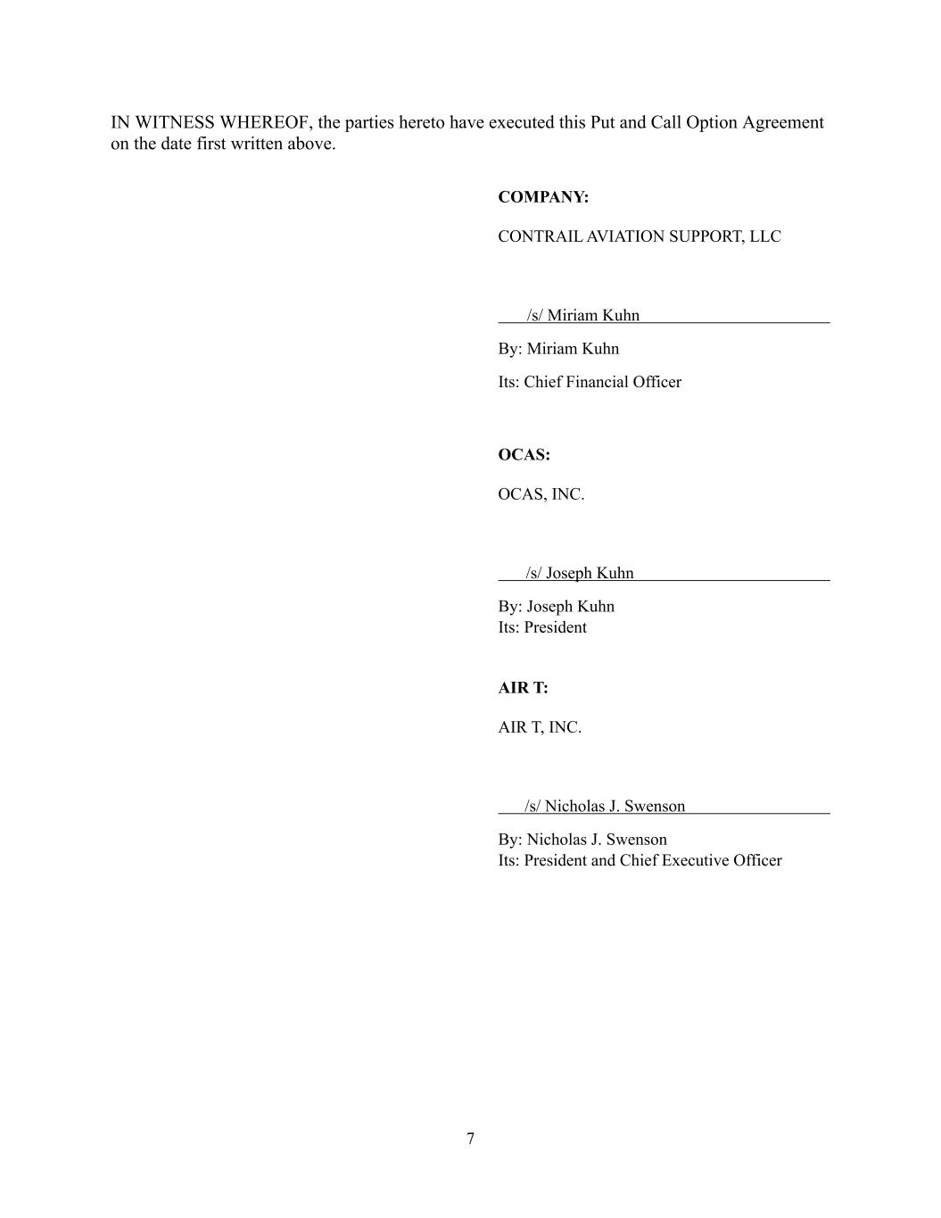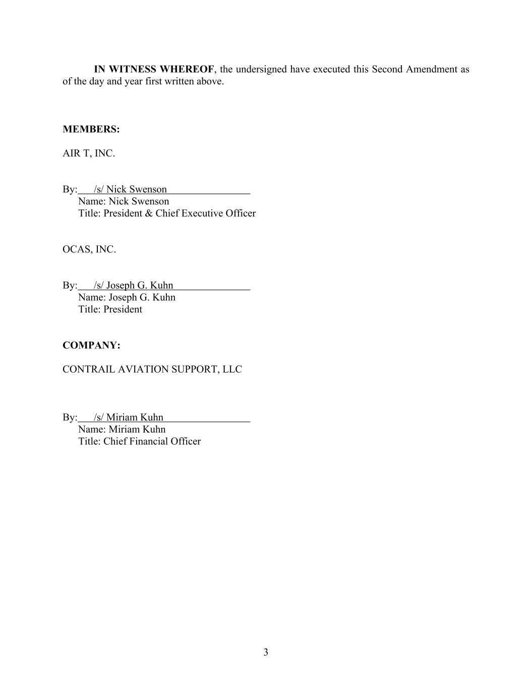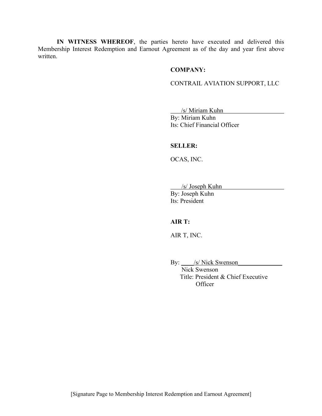 [Signature Page to Membership Interest Redemption and Earnout Agreement] IN WITNESS WHEREOF, the parties hereto have executed and delivered this Membership Interest Redemption and Earnout Agreement as of the day and year first above written. COMPANY: CONTRAIL AVIATION SUPPORT, LLC /s/ Miriam Kuhn By: Miriam Kuhn Its: Chief Financial Officer SELLER: OCAS, INC. /s/ Joseph Kuhn By: Joseph Kuhn Its: President AIR T: AIR T, INC. By: ____/s/ Nick Swenson______________ Nick Swenson Title: President & Chief Executive Officer