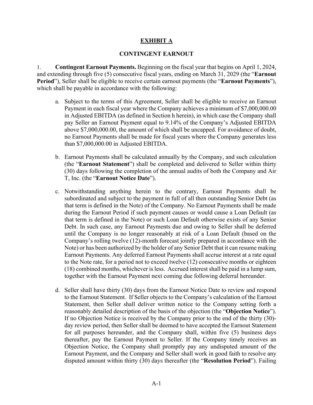 A-1 EXHIBIT A CONTINGENT EARNOUT 1. Contingent Earnout Payments. Beginning on the fiscal year that begins on April 1, 2024, and extending through five (5) consecutive fiscal years, ending on March 31, 2029 (the “Earnout Period”), Seller shall be eligible to receive certain earnout payments (the “Earnout Payments”), which shall be payable in accordance with the following: a. Subject to the terms of this Agreement, Seller shall be eligible to receive an Earnout Payment in each fiscal year where the Company achieves a minimum of $7,000,000.00 in Adjusted EBITDA (as defined in Section h herein), in which case the Company shall pay Seller an Earnout Payment equal to 9.14% of the Company’s Adjusted EBITDA above $7,000,000.00, the amount of which shall be uncapped. For avoidance of doubt, no Earnout Payments shall be made for fiscal years where the Company generates less than $7,000,000.00 in Adjusted EBITDA. b. Earnout Payments shall be calculated annually by the Company, and such calculation (the “Earnout Statement”) shall be completed and delivered to Seller within thirty (30) days following the completion of the annual audits of both the Company and Air T, Inc. (the “Earnout Notice Date”). c. Notwithstanding anything herein to the contrary, Earnout Payments shall be subordinated and subject to the payment in full of all then outstanding Senior Debt (as that term is defined in the Note) of the Company. No Earnout Payments shall be made during the Earnout Period if such payment causes or would cause a Loan Default (as that term is defined in the Note) or such Loan Default otherwise exists of any Senior Debt. In such case, any Earnout Payments due and owing to Seller shall be deferred until the Company is no longer reasonably at risk of a Loan Default (based on the Company’s rolling twelve (12)-month forecast jointly prepared in accordance with the Note) or has been authorized by the holder of any Senior Debt that it can resume making Earnout Payments. Any deferred Earnout Payments shall accrue interest at a rate equal to the Note rate, for a period not to exceed twelve (12) consecutive months or eighteen (18) combined months, whichever is less. Accrued interest shall be paid in a lump sum, together with the Earnout Payment next coming due following deferral hereunder. d. Seller shall have thirty (30) days from the Earnout Notice Date to review and respond to the Earnout Statement. If Seller objects to the Company’s calculation of the Earnout Statement, then Seller shall deliver written notice to the Company setting forth a reasonably detailed description of the basis of the objection (the “Objection Notice”). If no Objection Notice is received by the Company prior to the end of the thirty (30)- day review period, then Seller shall be deemed to have accepted the Earnout Statement for all purposes hereunder, and the Company shall, within five (5) business days thereafter, pay the Earnout Payment to Seller. If the Company timely receives an Objection Notice, the Company shall promptly pay any undisputed amount of the Earnout Payment, and the Company and Seller shall work in good faith to resolve any disputed amount within thirty (30) days thereafter (the “Resolution Period”). Failing