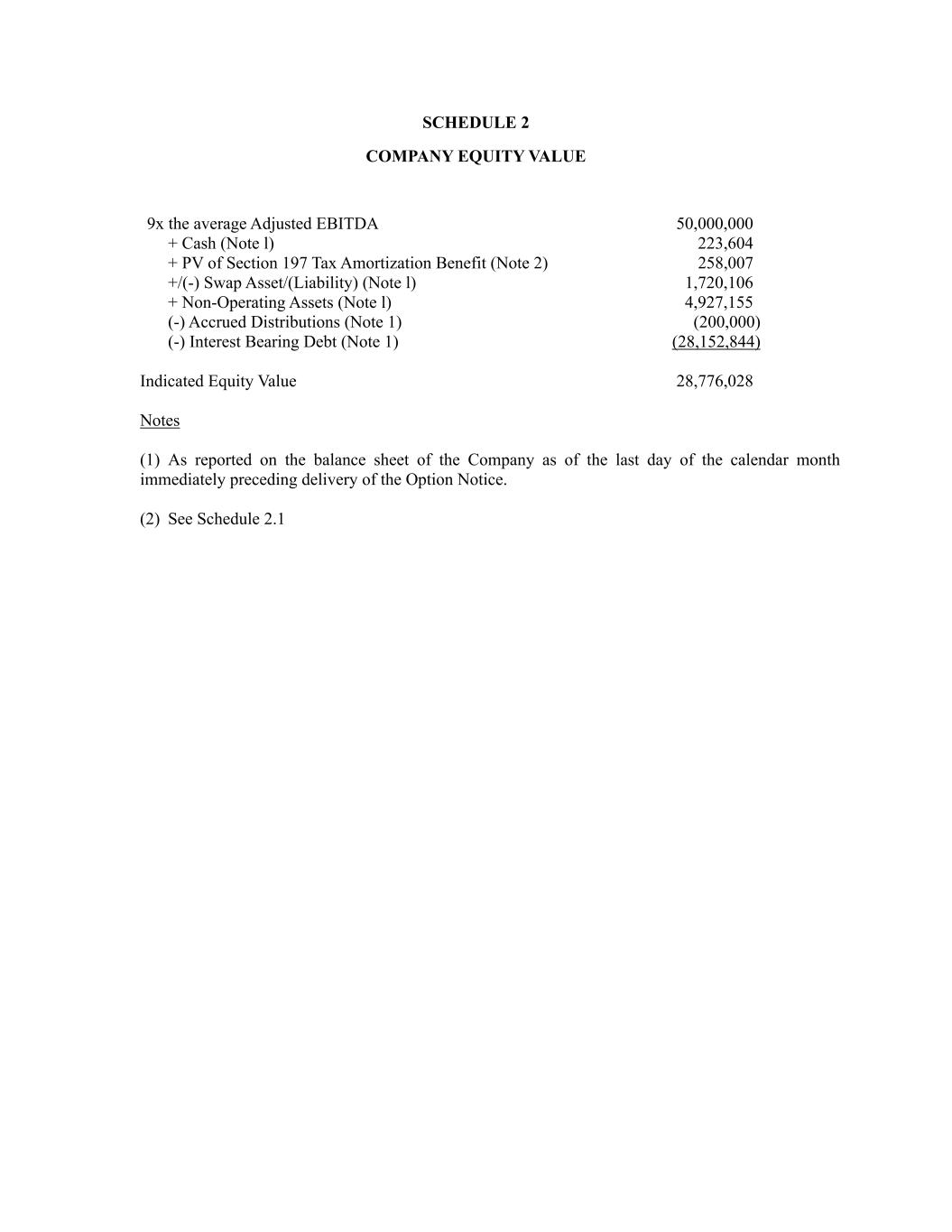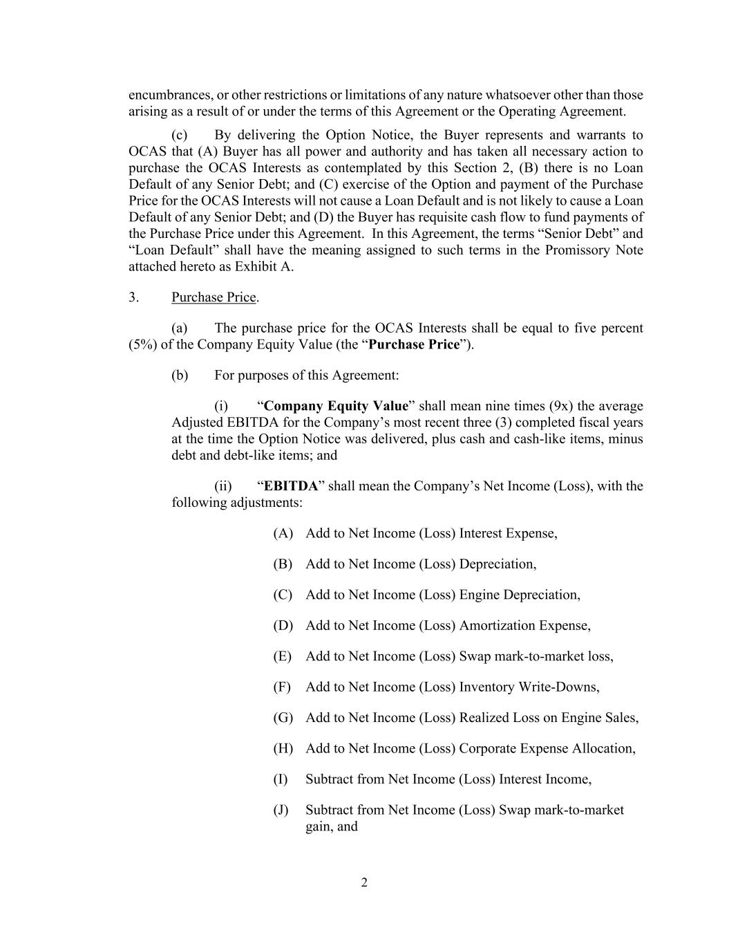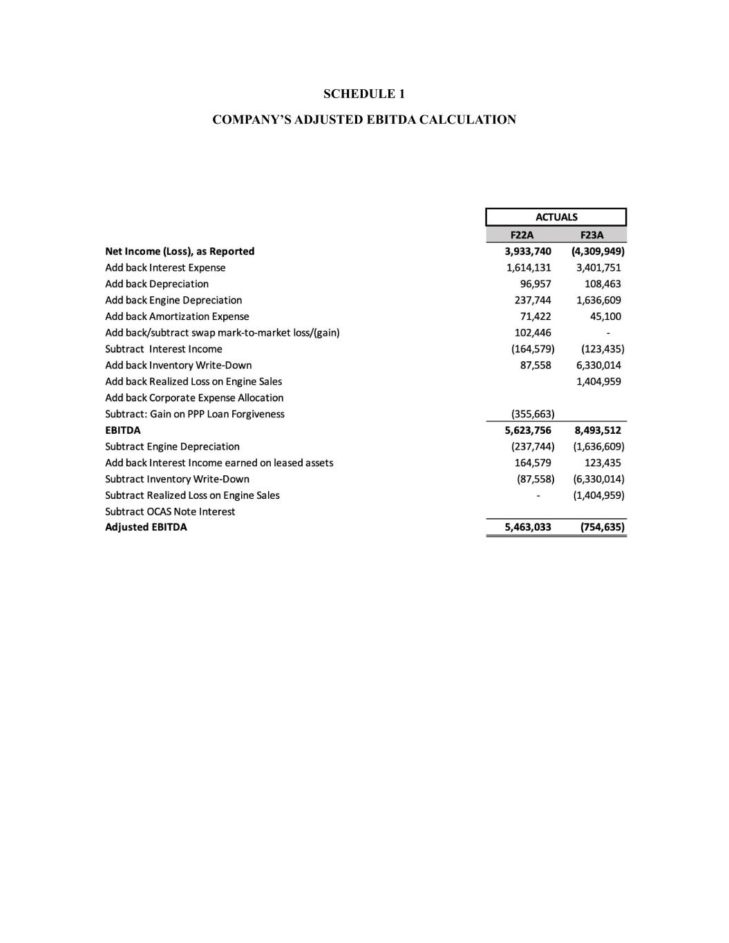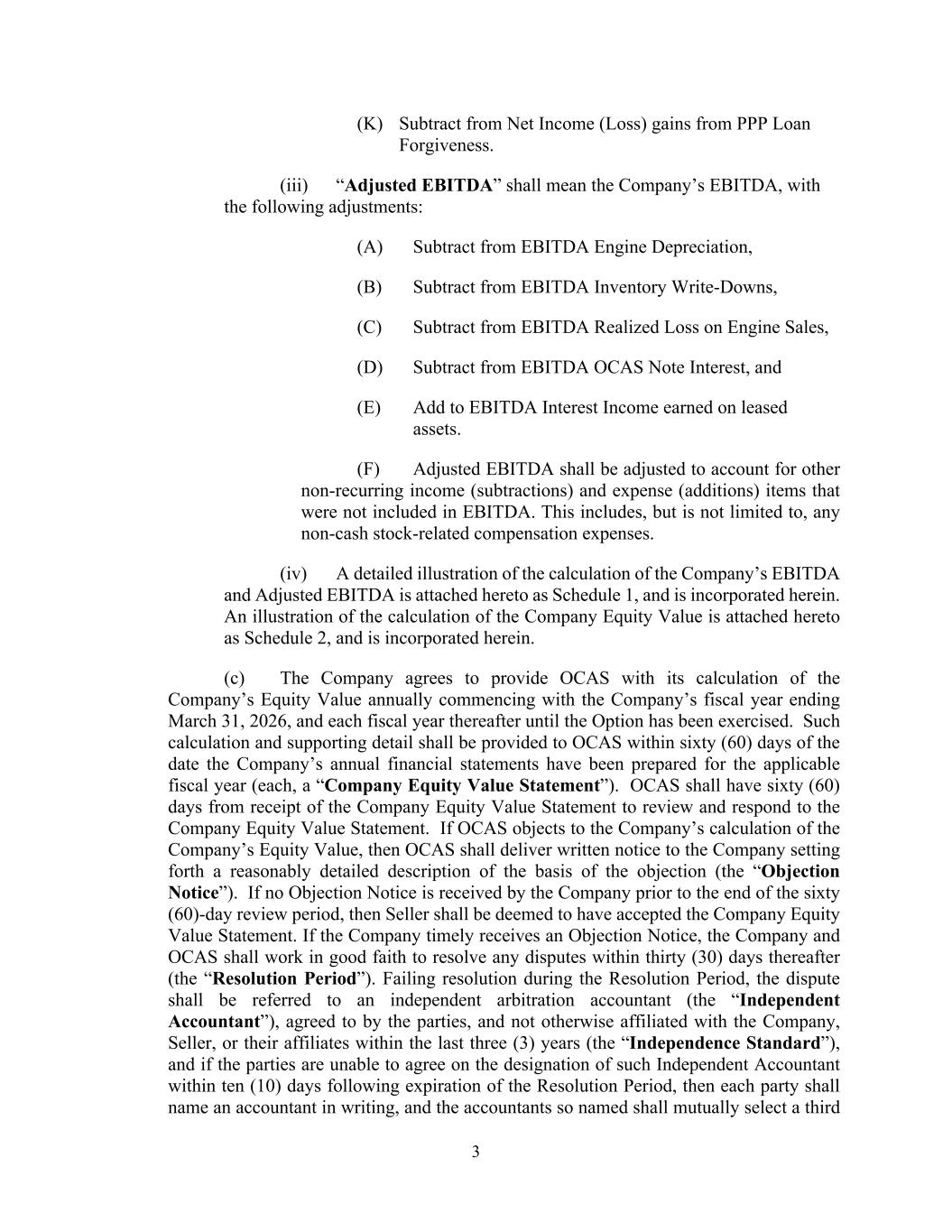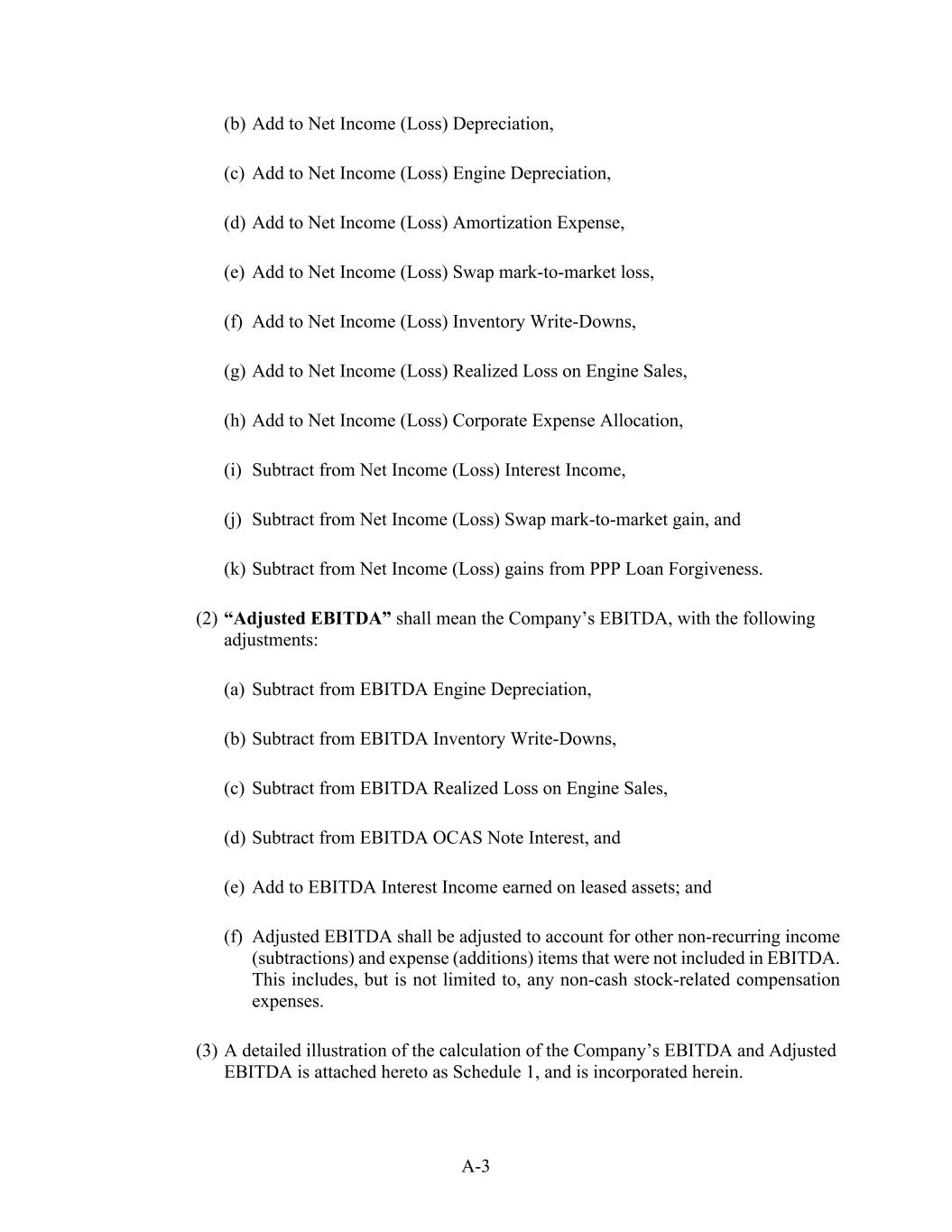 A-3 (b) Add to Net Income (Loss) Depreciation, (c) Add to Net Income (Loss) Engine Depreciation, (d) Add to Net Income (Loss) Amortization Expense, (e) Add to Net Income (Loss) Swap mark-to-market loss, (f) Add to Net Income (Loss) Inventory Write-Downs, (g) Add to Net Income (Loss) Realized Loss on Engine Sales, (h) Add to Net Income (Loss) Corporate Expense Allocation, (i) Subtract from Net Income (Loss) Interest Income, (j) Subtract from Net Income (Loss) Swap mark-to-market gain, and (k) Subtract from Net Income (Loss) gains from PPP Loan Forgiveness. (2) “Adjusted EBITDA” shall mean the Company’s EBITDA, with the following adjustments: (a) Subtract from EBITDA Engine Depreciation, (b) Subtract from EBITDA Inventory Write-Downs, (c) Subtract from EBITDA Realized Loss on Engine Sales, (d) Subtract from EBITDA OCAS Note Interest, and (e) Add to EBITDA Interest Income earned on leased assets; and (f) Adjusted EBITDA shall be adjusted to account for other non-recurring income (subtractions) and expense (additions) items that were not included in EBITDA. This includes, but is not limited to, any non-cash stock-related compensation expenses. (3) A detailed illustration of the calculation of the Company’s EBITDA and Adjusted EBITDA is attached hereto as Schedule 1, and is incorporated herein.