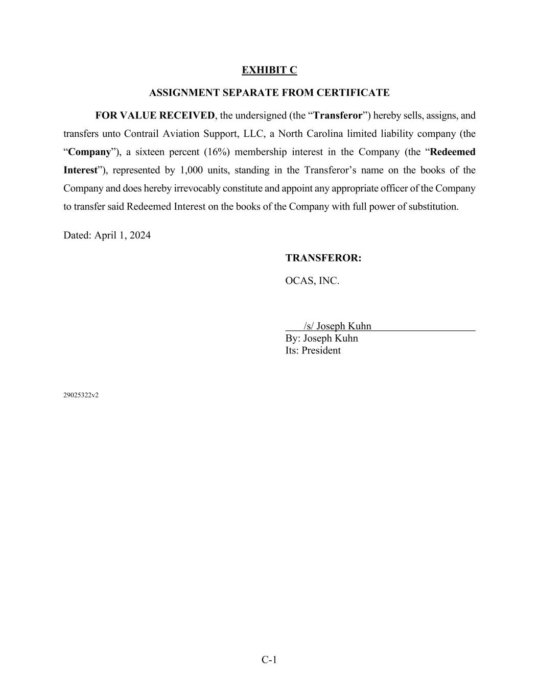 C-1 EXHIBIT C ASSIGNMENT SEPARATE FROM CERTIFICATE FOR VALUE RECEIVED, the undersigned (the “Transferor”) hereby sells, assigns, and transfers unto Contrail Aviation Support, LLC, a North Carolina limited liability company (the “Company”), a sixteen percent (16%) membership interest in the Company (the “Redeemed Interest”), represented by 1,000 units, standing in the Transferor’s name on the books of the Company and does hereby irrevocably constitute and appoint any appropriate officer of the Company to transfer said Redeemed Interest on the books of the Company with full power of substitution. Dated: April 1, 2024 TRANSFEROR: OCAS, INC. /s/ Joseph Kuhn By: Joseph Kuhn Its: President 29025322v2
