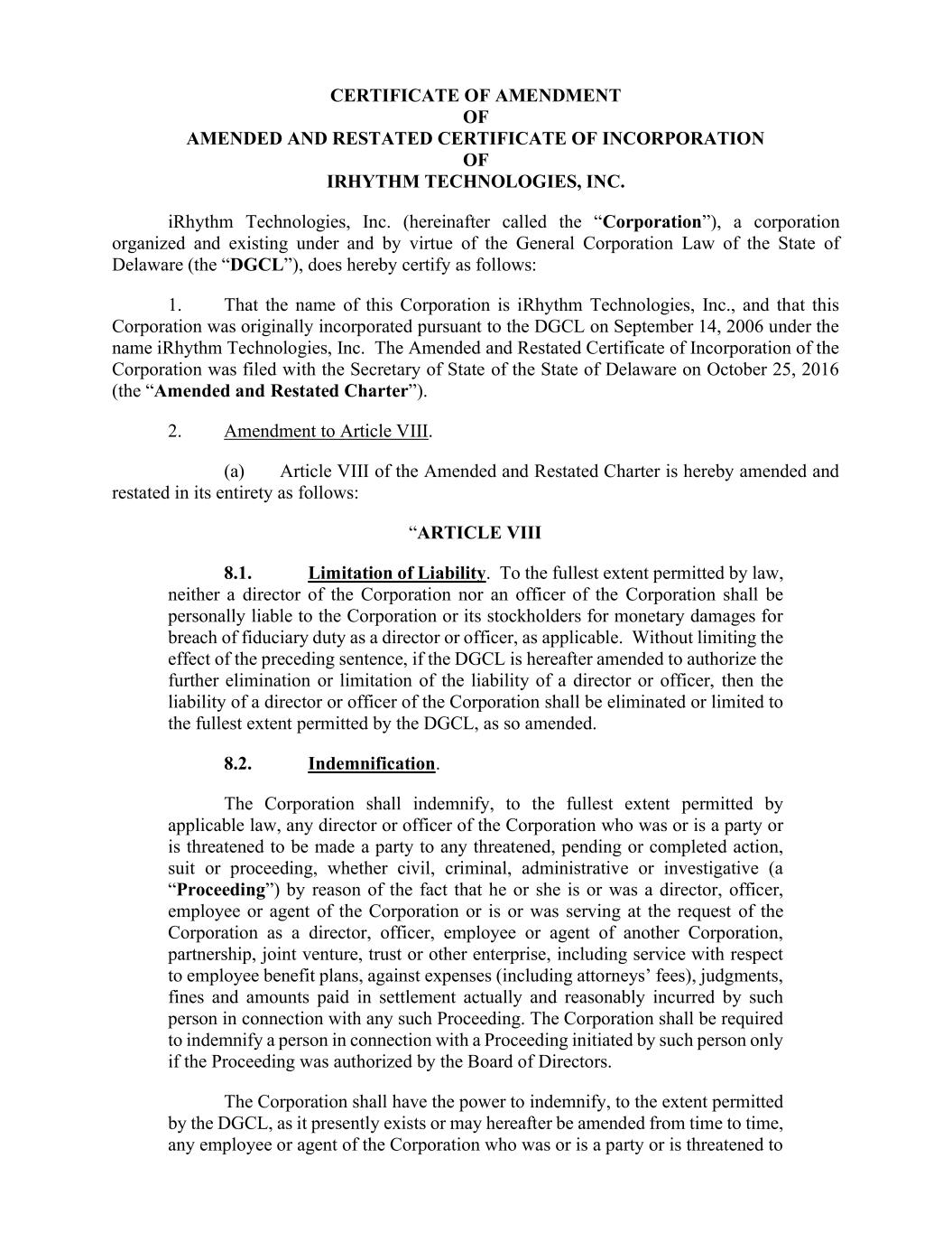 CERTIFICATE OF AMENDMENT OF AMENDED AND RESTATED CERTIFICATE OF INCORPORATION OF IRHYTHM TECHNOLOGIES, INC. iRhythm Technologies, Inc. (hereinafter called the “Corporation”), a corporation organized and existing under and by virtue of the General Corporation Law of the State of Delaware (the “DGCL”), does hereby certify as follows: 1. That the name of this Corporation is iRhythm Technologies, Inc., and that this Corporation was originally incorporated pursuant to the DGCL on September 14, 2006 under the name iRhythm Technologies, Inc. The Amended and Restated Certificate of Incorporation of the Corporation was filed with the Secretary of State of the State of Delaware on October 25, 2016 (the “Amended and Restated Charter”). 2. Amendment to Article VIII. (a) Article VIII of the Amended and Restated Charter is hereby amended and restated in its entirety as follows: “ARTICLE VIII 8.1. Limitation of Liability. To the fullest extent permitted by law, neither a director of the Corporation nor an officer of the Corporation shall be personally liable to the Corporation or its stockholders for monetary damages for breach of fiduciary duty as a director or officer, as applicable. Without limiting the effect of the preceding sentence, if the DGCL is hereafter amended to authorize the further elimination or limitation of the liability of a director or officer, then the liability of a director or officer of the Corporation shall be eliminated or limited to the fullest extent permitted by the DGCL, as so amended. 8.2. Indemnification. The Corporation shall indemnify, to the fullest extent permitted by applicable law, any director or officer of the Corporation who was or is a party or is threatened to be made a party to any threatened, pending or completed action, suit or proceeding, whether civil, criminal, administrative or investigative (a “Proceeding”) by reason of the fact that he or she is or was a director, officer, employee or agent of the Corporation or is or was serving at the request of the Corporation as a director, officer, employee or agent of another Corporation, partnership, joint venture, trust or other enterprise, including service with respect to employee benefit plans, against expenses (including attorneys’ fees), judgments, fines and amounts paid in settlement actually and reasonably incurred by such person in connection with any such Proceeding. The Corporation shall be required to indemnify a person in connection with a Proceeding initiated by such person only if the Proceeding was authorized by the Board of Directors. The Corporation shall have the power to indemnify, to the extent permitted by the DGCL, as it presently exists or may hereafter be amended from time to time, any employee or agent of the Corporation who was or is a party or is threatened to