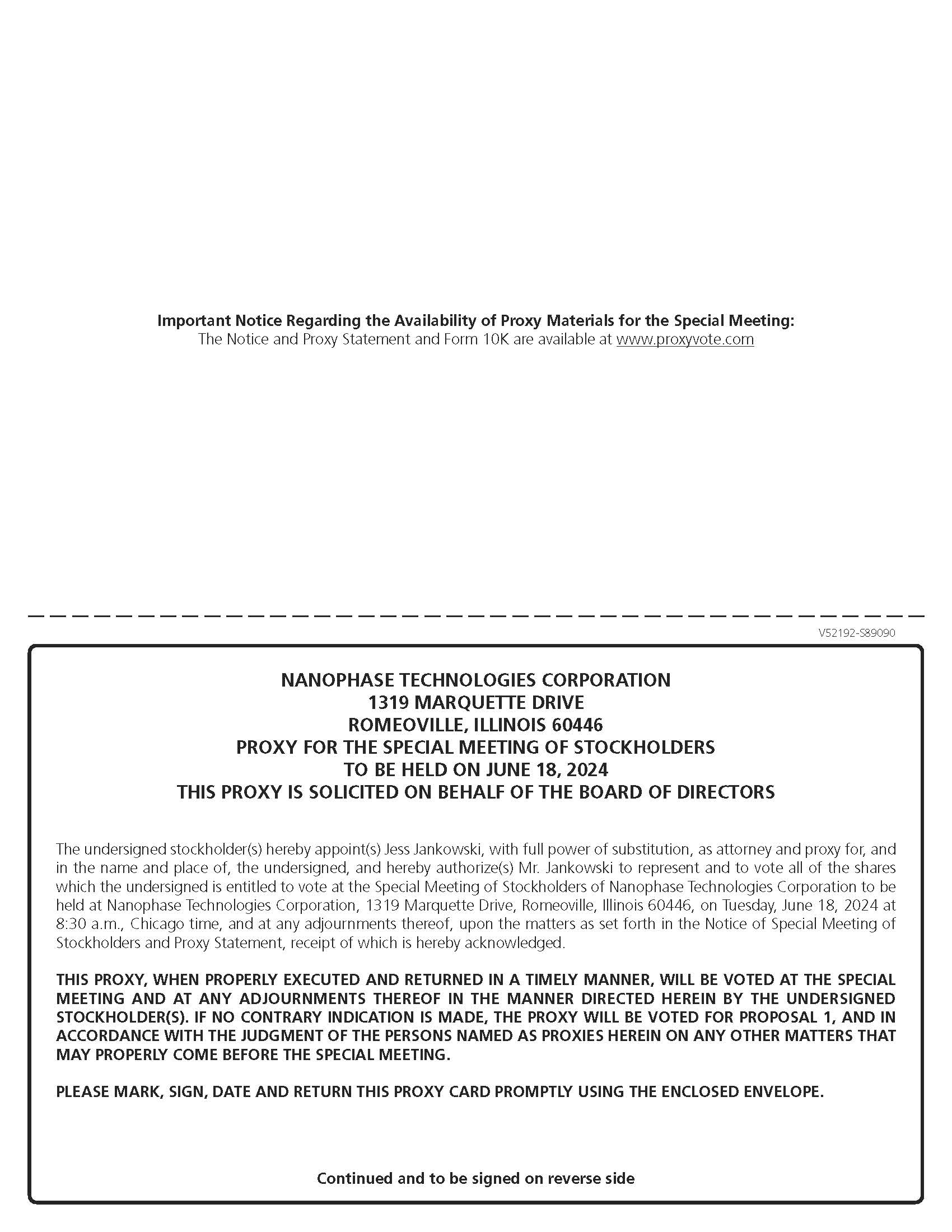 Nanophase has furnished these materials to you in connection with the Company’s solicitation of proxies for use at the Special Meeting of Stockholders to be held on June 18, 2024, at 8:30AM Central Time, at the Company’s corporate headquarters located at 1319 Marquette Drive, Romeoville, Illinois. These materials have also been made available to you on the internet. These materials describe the proposal on which the Company would like you to vote and also give you information on this proposal so that you can make an informed decision. We are furnishing our proxy materials on or about May 31, 2024, to all stockholders of record entitled to vote at the Special Meeting.