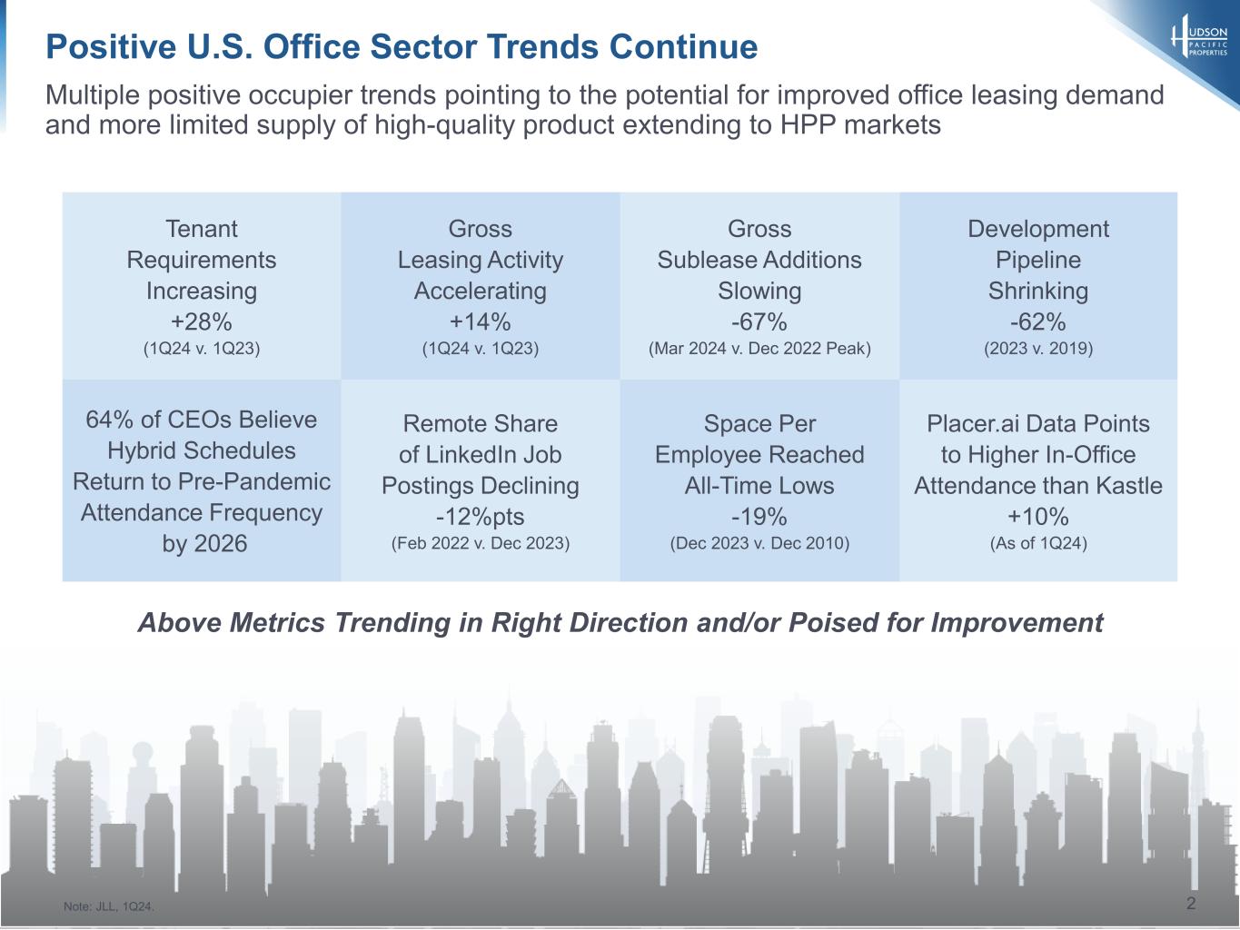 Multiple positive occupier trends pointing to the potential for improved office leasing demand and more limited supply of high-quality product extending to HPP markets Positive U.S. Office Sector Trends Continue 2Note: JLL, 1Q24. Tenant Requirements Increasing +28% (1Q24 v. 1Q23) Gross Leasing Activity Accelerating +14% (1Q24 v. 1Q23) Gross Sublease Additions Slowing -67% (Mar 2024 v. Dec 2022 Peak) Development Pipeline Shrinking -62% (2023 v. 2019) 64% of CEOs Believe Hybrid Schedules Return to Pre-Pandemic Attendance Frequency by 2026 Remote Share of LinkedIn Job Postings Declining -12%pts (Feb 2022 v. Dec 2023) Space Per Employee Reached All-Time Lows -19% (Dec 2023 v. Dec 2010) Placer.ai Data Points to Higher In-Office Attendance than Kastle +10% (As of 1Q24) Above Metrics Trending in Right Direction and/or Poised for Improvement