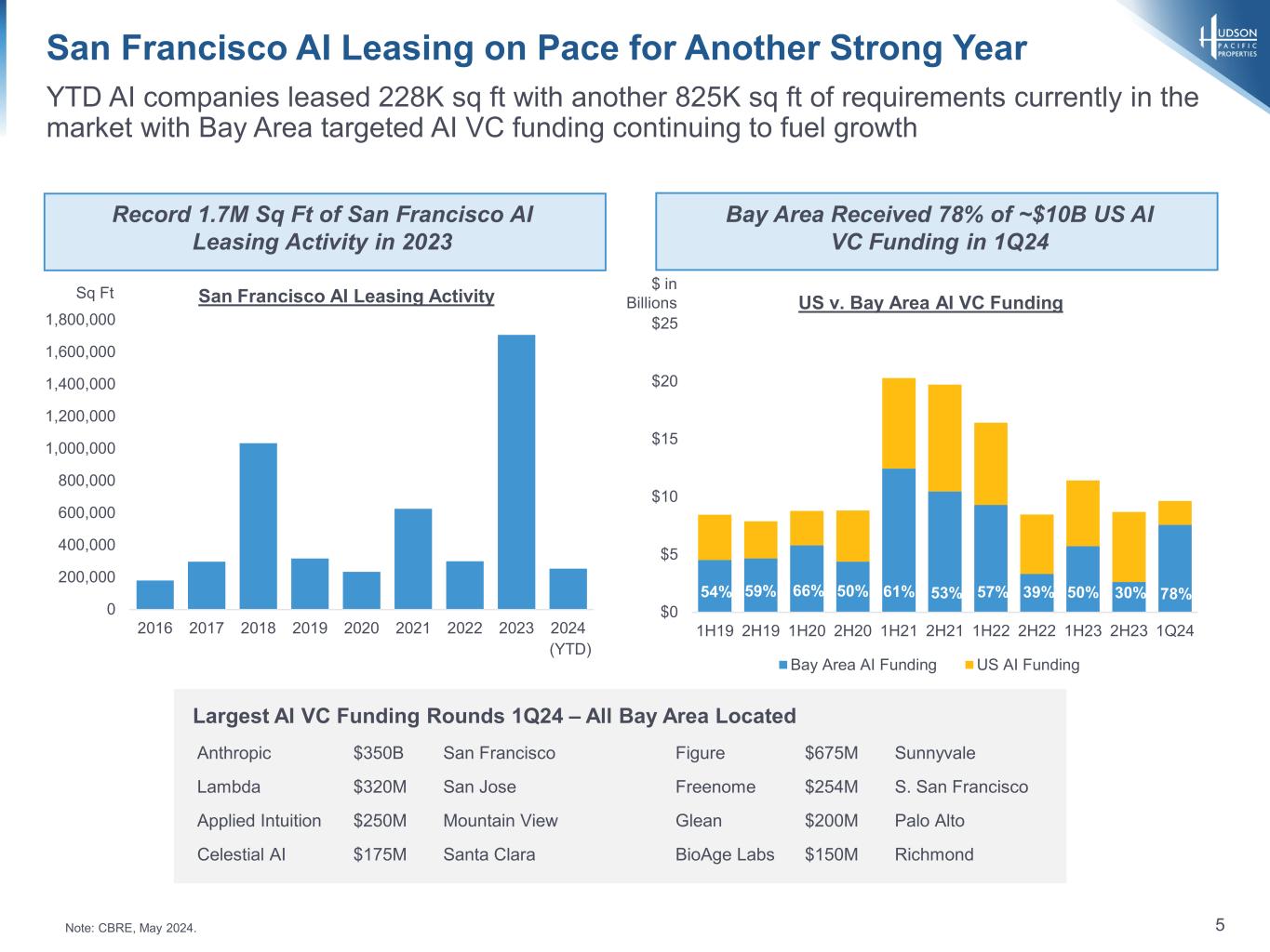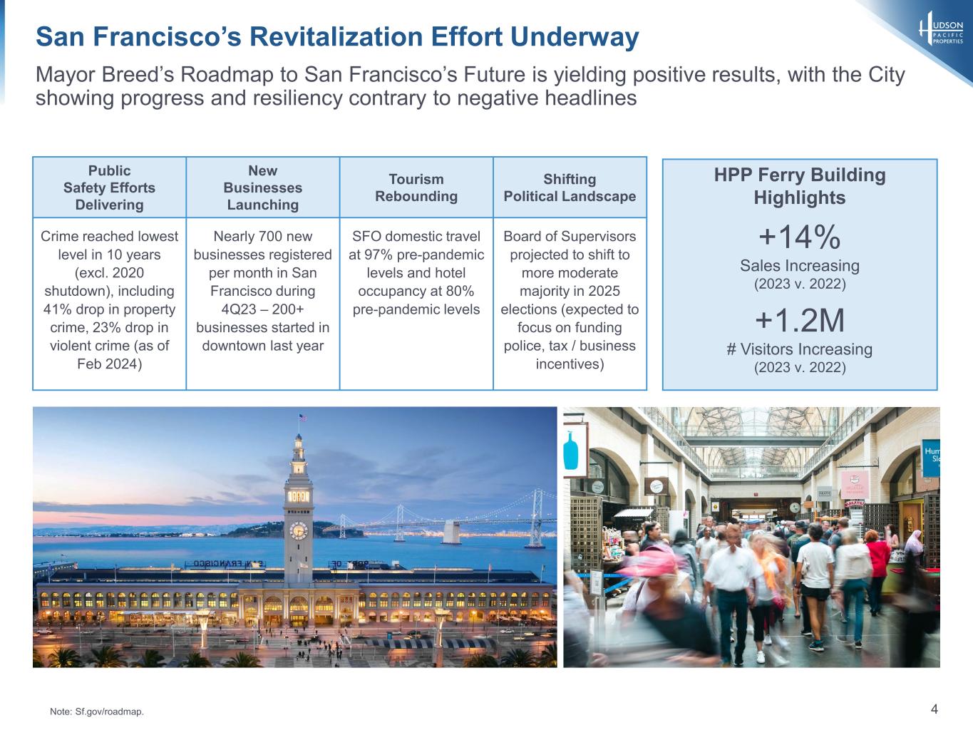HPP’s markets are showing signs of stabilizing, such as increased or consistent tenant demand, declining or stable sublease vacancy, and diminishing new supply pipelines Office Leasing Green Shoots in HPP Markets 3 W. Los Angeles San Francisco San Francisco Peninsula Silicon Valley Seattle Vancouver Tenant Demand 3.2M Sq Ft Increased 6.4M Sq Ft Increased to highest level since 1Q20 2.3M Sq Ft Stable 5.6M Sq Ft Increased 30% 1.8M Sq Ft Stable 450K Sq Ft Stable Sublease Availability 2.9M Sq Ft Decreased for 3rd consecutive quarter 8.9M Sq Ft Decreased by 400K sq ft 3.0M Sq Ft Stable 5.6M Sq Ft Decreased by 500K sq ft 3.9M Sq Ft Stable 670K Sq Ft Decreased by 75K sq ft Under Construction as % of Inventory 2.0% Decreased ~130 bps YOY 0% Decreased – no new supply 2.5% Stable 1.0% Decreased ~290 bps YOY 1.7% Decreased ~370 bps YOY 3.7% Decreased ~260 bps YOY Note: CBRE, 1Q24. Positive Market Trends – 1Q24 v. 4Q23 (Unless Otherwise Indicated)