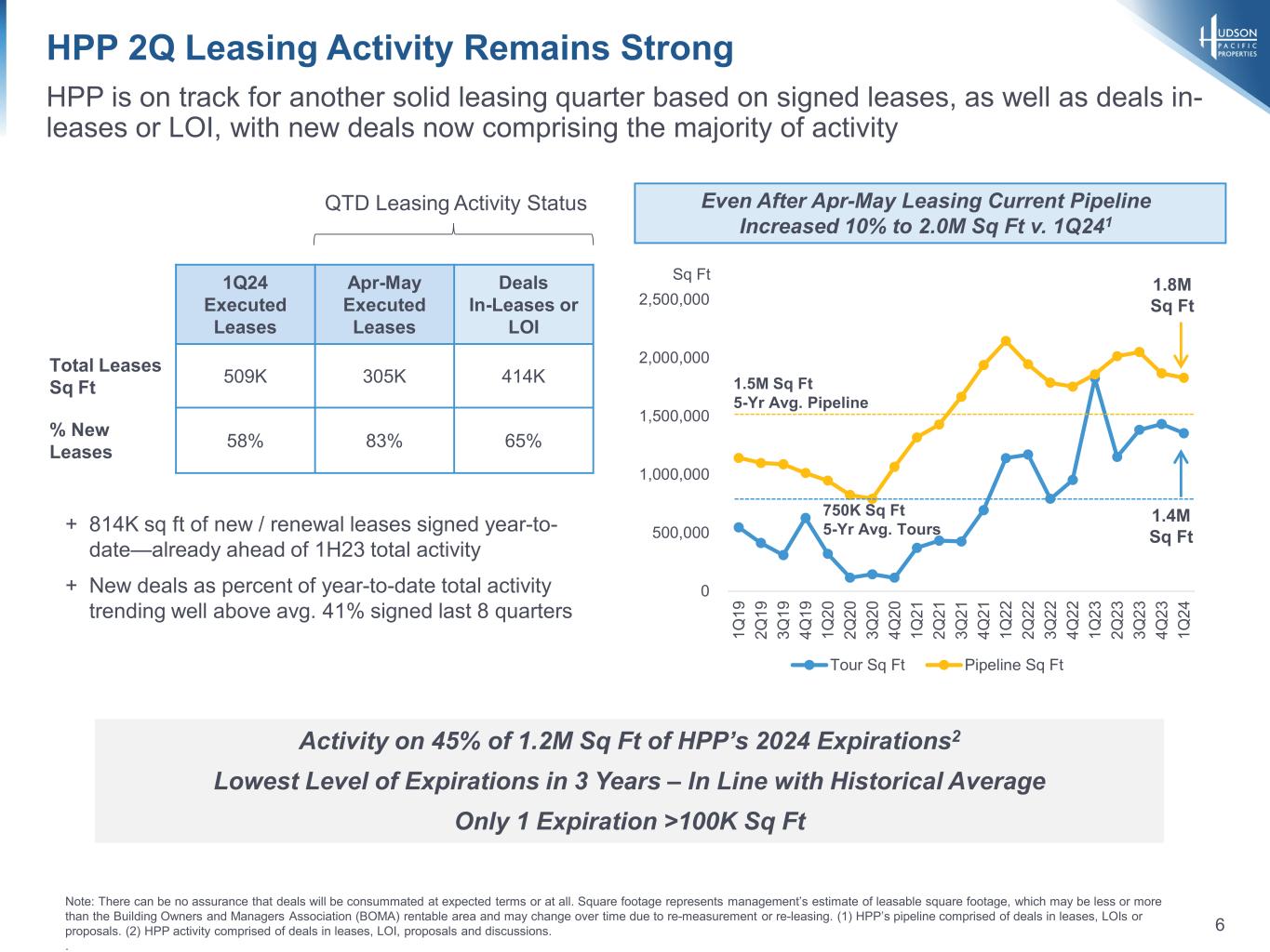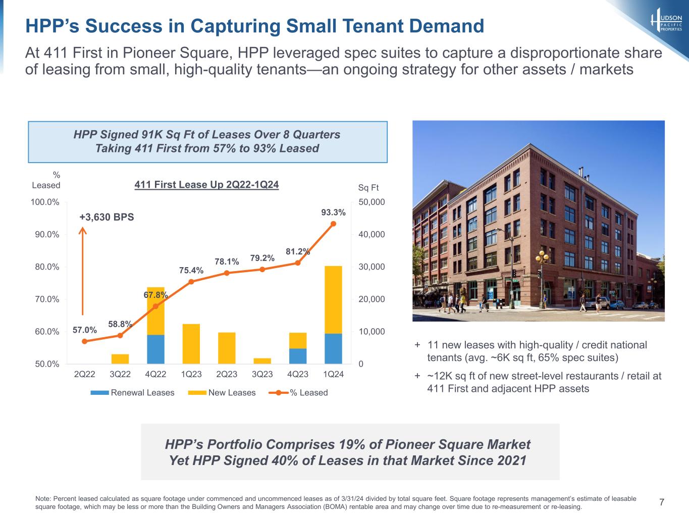 0 500,000 1,000,000 1,500,000 2,000,000 2,500,000 1Q 19 2Q 19 3Q 19 4Q 19 1Q 20 2Q 20 3Q 20 4Q 20 1Q 21 2Q 21 3Q 21 4Q 21 1Q 22 2Q 22 3Q 22 4Q 22 1Q 23 2Q 23 3Q 23 4Q 23 1Q 24 Tour Sq Ft Pipeline Sq Ft 1.8M Sq Ft 1.4M Sq Ft HPP is on track for another solid leasing quarter based on signed leases, as well as deals in- leases or LOI, with new deals now comprising the majority of activity HPP 2Q Leasing Activity Remains Strong 6 Note: There can be no assurance that deals will be consummated at expected terms or at all. Square footage represents management’s estimate of leasable square footage, which may be less or more than the Building Owners and Managers Association (BOMA) rentable area and may change over time due to re-measurement or re-leasing. (1) HPP’s pipeline comprised of deals in leases, LOIs or proposals. (2) HPP activity comprised of deals in leases, LOI, proposals and discussions. . 1Q24 Executed Leases Apr-May Executed Leases Deals In-Leases or LOI Total Leases Sq Ft 509K 305K 414K % New Leases 58% 83% 65% Activity on 45% of 1.2M Sq Ft of HPP’s 2024 Expirations2 Lowest Level of Expirations in 3 Years – In Line with Historical Average Only 1 Expiration >100K Sq Ft + 814K sq ft of new / renewal leases signed year-to- date—already ahead of 1H23 total activity + New deals as percent of year-to-date total activity trending well above avg. 41% signed last 8 quarters Even After Apr-May Leasing Current Pipeline Increased 10% to 2.0M Sq Ft v. 1Q241 Sq Ft QTD Leasing Activity Status 1.5M Sq Ft 5-Yr Avg. Pipeline 750K Sq Ft 5-Yr Avg. Tours