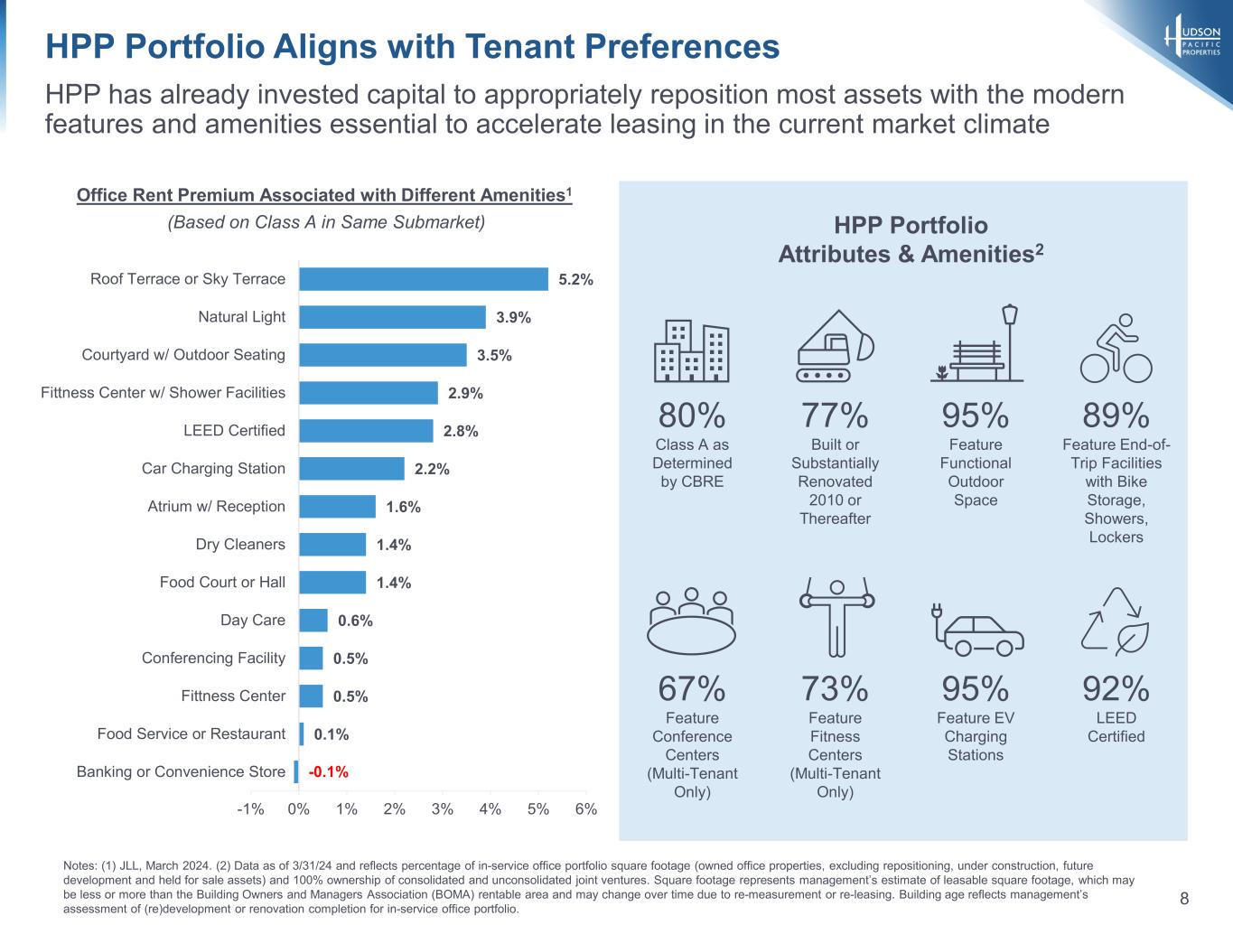 57.0% 58.8% 67.8% 75.4% 78.1% 79.2% 81.2% 93.3% 0 10,000 20,000 30,000 40,000 50,000 50.0% 60.0% 70.0% 80.0% 90.0% 100.0% 2Q22 3Q22 4Q22 1Q23 2Q23 3Q23 4Q23 1Q24 Renewal Leases New Leases % Leased At 411 First in Pioneer Square, HPP leveraged spec suites to capture a disproportionate share of leasing from small, high-quality tenants—an ongoing strategy for other assets / markets HPP’s Success in Capturing Small Tenant Demand 7 HPP Signed 91K Sq Ft of Leases Over 8 Quarters Taking 411 First from 57% to 93% Leased % Leased Sq Ft HPP’s Portfolio Comprises 19% of Pioneer Square Market Yet HPP Signed 40% of Leases in that Market Since 2021 +3,630 BPS + 11 new leases with high-quality / credit national tenants (avg. ~6K sq ft, 65% spec suites) + ~12K sq ft of new street-level restaurants / retail at 411 First and adjacent HPP assets 411 First Lease Up 2Q22-1Q24 Note: Percent leased calculated as square footage under commenced and uncommenced leases as of 3/31/24 divided by total square feet. Square footage represents management’s estimate of leasable square footage, which may be less or more than the Building Owners and Managers Association (BOMA) rentable area and may change over time due to re-measurement or re-leasing.