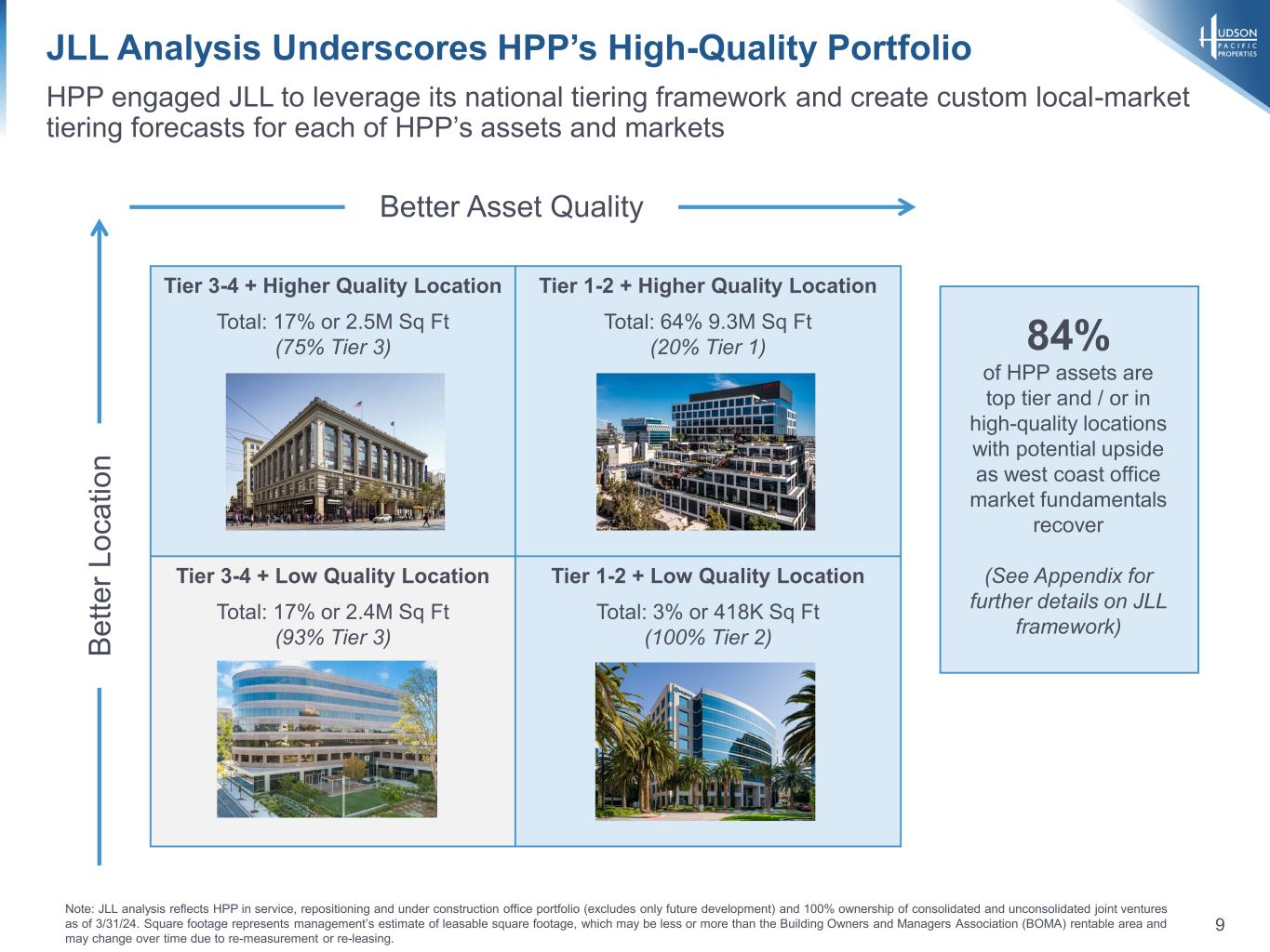 80% Class A as Determined by CBRE 77% Built or Substantially Renovated 2010 or Thereafter 95% Feature Functional Outdoor Space 89% Feature End-of- Trip Facilities with Bike Storage, Showers, Lockers 67% Feature Conference Centers (Multi-Tenant Only) 73% Feature Fitness Centers (Multi-Tenant Only) 95% Feature EV Charging Stations 92% LEED Certified HPP has already invested capital to appropriately reposition most assets with the modern features and amenities essential to accelerate leasing in the current market climate HPP Portfolio Aligns with Tenant Preferences 8 Notes: (1) JLL, March 2024. (2) Data as of 3/31/24 and reflects percentage of in-service office portfolio square footage (owned office properties, excluding repositioning, under construction, future development and held for sale assets) and 100% ownership of consolidated and unconsolidated joint ventures. Square footage represents management’s estimate of leasable square footage, which may be less or more than the Building Owners and Managers Association (BOMA) rentable area and may change over time due to re-measurement or re-leasing. Building age reflects management’s assessment of (re)development or renovation completion for in-service office portfolio. 0.1% 0.5% 0.5% 0.6% 1.4% 1.4% 1.6% 2.2% 2.8% 2.9% 3.5% 3.9% 5.2% -1% 0% 1% 2% 3% 4% 5% 6% Banking or Convenience Store Food Service or Restaurant Fittness Center Conferencing Facility Day Care Food Court or Hall Dry Cleaners Atrium w/ Reception Car Charging Station LEED Certified Fittness Center w/ Shower Facilities Courtyard w/ Outdoor Seating Natural Light Roof Terrace or Sky Terrace Office Rent Premium Associated with Different Amenities1 -0.1% (Based on Class A in Same Submarket) HPP Portfolio Attributes & Amenities2