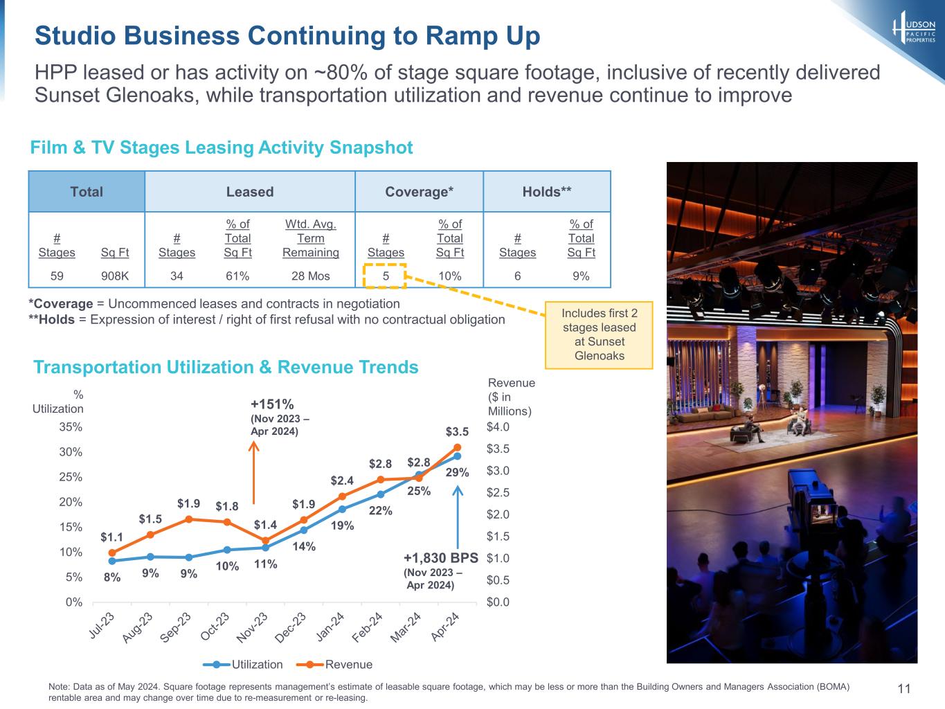 8% 9% 9% 10% 11% 14% 19% 22% 25% 29% $1.1 $1.5 $1.9 $1.8 $1.4 $1.9 $2.4 $2.8 $2.8 $3.5 $0.0 $0.5 $1.0 $1.5 $2.0 $2.5 $3.0 $3.5 $4.0 0% 5% 10% 15% 20% 25% 30% 35% Utilization Revenue HPP leased or has activity on ~80% of stage square footage, inclusive of recently delivered Sunset Glenoaks, while transportation utilization and revenue continue to improve Studio Business Continuing to Ramp Up 11Note: Data as of May 2024. Square footage represents management’s estimate of leasable square footage, which may be less or more than the Building Owners and Managers Association (BOMA) rentable area and may change over time due to re-measurement or re-leasing. Film & TV Stages Leasing Activity Snapshot Total Leased Coverage* Holds** # Stages Sq Ft # Stages % of Total Sq Ft Wtd. Avg. Term Remaining # Stages % of Total Sq Ft # Stages % of Total Sq Ft 59 908K 34 61% 28 Mos 5 10% 6 9% *Coverage = Uncommenced leases and contracts in negotiation **Holds = Expression of interest / right of first refusal with no contractual obligation Transportation Utilization & Revenue Trends % Utilization Revenue ($ in Millions)+151% (Nov 2023 – Apr 2024) +1,830 BPS (Nov 2023 – Apr 2024) Includes first 2 stages leased at Sunset Glenoaks