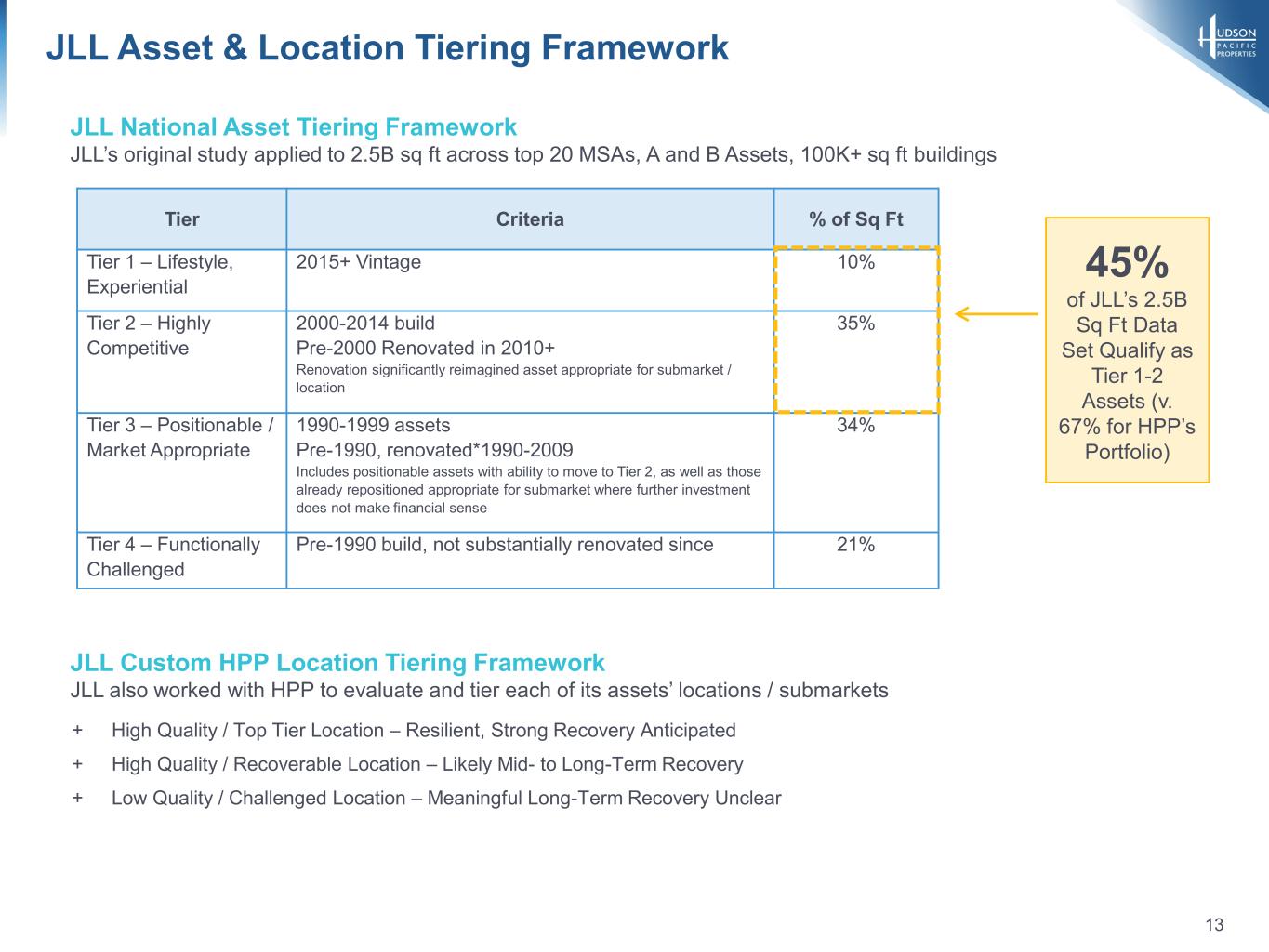JLL Asset & Location Tiering Framework 13 JLL National Asset Tiering Framework JLL’s original study applied to 2.5B sq ft across top 20 MSAs, A and B Assets, 100K+ sq ft buildings Tier Criteria % of Sq Ft Tier 1 – Lifestyle, Experiential 2015+ Vintage 10% Tier 2 – Highly Competitive 2000-2014 build Pre-2000 Renovated in 2010+ Renovation significantly reimagined asset appropriate for submarket / location 35% Tier 3 – Positionable / Market Appropriate 1990-1999 assets Pre-1990, renovated*1990-2009 Includes positionable assets with ability to move to Tier 2, as well as those already repositioned appropriate for submarket where further investment does not make financial sense 34% Tier 4 – Functionally Challenged Pre-1990 build, not substantially renovated since 21% JLL Custom HPP Location Tiering Framework JLL also worked with HPP to evaluate and tier each of its assets’ locations / submarkets + High Quality / Top Tier Location – Resilient, Strong Recovery Anticipated + High Quality / Recoverable Location – Likely Mid- to Long-Term Recovery + Low Quality / Challenged Location – Meaningful Long-Term Recovery Unclear 45% of JLL’s 2.5B Sq Ft Data Set Qualify as Tier 1-2 Assets (v. 67% for HPP’s Portfolio)