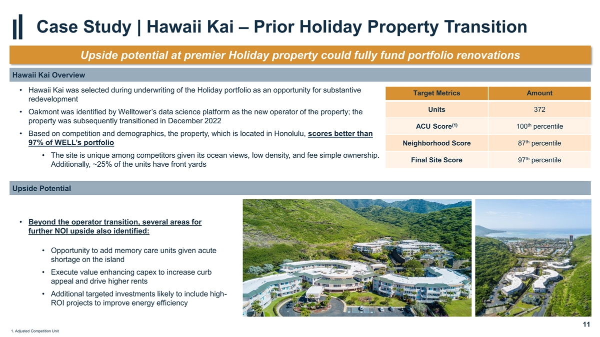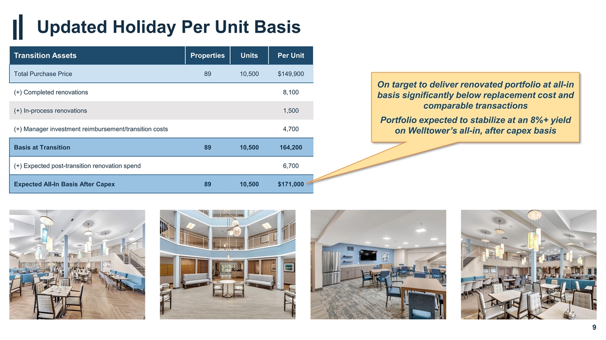 Updated Holiday Per Unit Basis Transition Assets Properties Units Per Unit Total Purchase Price 89 10,500 $149,900 On target to deliver renovated portfolio at all-in (+) Completed renovations 8,100 basis significantly below replacement cost and comparable transactions (+) In-process renovations 1,500 Portfolio expected to stabilize at an 8%+ yield (+) Manager investment reimbursement/transition costs 4,700 on Welltower’s all-in, after capex basis Basis at Transition 89 10,500 164,200 (+) Expected post-transition renovation spend 6,700 Expected All-In Basis After Capex 89 10,500 $171,000 9