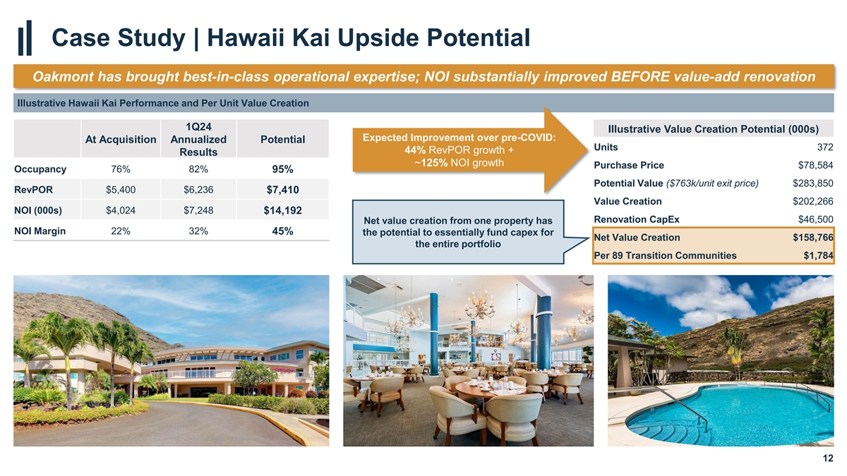 Case Study | Hawaii Kai – Prior Holiday Property Transition Upside potential at premier Holiday property could fully fund portfolio renovations Hawaii Kai Overview • Hawaii Kai was selected during underwriting of the Holiday portfolio as an opportunity for substantive Target Metrics Amount redevelopment Units 372 • Oakmont was identified by Welltower’s data science platform as the new operator of the property; the property was subsequently transitioned in December 2022 (1) th ACU Score 100 percentile • Based on competition and demographics, the property, which is located in Honolulu, scores better than th 97% of WELL’s portfolio Neighborhood Score 87 percentile • The site is unique among competitors given its ocean views, low density, and fee simple ownership. th Final Site Score 97 percentile Additionally, ~25% of the units have front yards Upside Potential • Beyond the operator transition, several areas for further NOI upside also identified: • Opportunity to add memory care units given acute shortage on the island • Execute value enhancing capex to increase curb appeal and drive higher rents • Additional targeted investments likely to include high- ROI projects to improve energy efficiency 11 1. Adjusted Competition Unit