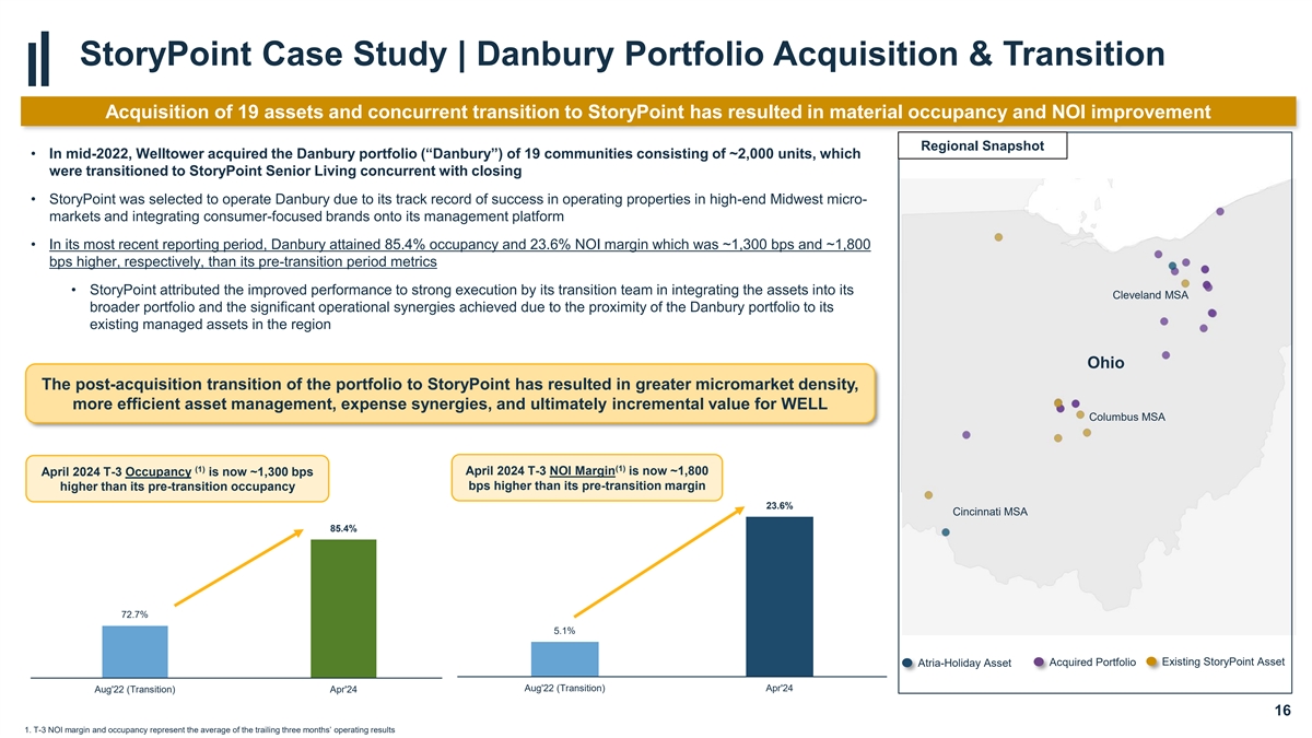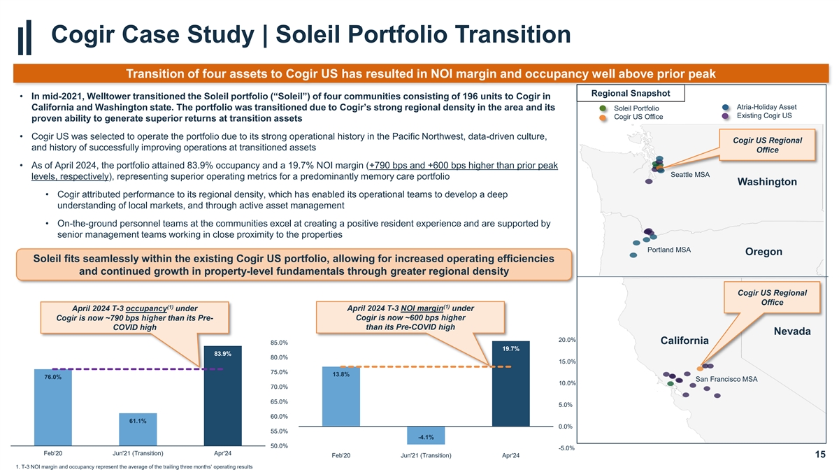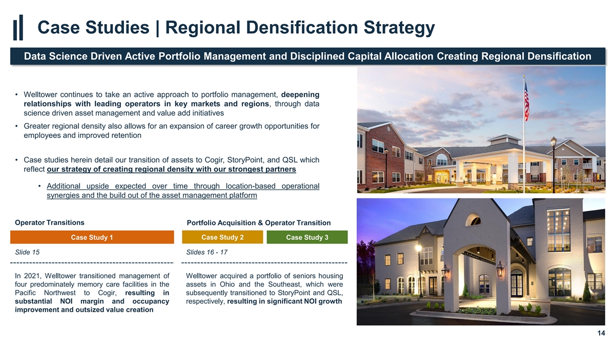 Case Studies | Regional Densification Strategy Data Science Driven Active Portfolio Management and Disciplined Capital Allocation Creating Regional Densification • Welltower continues to take an active approach to portfolio management, deepening relationships with leading operators in key markets and regions, through data science driven asset management and value add initiatives • Greater regional density also allows for an expansion of career growth opportunities for employees and improved retention • Case studies herein detail our transition of assets to Cogir, StoryPoint, and QSL which reflect our strategy of creating regional density with our strongest partners • Additional upside expected over time through location-based operational synergies and the build out of the asset management platform Operator Transitions Portfolio Acquisition & Operator Transition Case Study 1 Case Study 2 Case Study 3 Slide 15 Slides 16 - 17 In 2021, Welltower transitioned management of Welltower acquired a portfolio of seniors housing four predominately memory care facilities in the assets in Ohio and the Southeast, which were Pacific Northwest to Cogir, resulting in subsequently transitioned to StoryPoint and QSL, substantial NOI margin and occupancy respectively, resulting in significant NOI growth improvement and outsized value creation 14