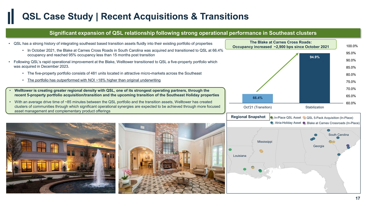 StoryPoint Case Study | Danbury Portfolio Acquisition & Transition Acquisition of 19 assets and concurrent transition to StoryPoint has resulted in material occupancy and NOI improvement Regional Snapshot • In mid-2022, Welltower acquired the Danbury portfolio (“Danbury”) of 19 communities consisting of ~2,000 units, which were transitioned to StoryPoint Senior Living concurrent with closing • StoryPoint was selected to operate Danbury due to its track record of success in operating properties in high-end Midwest micro- markets and integrating consumer-focused brands onto its management platform • In its most recent reporting period, Danbury attained 85.4% occupancy and 23.6% NOI margin which was ~1,300 bps and ~1,800 bps higher, respectively, than its pre-transition period metrics • StoryPoint attributed the improved performance to strong execution by its transition team in integrating the assets into its Cleveland MSA broader portfolio and the significant operational synergies achieved due to the proximity of the Danbury portfolio to its existing managed assets in the region Ohio The post-acquisition transition of the portfolio to StoryPoint has resulted in greater micromarket density, more efficient asset management, expense synergies, and ultimately incremental value for WELL Columbus MSA (1) (1) April 2024 T-3 Occupancy is now ~1,300 bps April 2024 T-3 NOI Margin is now ~1,800 higher than its pre-transition occupancy bps higher than its pre-transition margin 23.6% Cincinnati MSA 85.4% 72.7% 5.1% Acquired Portfolio Existing StoryPoint Asset Atria-Holiday Asset Aug'22 (Transition) Apr'24 Aug'22 (Transition) Apr'24 16 1. T-3 NOI margin and occupancy represent the average of the trailing three months’ operating results
