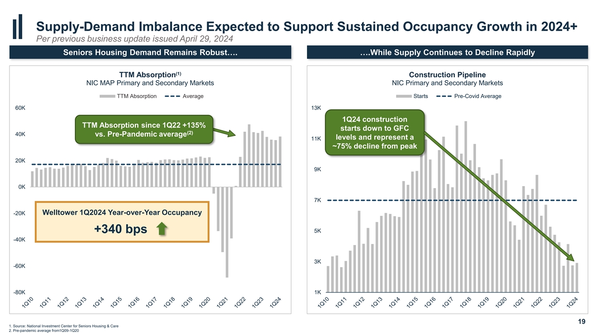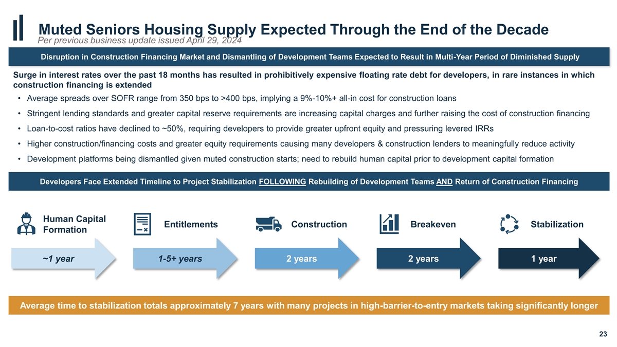 Muted Seniors Housing Supply Expected Through the End of the Decade Per previous business update issued April 29, 2024 Disruption in Construction Financing Market and Dismantling of Development Teams Expected to Result in Multi-Year Period of Diminished Supply Surge in interest rates over the past 18 months has resulted in prohibitively expensive floating rate debt for developers, in rare instances in which construction financing is extended • Average spreads over SOFR range from 350 bps to >400 bps, implying a 9%-10%+ all-in cost for construction loans • Stringent lending standards and greater capital reserve requirements are increasing capital charges and further raising the cost of construction financing • Loan-to-cost ratios have declined to ~50%, requiring developers to provide greater upfront equity and pressuring levered IRRs • Higher construction/financing costs and greater equity requirements causing many developers & construction lenders to meaningfully reduce activity • Development platforms being dismantled given muted construction starts; need to rebuild human capital prior to development capital formation Developers Face Extended Timeline to Project Stabilization FOLLOWING Rebuilding of Development Teams AND Return of Construction Financing Human Capital Entitlements Construction Breakeven Stabilization Formation ~1 year 1-5+ years 2 years 2 years 1 year Average time to stabilization totals approximately 7 years with many projects in high-barrier-to-entry markets taking significantly longer 23