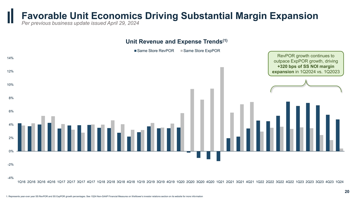 Supply-Demand Imbalance Expected to Support Sustained Occupancy Growth in 2024+ Per previous business update issued April 29, 2024 Seniors Housing Demand Remains Robust…. ….While Supply Continues to Decline Rapidly (1) TTM Absorption Construction Pipeline NIC MAP Primary and Secondary Markets NIC Primary and Secondary Markets TTM Absorption Average Starts Pre-Covid Average 60K 13K 1Q24 construction TTM Absorption since 1Q22 +135% starts down to GFC (2) 40K vs. Pre-Pandemic average levels and represent a 11K ~75% decline from peak 20K 9K 0K 7K -20K Welltower 1Q2024 Year-over-Year Occupancy 5K +340 bps -40K 3K -60K -80K 1K 19 1. Source: National Investment Center for Seniors Housing & Care 2. Pre-pandemic average from1Q09-1Q20