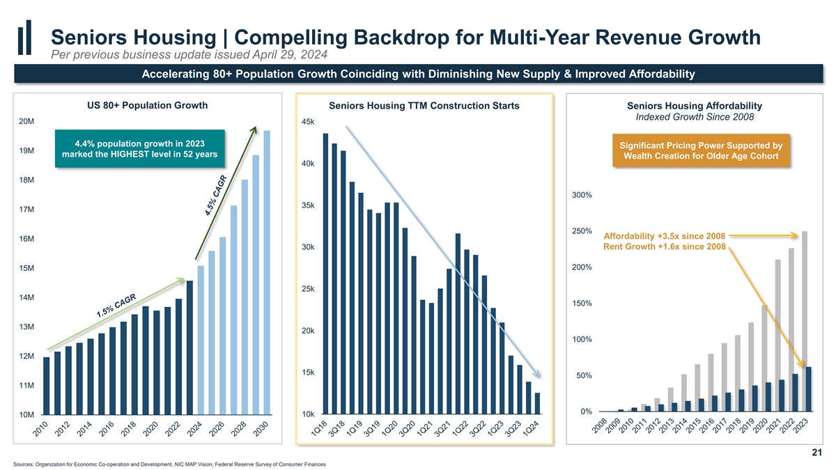Favorable Unit Economics Driving Substantial Margin Expansion Per previous business update issued April 29, 2024 (1) Unit Revenue and Expense Trends Same Store RevPOR Same Store ExpPOR RevPOR growth continues to 14% outpace ExpPOR growth, driving +320 bps of SS NOI margin 12% expansion in 1Q2024 vs. 1Q2023 10% 8% 6% 4% 2% 0% -2% -4% 1Q16 2Q16 3Q16 4Q16 1Q17 2Q17 3Q17 4Q17 1Q18 2Q18 3Q18 4Q18 1Q19 2Q19 3Q19 4Q19 1Q20 2Q20 3Q20 4Q20 1Q21 2Q21 3Q21 4Q21 1Q22 2Q22 3Q22 4Q22 1Q23 2Q23 3Q23 4Q23 1Q24 20 1. Represents year-over year SS RevPOR and SS ExpPOR growth percentages. See 1Q24 Non-GAAP Financial Measures on Welltower’s investor relations section on its website for more information
