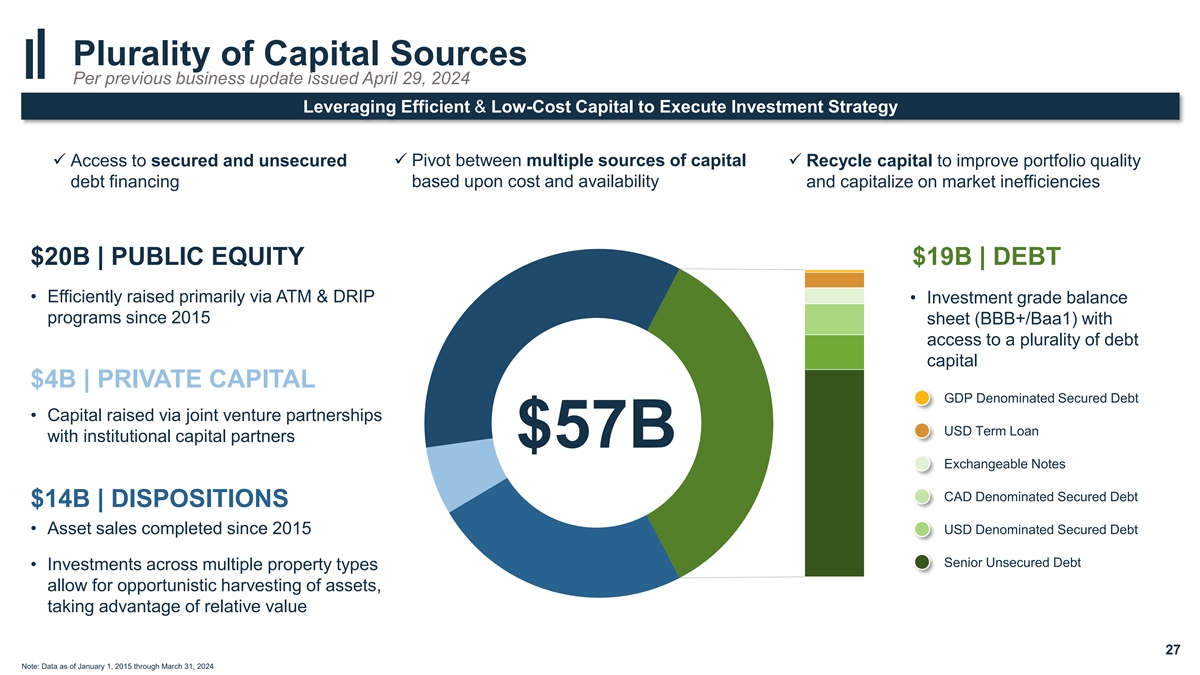 Plurality of Capital Sources Per previous business update issued April 29, 2024 Leveraging Efficient & Low-Cost Capital to Execute Investment Strategy ✓ Access to secured and unsecured ✓ Pivot between multiple sources of capital ✓ Recycle capital to improve portfolio quality debt financing based upon cost and availability and capitalize on market inefficiencies $20B | PUBLIC EQUITY $19B | DEBT • Efficiently raised primarily via ATM & DRIP • Investment grade balance programs since 2015 sheet (BBB+/Baa1) with access to a plurality of debt capital $4B | PRIVATE CAPITAL GDP Denominated Secured Debt • Capital raised via joint venture partnerships USD Term Loan with institutional capital partners $57B Exchangeable Notes CAD Denominated Secured Debt $14B | DISPOSITIONS USD Denominated Secured Debt • Asset sales completed since 2015 Senior Unsecured Debt • Investments across multiple property types allow for opportunistic harvesting of assets, taking advantage of relative value 27 Note: Data as of January 1, 2015 through March 31, 2024