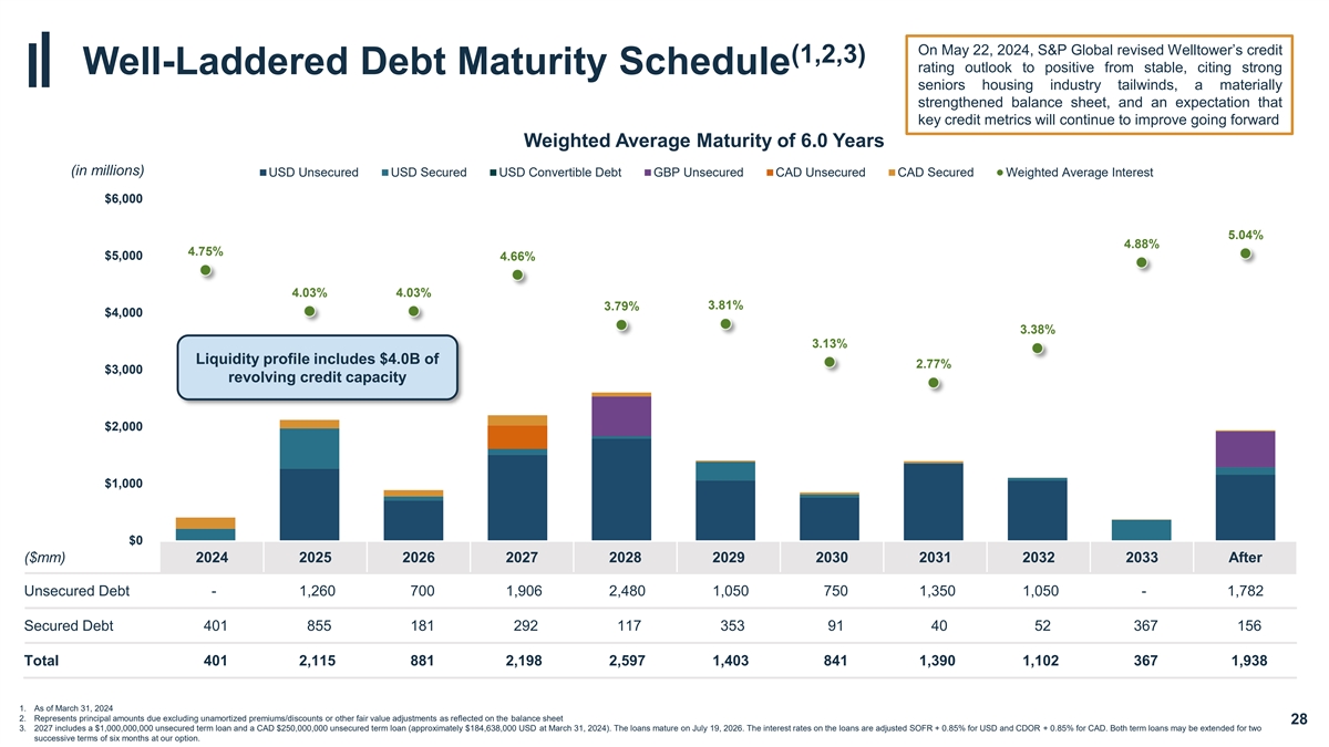 On May 22, 2024, S&P Global revised Welltower’s credit (1,2,3) rating outlook to positive from stable, citing strong Well-Laddered Debt Maturity Schedule seniors housing industry tailwinds, a materially strengthened balance sheet, and an expectation that key credit metrics will continue to improve going forward Weighted Average Maturity of 6.0 Years (in millions) USD Unsecured USD Secured USD Convertible Debt GBP Unsecured CAD Unsecured CAD Secured Weighted Average Interest $6,000 5.04% 4.88% 4.75% $5,000 4.66% 4.03% 4.03% 3.81% 3.79% $4,000 3.38% 3.13% Liquidity profile includes $4.0B of 2.77% $3,000 revolving credit capacity $2,000 $1,000 $0 2024 2025 2026 2027 2028 2029 2030 2031 2032 2033 Thereafter ($mm) 2024 2025 2026 2027 2028 2029 2030 2031 2032 2033 After Unsecured Debt - 1,260 700 1,906 2,480 1,050 750 1,350 1,050 - 1,782 Secured Debt 401 855 181 292 117 353 91 40 52 367 156 Total 401 2,115 881 2,198 2,597 1,403 841 1,390 1,102 367 1,938 1. As of March 31, 2024 2. Represents principal amounts due excluding unamortized premiums/discounts or other fair value adjustments as reflected on the balance sheet 28 3. 2027 includes a $1,000,000,000 unsecured term loan and a CAD $250,000,000 unsecured term loan (approximately $184,638,000 USD at March 31, 2024). The loans mature on July 19, 2026. The interest rates on the loans are adjusted SOFR + 0.85% for USD and CDOR + 0.85% for CAD. Both term loans may be extended for two successive terms of six months at our option.