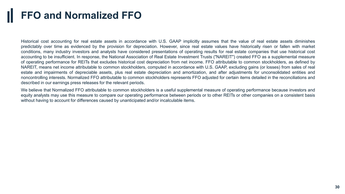 FFO and Normalized FFO Historical cost accounting for real estate assets in accordance with U.S. GAAP implicitly assumes that the value of real estate assets diminishes predictably over time as evidenced by the provision for depreciation. However, since real estate values have historically risen or fallen with market conditions, many industry investors and analysts have considered presentations of operating results for real estate companies that use historical cost accounting to be insufficient. In response, the National Association of Real Estate Investment Trusts ( NAREIT ) created FFO as a supplemental measure of operating performance for REITs that excludes historical cost depreciation from net income. FFO attributable to common stockholders, as defined by NAREIT, means net income attributable to common stockholders, computed in accordance with U.S. GAAP, excluding gains (or losses) from sales of real estate and impairments of depreciable assets, plus real estate depreciation and amortization, and after adjustments for unconsolidated entities and noncontrolling interests. Normalized FFO attributable to common stockholders represents FFO adjusted for certain items detailed in the reconciliations and described in our earnings press releases for the relevant periods. We believe that Normalized FFO attributable to common stockholders is a useful supplemental measure of operating performance because investors and equity analysts may use this measure to compare our operating performance between periods or to other REITs or other companies on a consistent basis without having to account for differences caused by unanticipated and/or incalculable items. 30