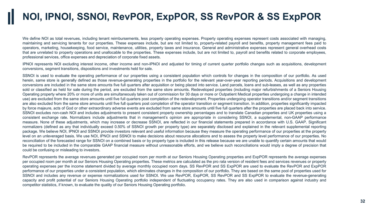 NOI, IPNOI, SSNOI, RevPOR, ExpPOR, SS RevPOR & SS ExpPOR We define NOI as total revenues, including tenant reimbursements, less property operating expenses. Property operating expenses represent costs associated with managing, maintaining and servicing tenants for our properties. These expenses include, but are not limited to, property-related payroll and benefits, property management fees paid to operators, marketing, housekeeping, food service, maintenance, utilities, property taxes and insurance. General and administrative expenses represent general overhead costs that are unrelated to property operations and unallocable to the properties. These expenses include, but are not limited to, payroll and benefits related to corporate employees, professional services, office expenses and depreciation of corporate fixed assets. IPNOI represents NOI excluding interest income, other income and non-IPNOI and adjusted for timing of current quarter portfolio changes such as acquisitions, development conversions, segment transitions, dispositions and investments held for sale. SSNOI is used to evaluate the operating performance of our properties using a consistent population which controls for changes in the composition of our portfolio. As used herein, same store is generally defined as those revenue-generating properties in the portfolio for the relevant year-over-year reporting periods. Acquisitions and development conversions are included in the same store amounts five full quarters after acquisition or being placed into service. Land parcels, loans and sub-leases, as well as any properties sold or classified as held for sale during the period, are excluded from the same store amounts. Redeveloped properties (including major refurbishments of a Seniors Housing Operating property where 20% or more of units are simultaneously taken out of commission for 30 days or more or Outpatient Medical properties undergoing a change in intended use) are excluded from the same store amounts until five full quarters post completion of the redevelopment. Properties undergoing operator transitions and/or segment transitions are also excluded from the same store amounts until five full quarters post completion of the operator transition or segment transition. In addition, properties significantly impacted by force majeure, acts of God or other extraordinary adverse events are excluded from same store amounts until five full quarters after the properties are placed back into service. SSNOI excludes non-cash NOI and includes adjustments to present consistent property ownership percentages and to translate Canadian properties and UK properties using a consistent exchange rate. Normalizers include adjustments that in management’s opinion are appropriate in considering SSNOI, a supplemental, non-GAAP performance measure. None of these adjustments, which may increase or decrease SSNOI, are reflected in our financial statements prepared in accordance with U.S. GAAP. Significant normalizers (defined as any that individually exceed 0.50% of SSNOI growth per property type) are separately disclosed and explained in the relevant supplemental reporting package. We believe NOI, IPNOI and SSNOI provide investors relevant and useful information because they measure the operating performance of our properties at the property level on an unleveraged basis. We use NOI, IPNOI and SSNOI to make decisions about resource allocations and to assess the property level performance of our properties. No reconciliation of the forecasted range for SSNOI on a combined basis or by property type is included in this release because we are unable to quantify certain amounts that would be required to be included in the comparable GAAP financial measure without unreasonable efforts, and we believe such reconciliations would imply a degree of precision that could be confusing or misleading to investors. RevPOR represents the average revenues generated per occupied room per month at our Seniors Housing Operating properties and ExpPOR represents the average expenses per occupied room per month at our Seniors Housing Operating properties. These metrics are calculated as the pro rata version of resident fees and services revenues or property operating expenses per the income statement divided by average monthly occupied room days. SS RevPOR and SS ExpPOR are used to evaluate the RevPOR and ExpPOR performance of our properties under a consistent population, which eliminates changes in the composition of our portfolio. They are based on the same pool of properties used for SSNOI and includes any revenue or expense normalizations used for SSNOI. We use RevPOR, ExpPOR, SS RevPOR and SS ExpPOR to evaluate the revenue-generating capacity and profit potential of our Seniors Housing Operating portfolio independent of fluctuating occupancy rates. They are also used in comparison against industry and competitor statistics, if known, to evaluate the quality of our Seniors Housing Operating portfolio. 32