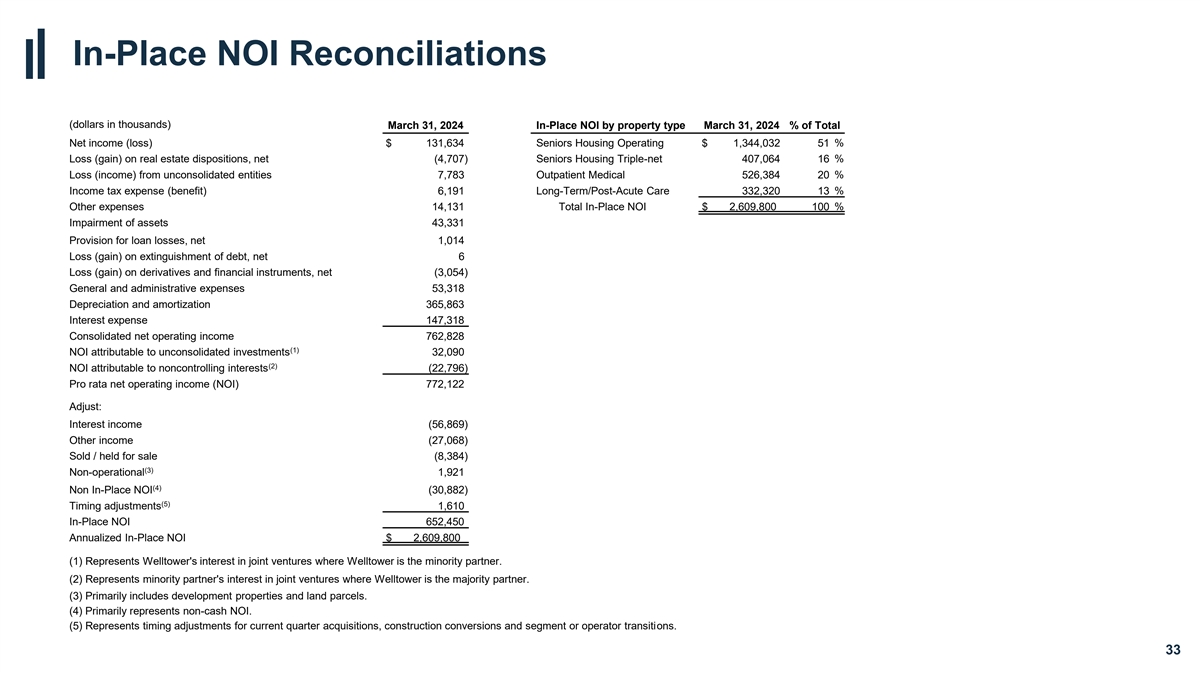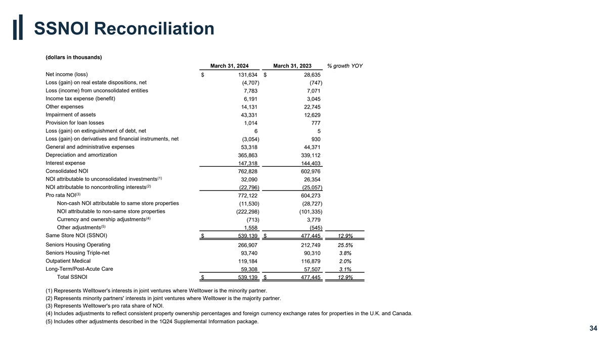 SSNOI Reconciliation (dollars in thousands) March 31, 2024 March 31, 2023 % growth YOY Net income (loss) $ 131,634 $ 28,635 Loss (gain) on real estate dispositions, net (4,707) (747) Loss (income) from unconsolidated entities 7,783 7,071 Income tax expense (benefit) 6,191 3,045 Other expenses 14,131 22,745 Impairment of assets 43,331 12,629 Provision for loan losses 1,014 777 Loss (gain) on extinguishment of debt, net 6 5 Loss (gain) on derivatives and financial instruments, net (3,054) 930 General and administrative expenses 53,318 44,371 Depreciation and amortization 365,863 339,112 Interest expense 147,318 144,403 Consolidated NOI 762,828 602,976 (1) NOI attributable to unconsolidated investments 32,090 26,354 (2) NOI attributable to noncontrolling interests (22,796) (25,057) (3) Pro rata NOI 772,122 604,273 Non-cash NOI attributable to same store properties (11,530) (28,727) NOI attributable to non-same store properties (222,298) (101,335) (4) Currency and ownership adjustments (713) 3,779 (5) Other adjustments 1,558 (545) Same Store NOI (SSNOI) $ 539,139 $ 477,445 12.9% Seniors Housing Operating 266,907 212,749 25.5% Seniors Housing Triple-net 93,740 90,310 3.8% Outpatient Medical 119,184 116,879 2.0% Long-Term/Post-Acute Care 59,308 57,507 3.1% Total SSNOI $ 539,139 $ 477,445 12.9% (1) Represents Welltower's interests in joint ventures where Welltower is the minority partner. (2) Represents minority partners' interests in joint ventures where Welltower is the majority partner. (3) Represents Welltower's pro rata share of NOI. (4) Includes adjustments to reflect consistent property ownership percentages and foreign currency exchange rates for properties in the U.K. and Canada. (5) Includes other adjustments described in the 1Q24 Supplemental Information package. 34