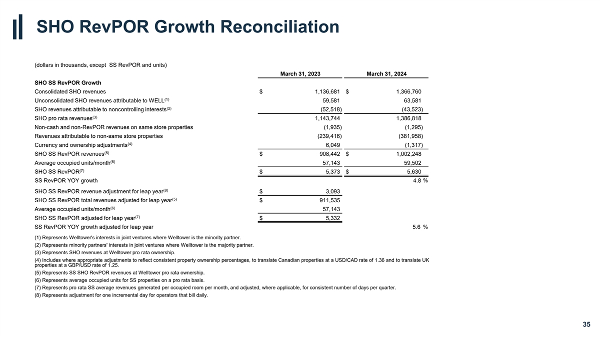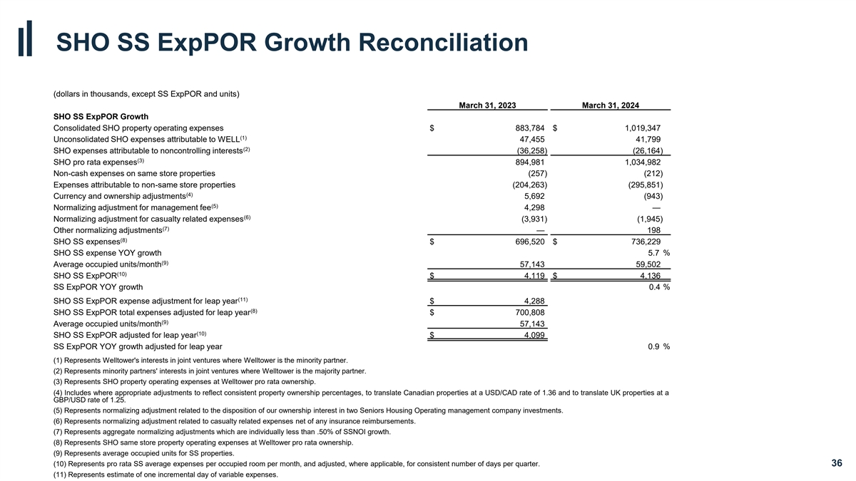 SHO RevPOR Growth Reconciliation (dollars in thousands, except SS RevPOR and units) March 31, 2023 March 31, 2024 SHO SS RevPOR Growth Consolidated SHO revenues $ 1,136,681 $ 1,366,760 (1) Unconsolidated SHO revenues attributable to WELL 59,581 63,581 (2) SHO revenues attributable to noncontrolling interests (52,518) (43,523) (3) SHO pro rata revenues 1,143,744 1,386,818 Non-cash and non-RevPOR revenues on same store properties (1,935) (1,295) Revenues attributable to non-same store properties (239,416) (381,958) (4) Currency and ownership adjustments 6,049 (1,317) (5) SHO SS RevPOR revenues $ 908,442 $ 1,002,248 (6) Average occupied units/month 57,143 59,502 (7) SHO SS RevPOR $ 5,373 $ 5,630 SS RevPOR YOY growth — 4.8 % (8) SHO SS RevPOR revenue adjustment for leap year $ 3,093 (5) SHO SS RevPOR total revenues adjusted for leap year $ 911,535 (6) Average occupied units/month 57,143 (7) SHO SS RevPOR adjusted for leap year $ 5,332 SS RevPOR YOY growth adjusted for leap year 5.6 % (1) Represents Welltower's interests in joint ventures where Welltower is the minority partner. (2) Represents minority partners' interests in joint ventures where Welltower is the majority partner. (3) Represents SHO revenues at Welltower pro rata ownership. (4) Includes where appropriate adjustments to reflect consistent property ownership percentages, to translate Canadian properties at a USD/CAD rate of 1.36 and to translate UK properties at a GBP/USD rate of 1.25. (5) Represents SS SHO RevPOR revenues at Welltower pro rata ownership. (6) Represents average occupied units for SS properties on a pro rata basis. (7) Represents pro rata SS average revenues generated per occupied room per month, and adjusted, where applicable, for consistent number of days per quarter. (8) Represents adjustment for one incremental day for operators that bill daily. 35