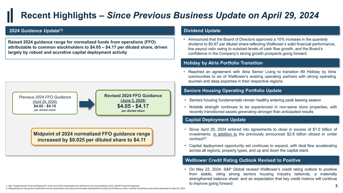 Forward Looking Statements and Risk Factors This document contains “forward-looking statements” as defined in the Private Securities Litigation Reform Act of 1995. When Welltower uses words such as “may,” “will,” “intend,” “should,” “believe,” “expect,” “anticipate,” “project,” “pro forma,” “estimate” or similar expressions that do not relate solely to historical matters, Welltower is making forward-looking statements. Forward-looking statements are not guarantees of future performance and involve risks and uncertainties that may cause Welltower’s actual results to differ materially from Welltower’s expectations discussed in the forward-looking statements. This may be a result of various factors, including, but not limited to: the status of the economy; the status of capital markets, including availability and cost of capital; issues facing the health care industry, including compliance with, and changes to, regulations and payment policies, responding to government investigations and punitive settlements and operators’/tenants’ difficulty in cost effectively obtaining and maintaining adequate liability and other insurance; changes in financing terms; competition within the health care and seniors housing industries; negative developments in the operating results or financial condition of operators/tenants, including, but not limited to, their ability to pay rent and repay loans; Welltower’s ability to transition or sell properties with profitable results; the failure to make new investments or acquisitions as and when anticipated; natural disasters, health emergencies (such as the COVID-19 pandemic) and other acts of God affecting Welltower’s properties; Welltower’s ability to re-lease space at similar rates as vacancies occur; Welltower’s ability to timely reinvest sale proceeds at similar rates to assets sold; operator/tenant or joint venture partner bankruptcies or insolvencies; the cooperation of joint venture partners; government regulations affecting Medicare and Medicaid reimbursement rates and operational requirements; liability or contract claims by or against operators/tenants; unanticipated difficulties and/or expenditures relating to future investments or acquisitions; environmental laws affecting Welltower’s properties; changes in rules or practices governing Welltower’s financial reporting; the movement of U.S. and foreign currency exchange rates; Welltower’s ability to maintain its qualification as a REIT; key management personnel recruitment and retention; and other risks described in Welltower’s reports filed from time to time with the SEC. Welltower undertakes no obligation to update or revise publicly any forward-looking statements, whether because of new information, future events or otherwise, or to update the reasons why actual results could differ from those projected in any forward-looking statements. 2