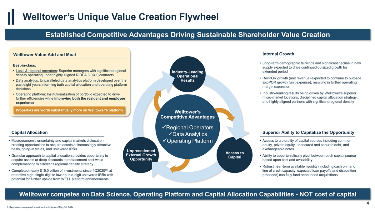 Recent Highlights – Since Previous Business Update on April 29, 2024 (1) Dividend Update 2024 Guidance Update • Announced that the Board of Directors approved a 10% increase in the quarterly Raised 2024 guidance range for normalized funds from operations (FFO) dividend to $0.67 per diluted share reflecting Welltower’s solid financial performance, attributable to common stockholders to $4.05 – $4.17 per diluted share, driven low payout ratio owing to outsized levels of cash flow growth, and the Board’s largely by robust and accretive capital deployment activity confidence in the Company’s strong growth prospects going forward Holiday by Atria Portfolio Transition • Reached an agreement with Atria Senior Living to transition 89 Holiday by Atria communities to six of Welltower’s existing operating partners with strong operating acumen and deep expertise in their respective regions • Seniors Housing Operating Portfolio Update Revised 2024 FFO Guidance Previous 2024 FFO Guidance • Seniors housing fundamentals remain healthy entering peak leasing season (June 3, 2024) (April 29, 2024) $4.02 - $4.15 $4.05 - $4.17 • Notable strength continues to be experienced in non-same store properties, with per diluted share per diluted share recently transitioned assets generating stronger than anticipated results Capital Deployment Update • Since April 29, 2024 entered into agreements to close in excess of $1.0 billion of Midpoint of 2024 normalized FFO guidance range investments, in addition to the previously announced $2.8 billion closed or under (2) contract increased by $0.025 per diluted share to $4.11 • Capital deployment opportunity set continues to expand, with deal flow accelerating across all regions, property types, and up and down the capital stack Welltower Credit Rating Outlook Revised to Positive • On May 22, 2024, S&P Global revised Welltower’s credit rating outlook to positive from stable, citing strong seniors housing industry tailwinds, a materially strengthened balance sheet, and an expectation that key credit metrics will continue to improve going forward 1. See “Supplemental Financial Measures” at the end of this presentation for definitions and reconciliations of non-GAAP financial measures 3 2. Represents pro rata gross investments across acquisitions and loans and excludes development funding; $2.8 billion of under contract investments previously disclosed on April 29, 2024