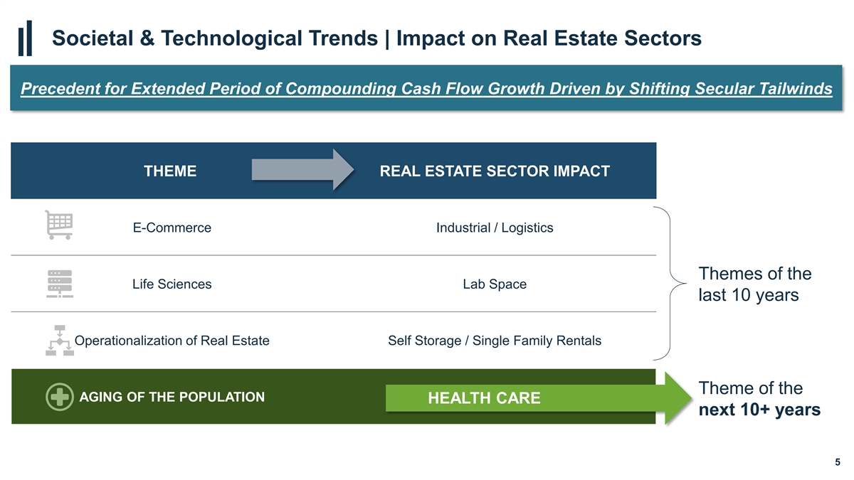 Societal & Technological Trends | Impact on Real Estate Sectors Precedent for Extended Period of Compounding Cash Flow Growth Driven by Shifting Secular Tailwinds THEME REAL ESTATE SECTOR IMPACT E-Commerce Industrial / Logistics Themes of the Life Sciences Lab Space last 10 years Operationalization of Real Estate Self Storage / Single Family Rentals Theme of the AGING OF THE POPULATION HEALTH CARE next 10+ years 5