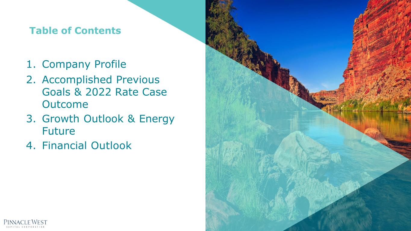 1. Company Profile 2. Accomplished Previous Goals & 2022 Rate Case Outcome 3. Growth Outlook & Energy Future 4. Financial Outlook Table of Contents