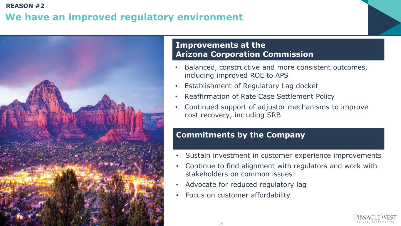• Balanced, constructive and more consistent outcomes, including improved ROE to APS • Establishment of Regulatory Lag docket • Reaffirmation of Rate Case Settlement Policy • Continued support of adjustor mechanisms to improve cost recovery, including SRB 14 Commitments by the Company • Sustain investment in customer experience improvements • Continue to find alignment with regulators and work with stakeholders on common issues • Advocate for reduced regulatory lag • Focus on customer affordability Improvements at the Arizona Corporation Commission We have an improved regulatory environment REASON #2