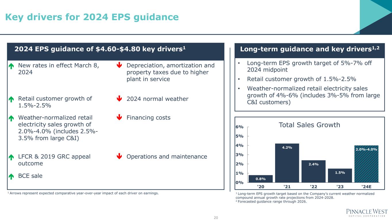$0.48 Weather 2024 vs 2023 Operating Revenue less Fuel and Purchased Power Net Effect of 2022 GRC $ 1.33 Retail Sales Growth $ 0.26 LFCR/2019 GRC appeal outcome $ 0.11 RES/DSM/PSA (Chemicals) $ 0.08 Other $ 0.02 Transmission $ (0.05) Weather $ (0.48) All other BCE Sale $ 0.10 Pension & OPEB non-service credits, net $ 0.01 Other, net $ (0.04) Miscellaneous & rounding $ (0.04) $1.27 Operating Revenue less Fuel and Purchased Power1 $(0.14) O&M1 $(0.47) D&A $(0.08) Other taxes $(0.32) Interest, net AFUDC $0.03 All other 2023 2024 (midpoint) $4.70 $4.41 1 Includes costs and offsetting operating revenues associated with renewable energy and demand side management programs, see slide 41 for more information. 19 2024 EPS Guidance of $4.60 - $4.80